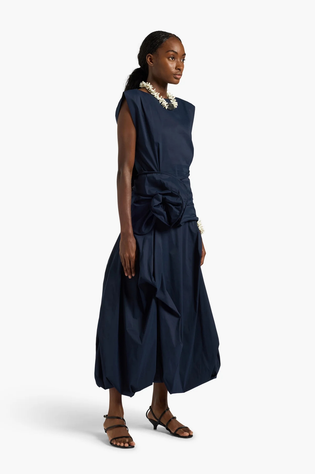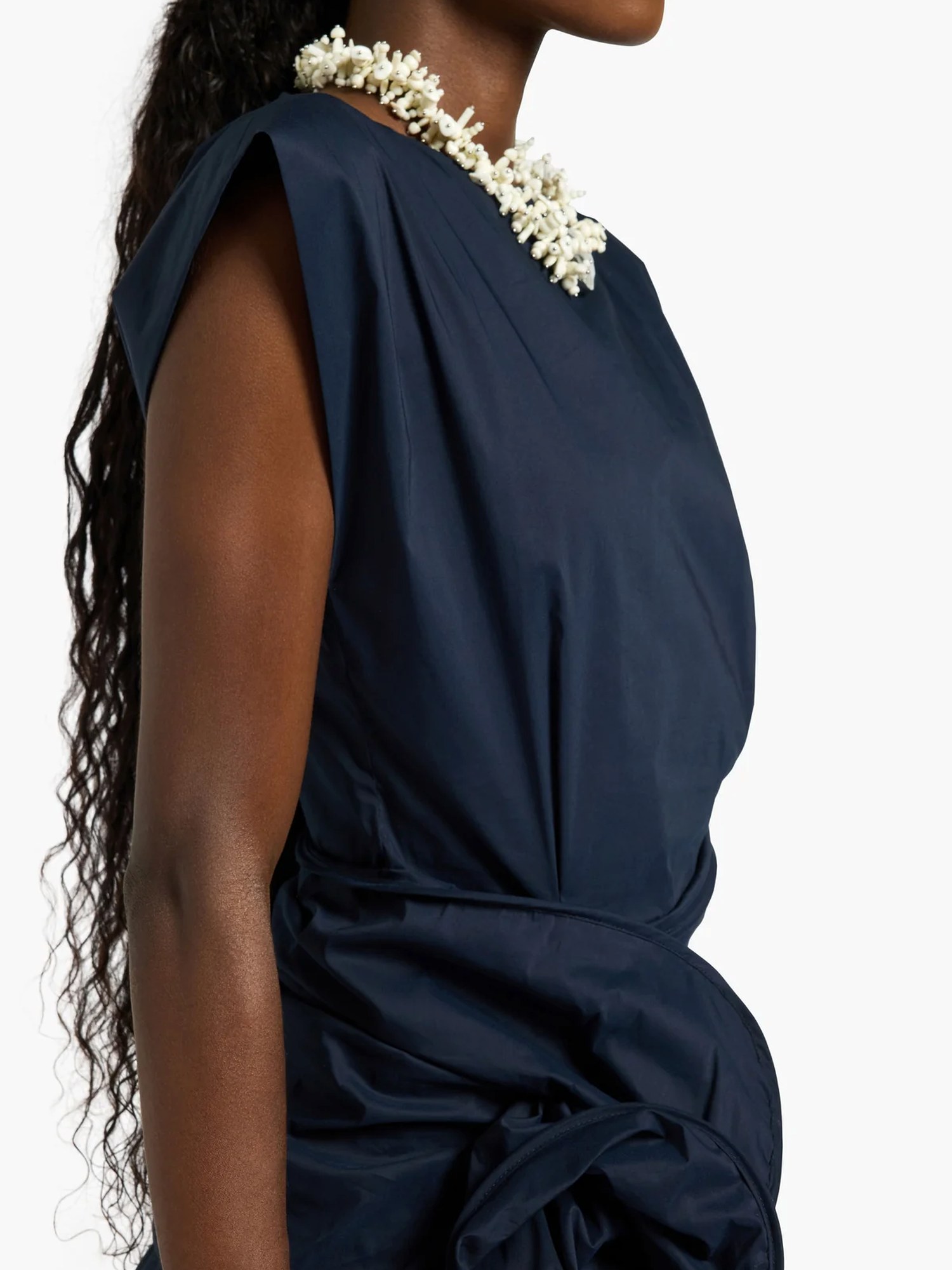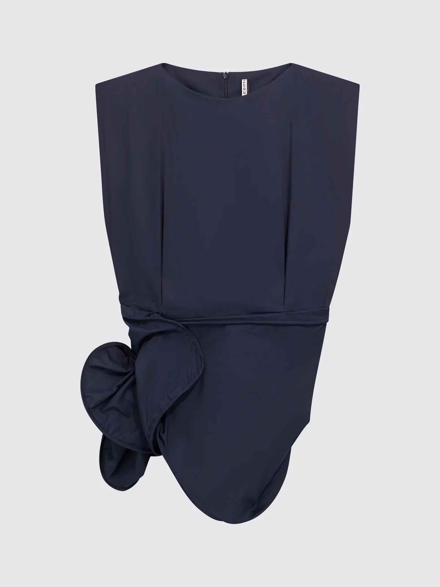 Top con rouche piazzata in popeline stretch, scollo a barchetta con accenno di manica ad aletta, fascione con applicazione.
