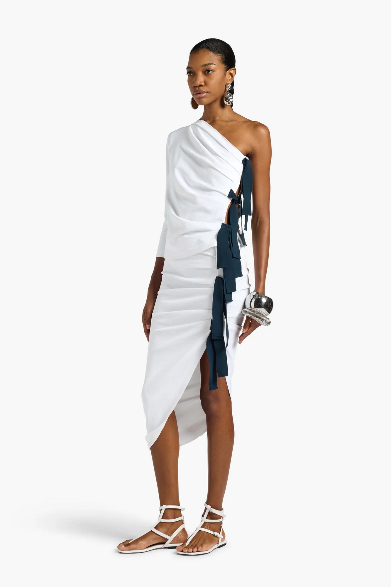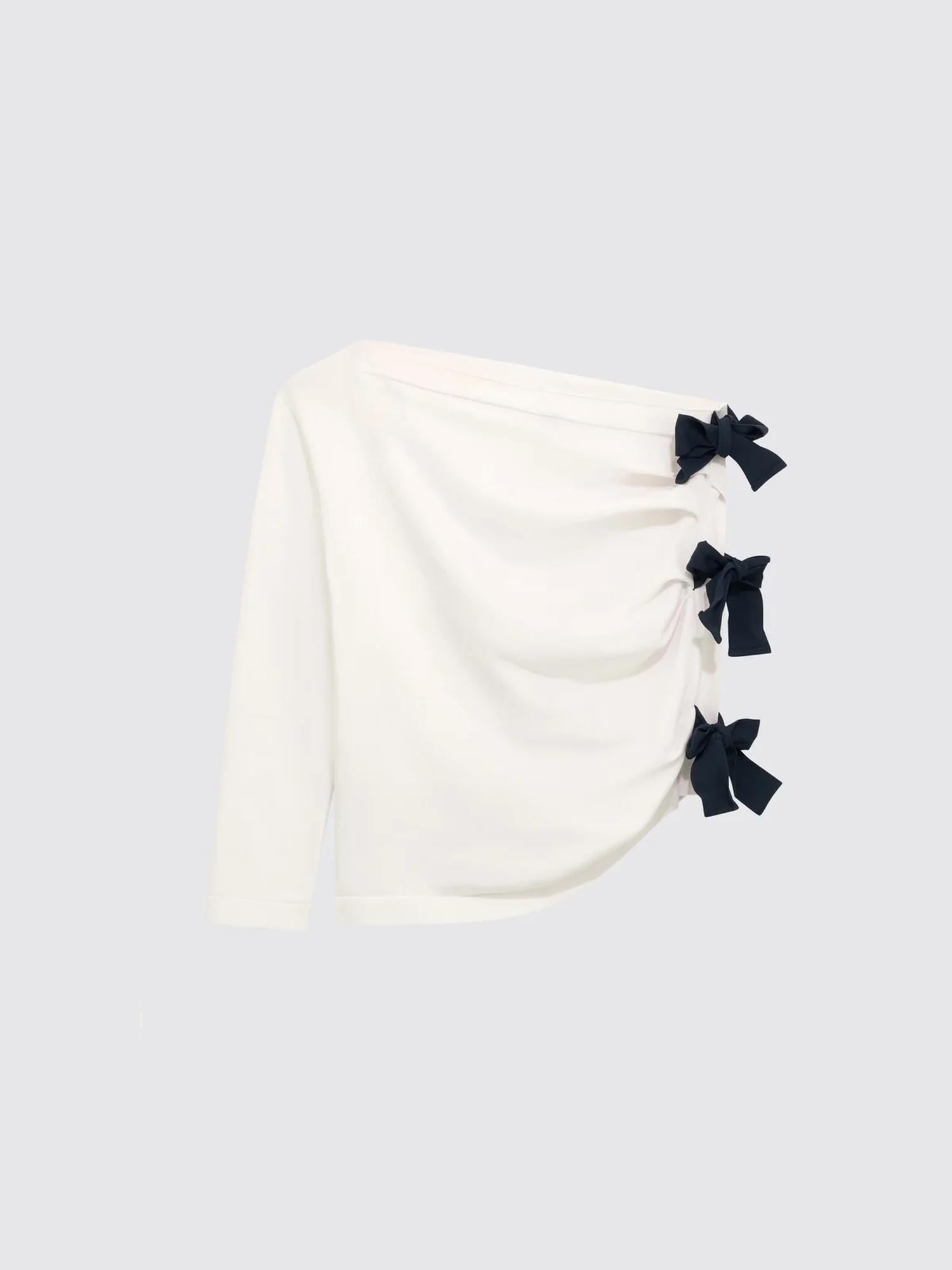 Top monospalla in vicosa stretch con laccetti regolabili laterali a sx e manica lunga a dx.