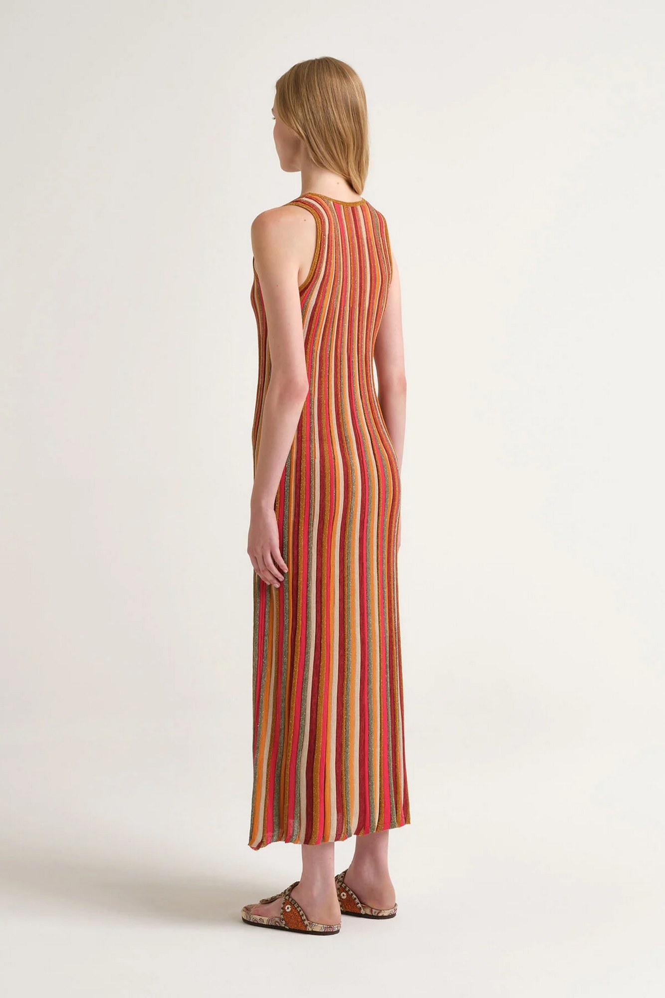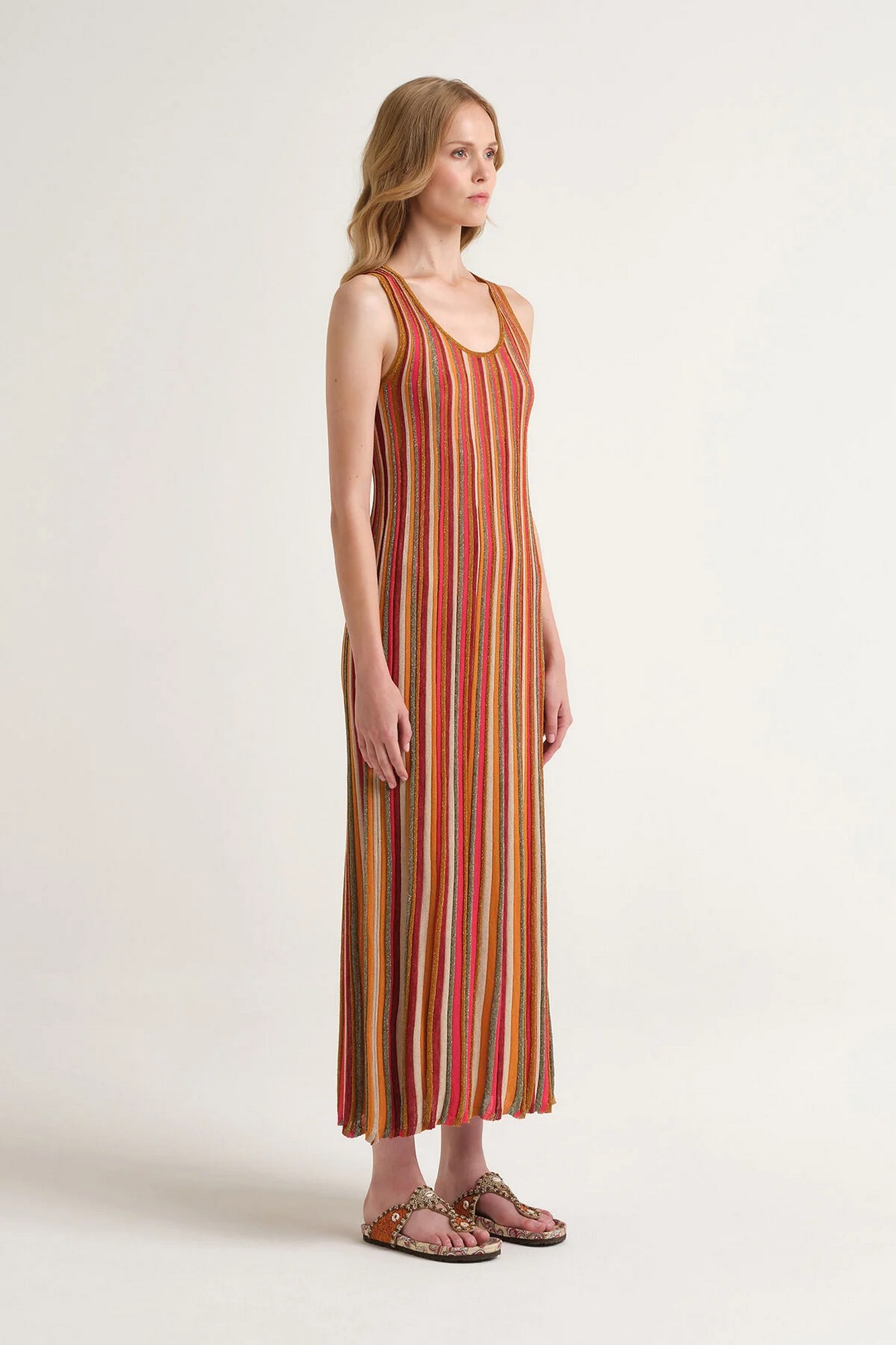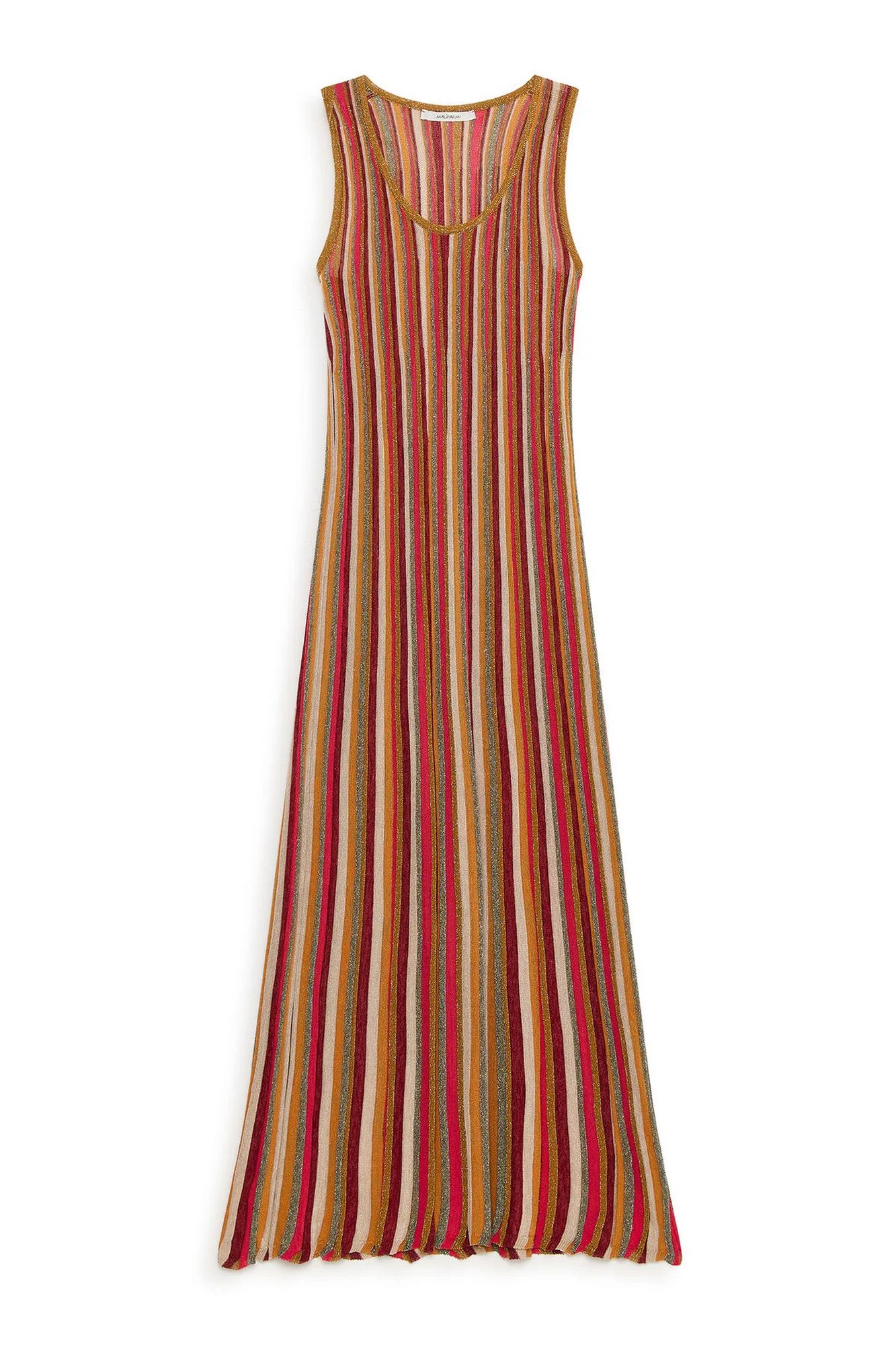 Abito lungo lavorato con fili con inserti di lurex.
