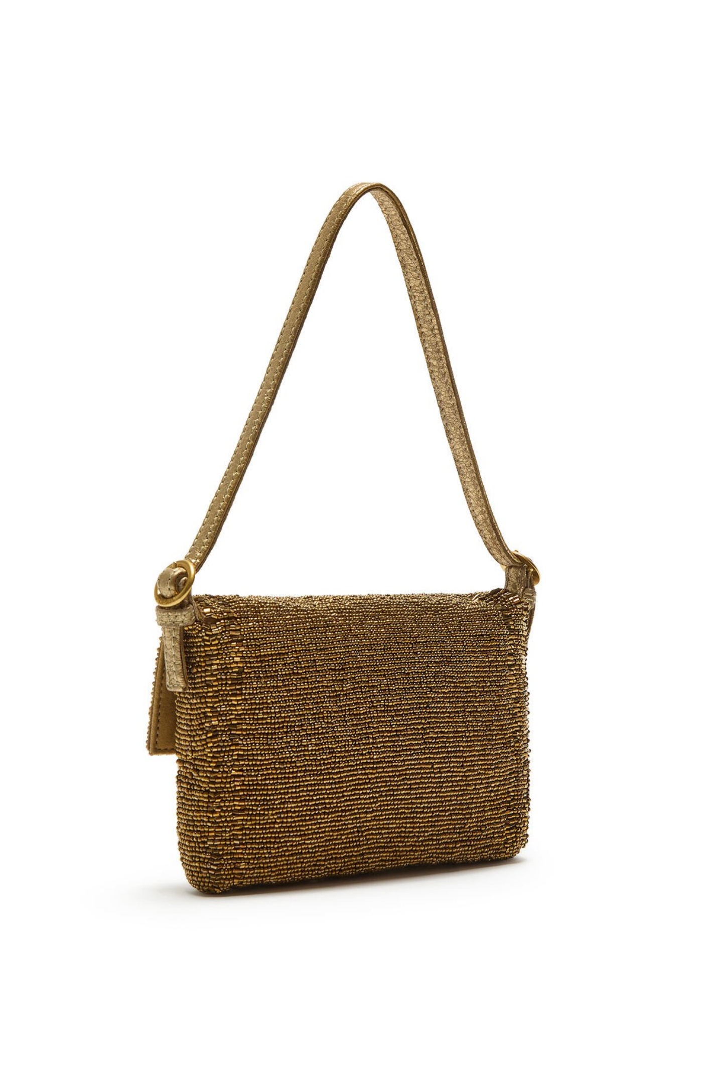 Baguette bag ricamata a mano con cuts e perline, chiusura impreziosita da pietre e resine, foderata in cotone bi-color e nome del brand sulle fibbie di regolazione della tracollina.