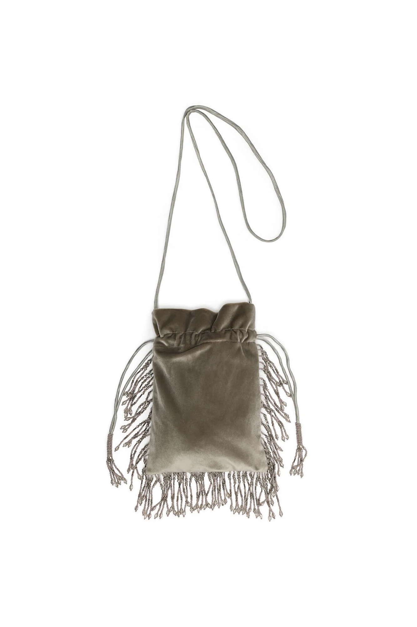Borsa ricamata a mano in velluto impreziosita da frange di perline.