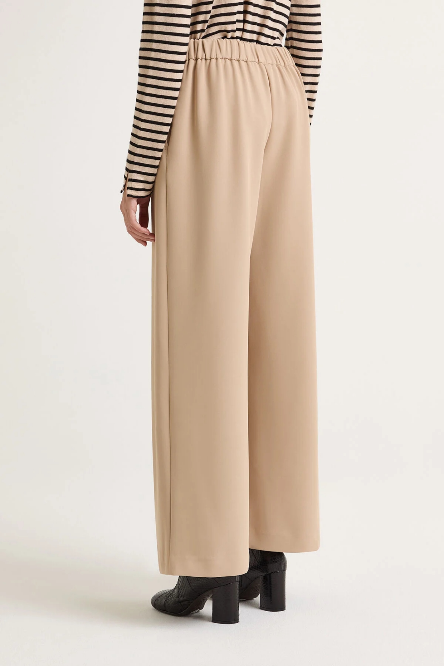 Pantalone in cady unito con linea dritta, vita elasticata solo sul retro e tasche invisibili cucite davanti.