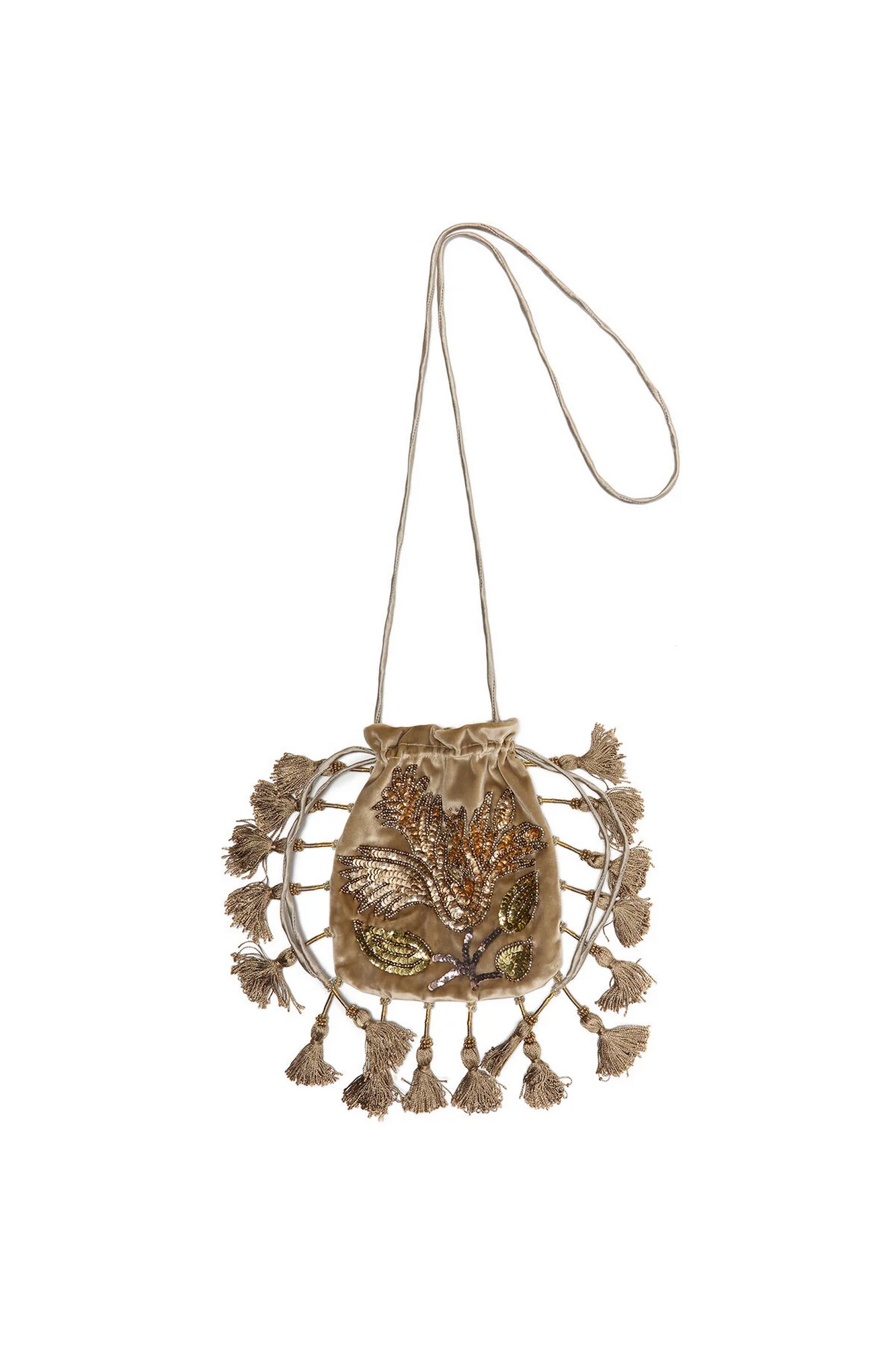 Pouch ricamata a mano con perline e paillettes in velluto.