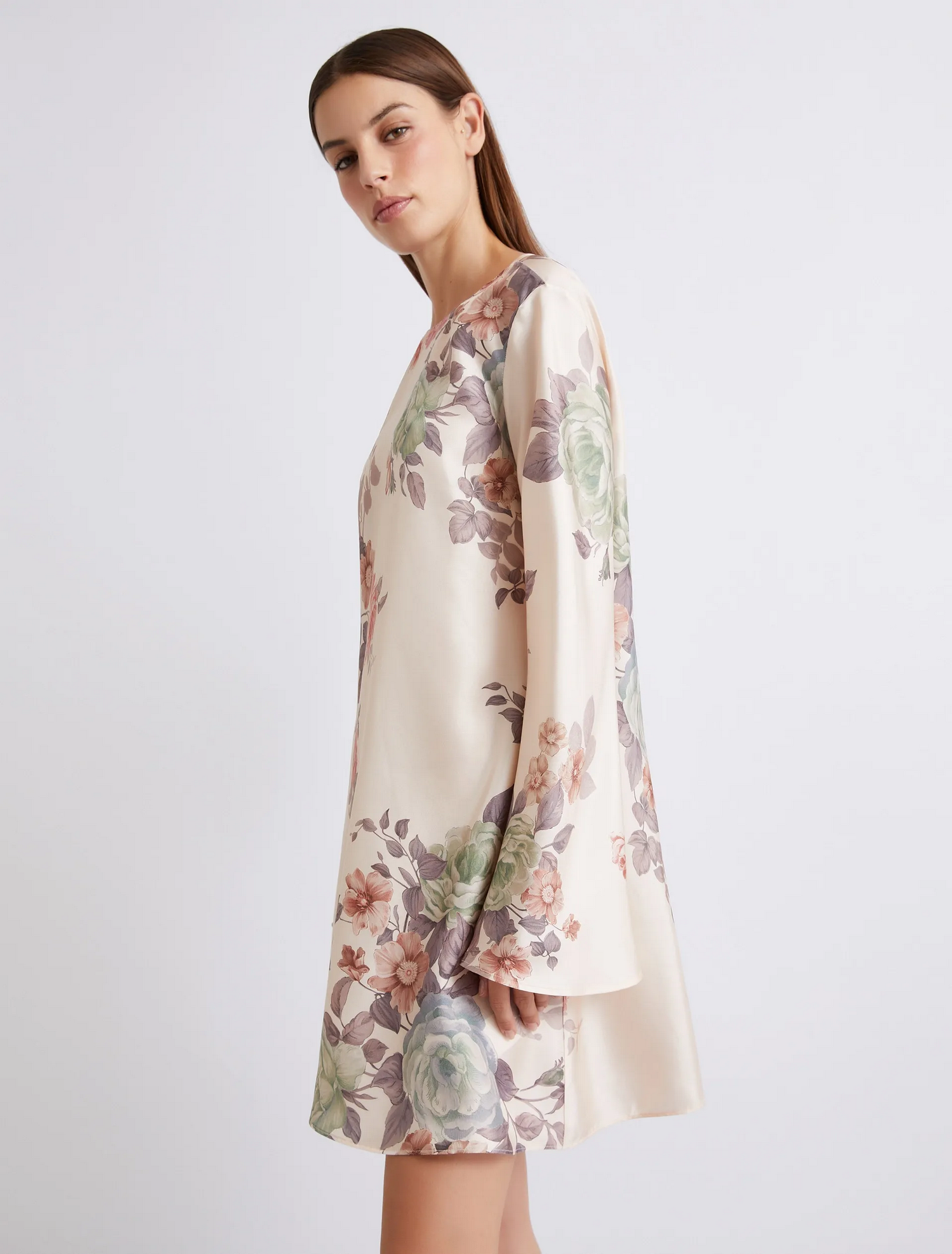 Abito in twill di seta stampata con scollo stondato sul davanti e a V sul retro, maniche lunghe con linea a campana e fasce lungo lo scollo posteriore che formano un nastro.