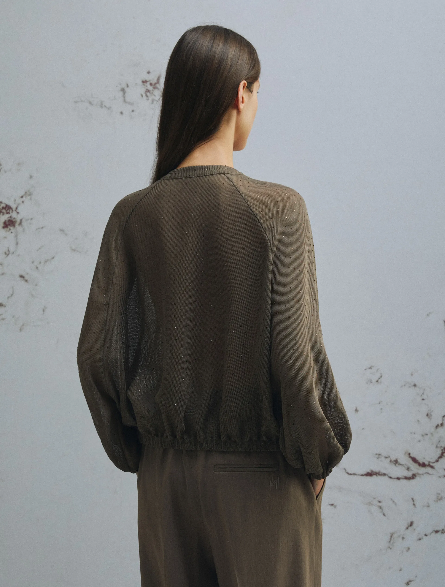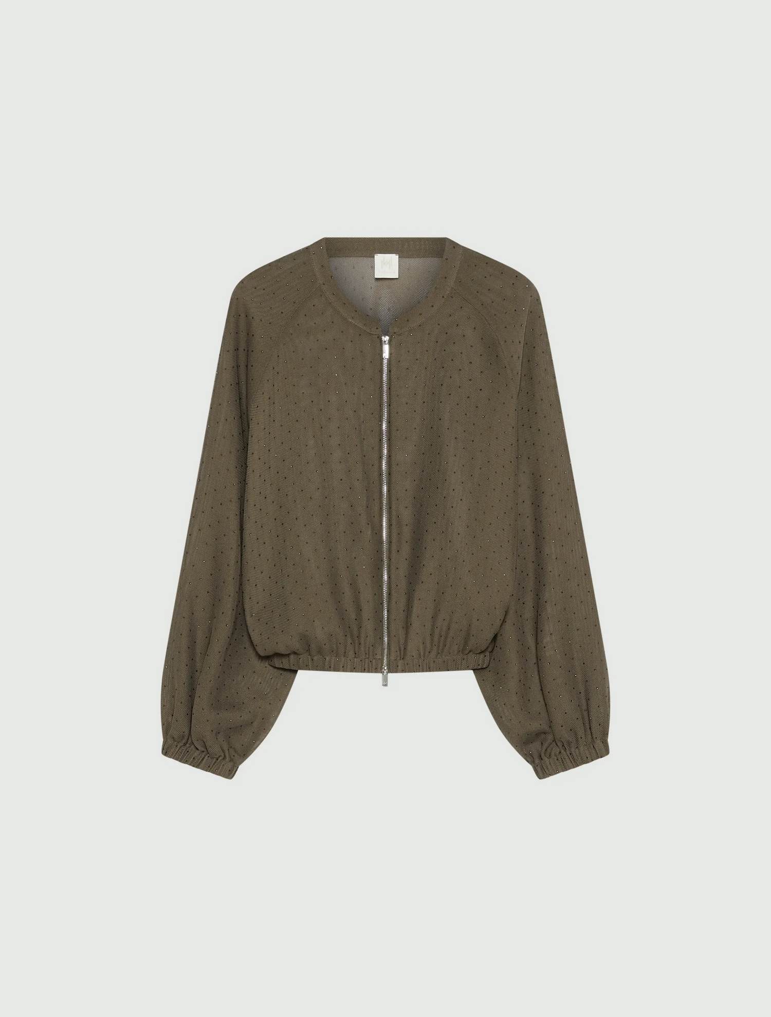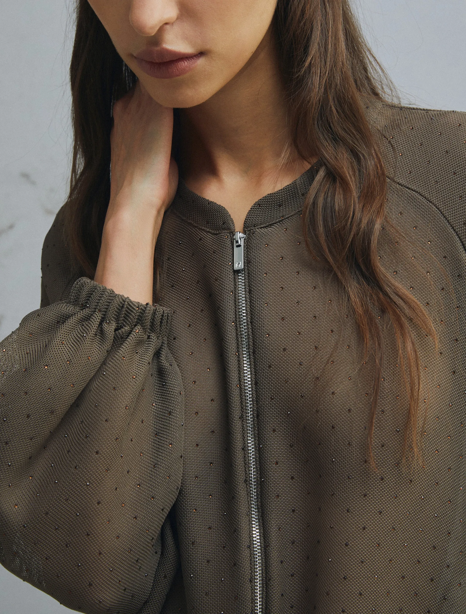 Bomber in rete tecnica con micro strass con collo a bomber e manica raglan, chiusura con zip metallica a doppio cursore e cursori personalizzati, inserto elastico ai polsi e a fondo capo.