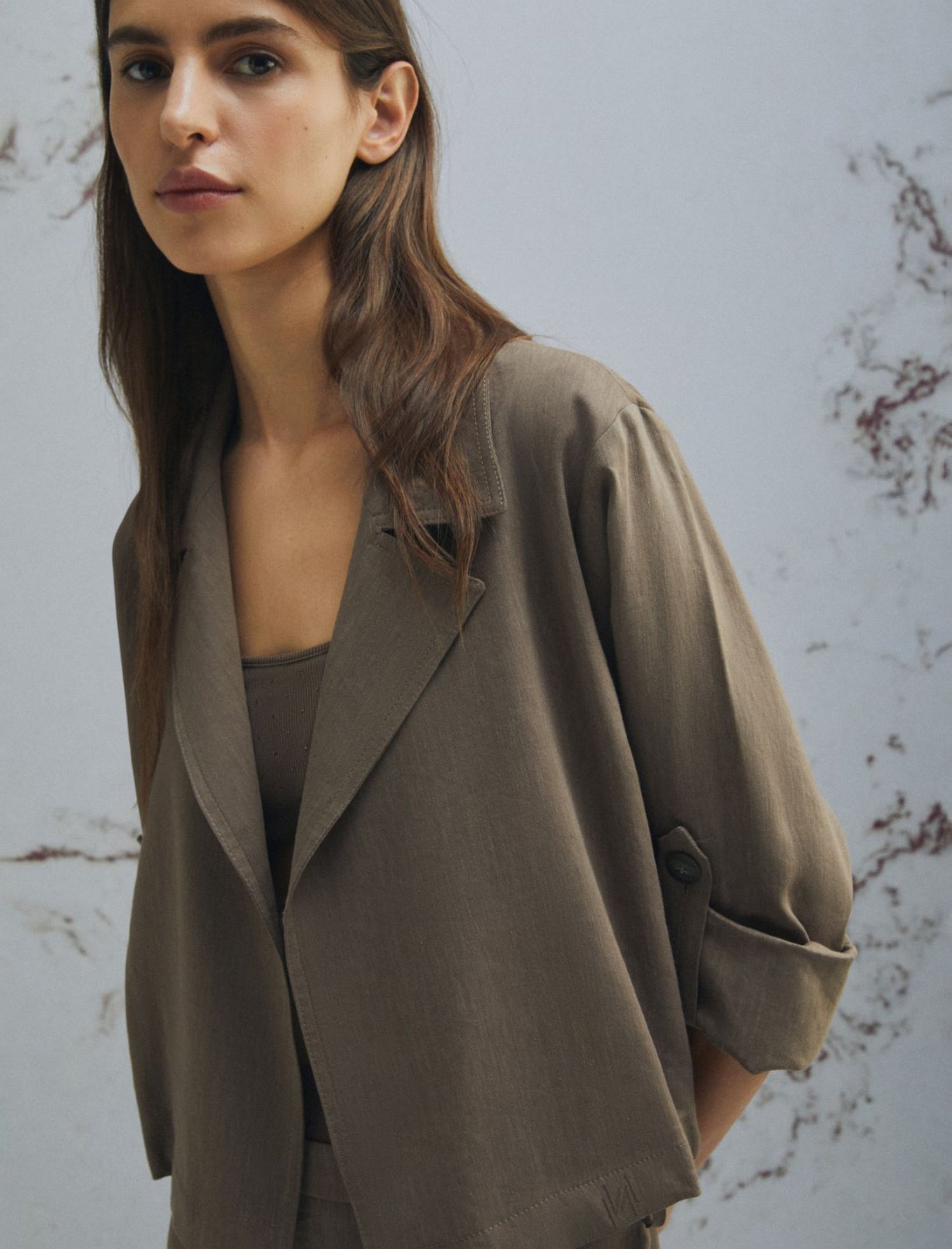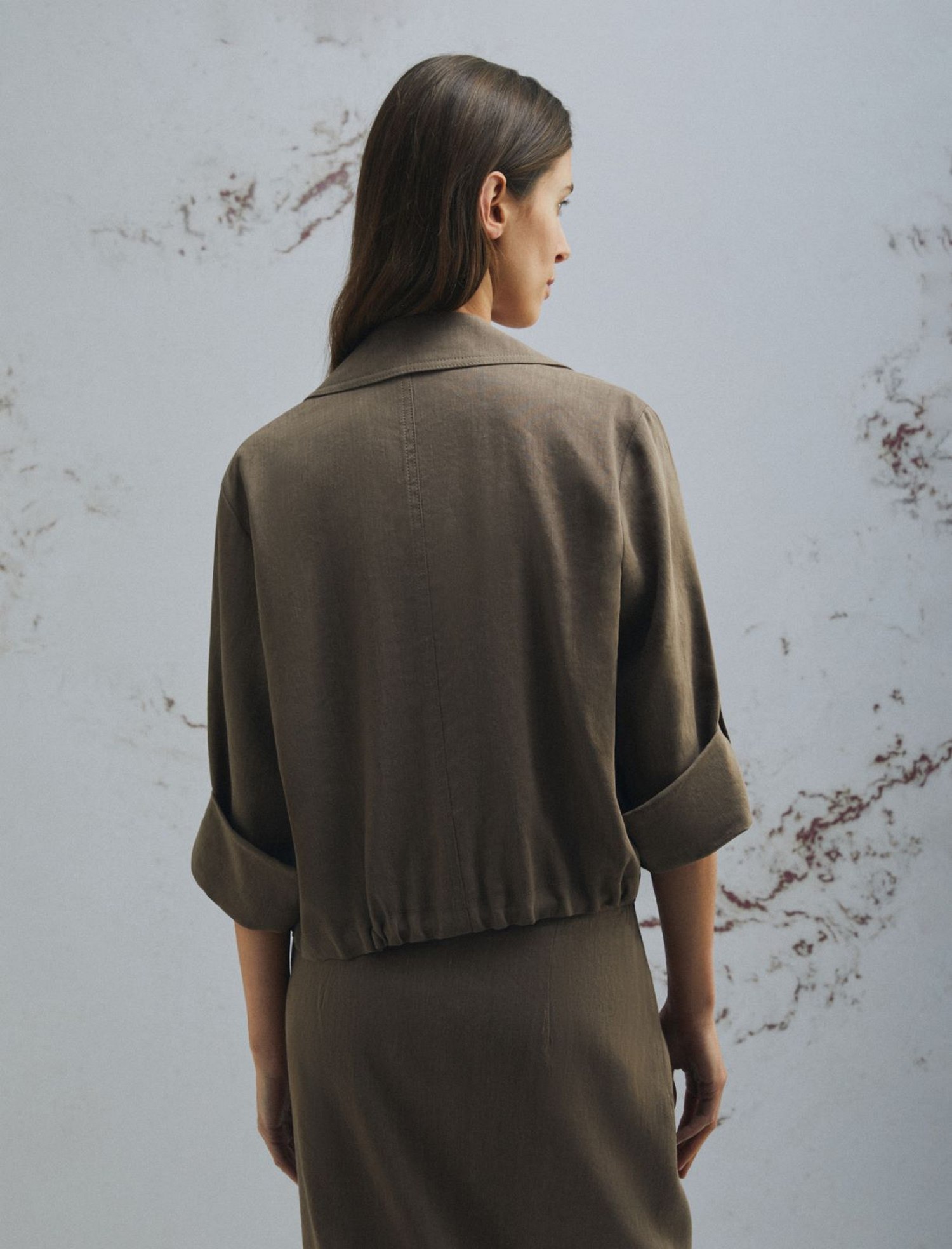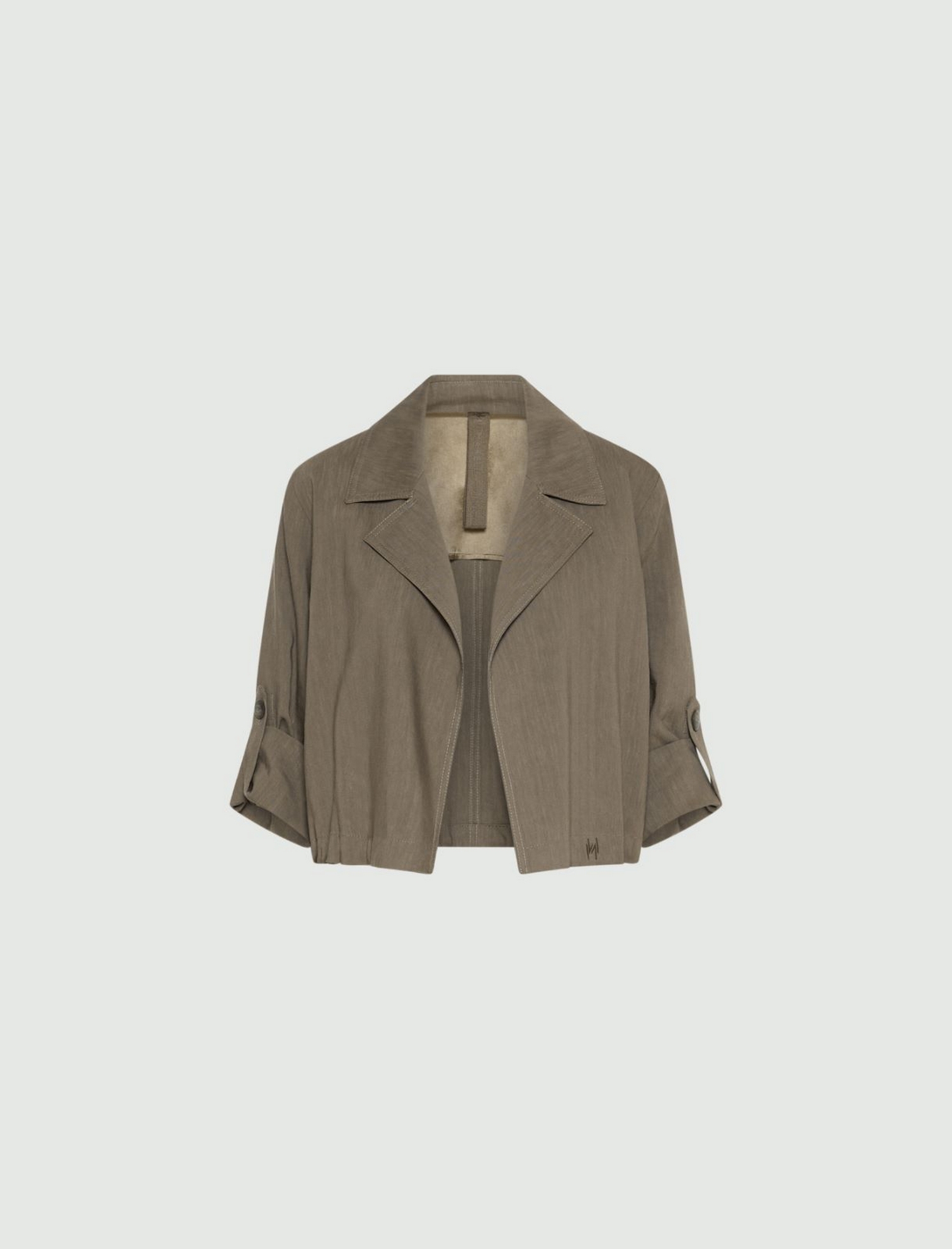Giacca in viscosa e lino stretch con scollo con rever, maniche lunghe con alamaro interno per arrotolarle, laccetto in twill di seta e logo ricamato a fondo capo.