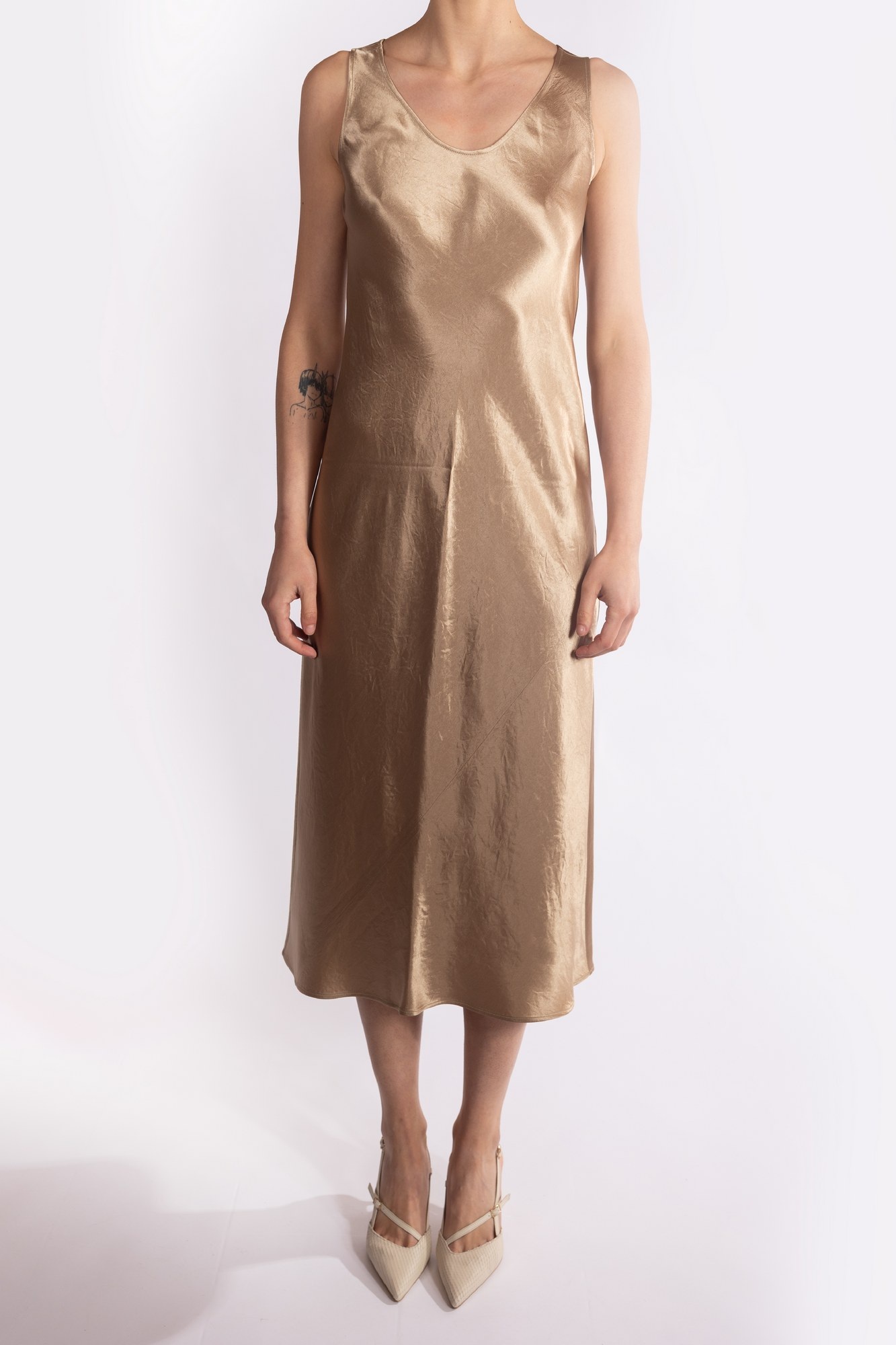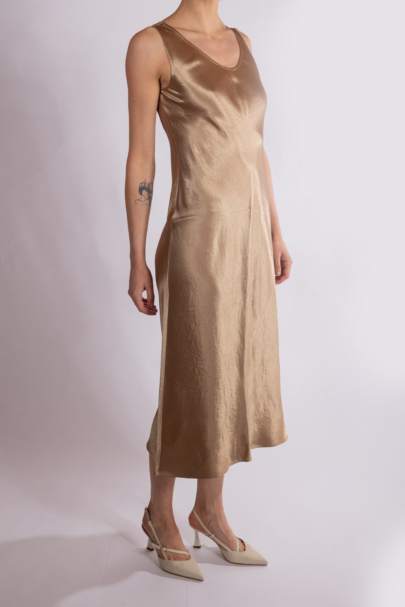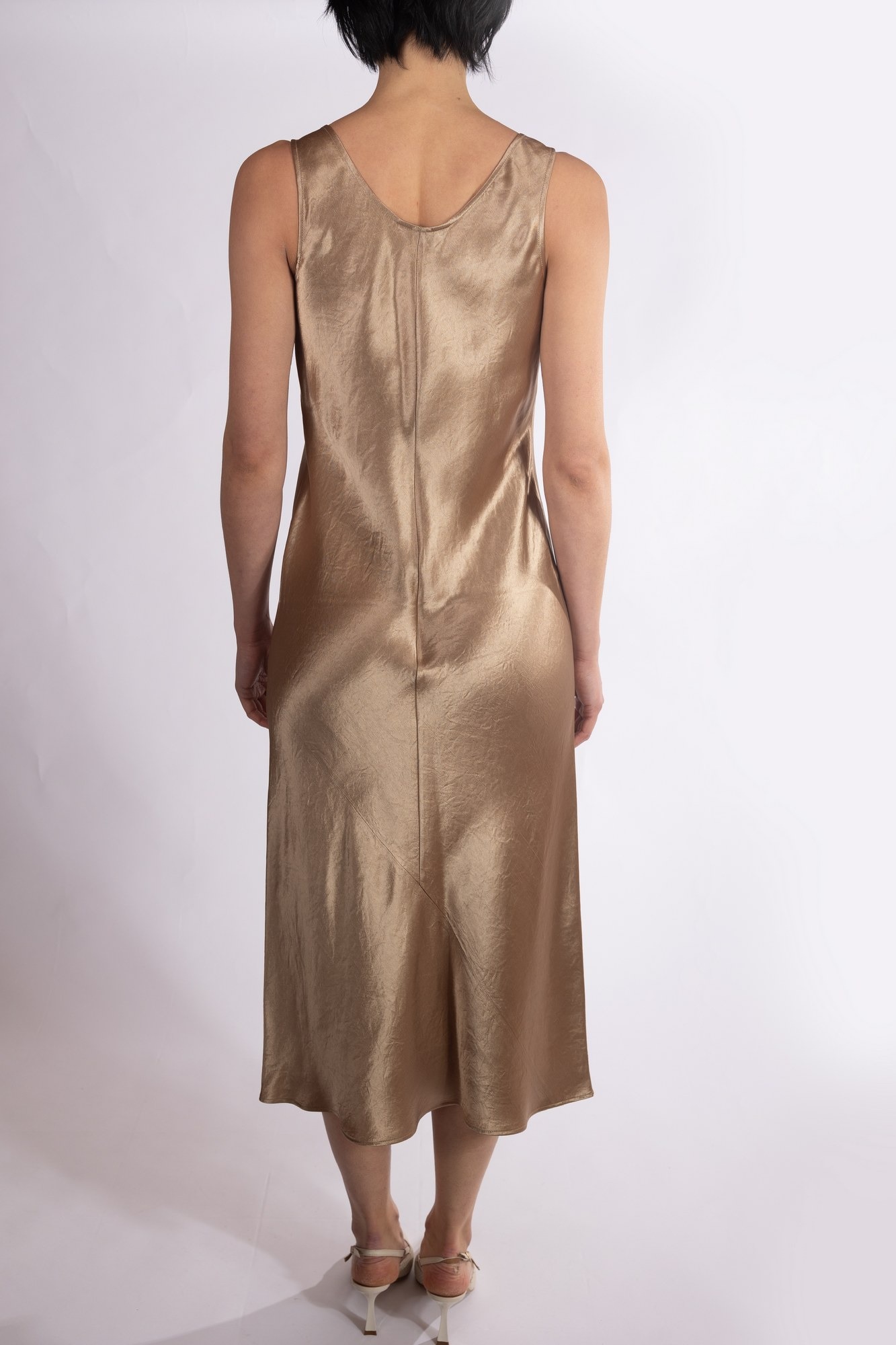 Abito sottoveste midi con scollo a "U" profondo, taglio sbieco e lunghezza sotto il ginocchio.