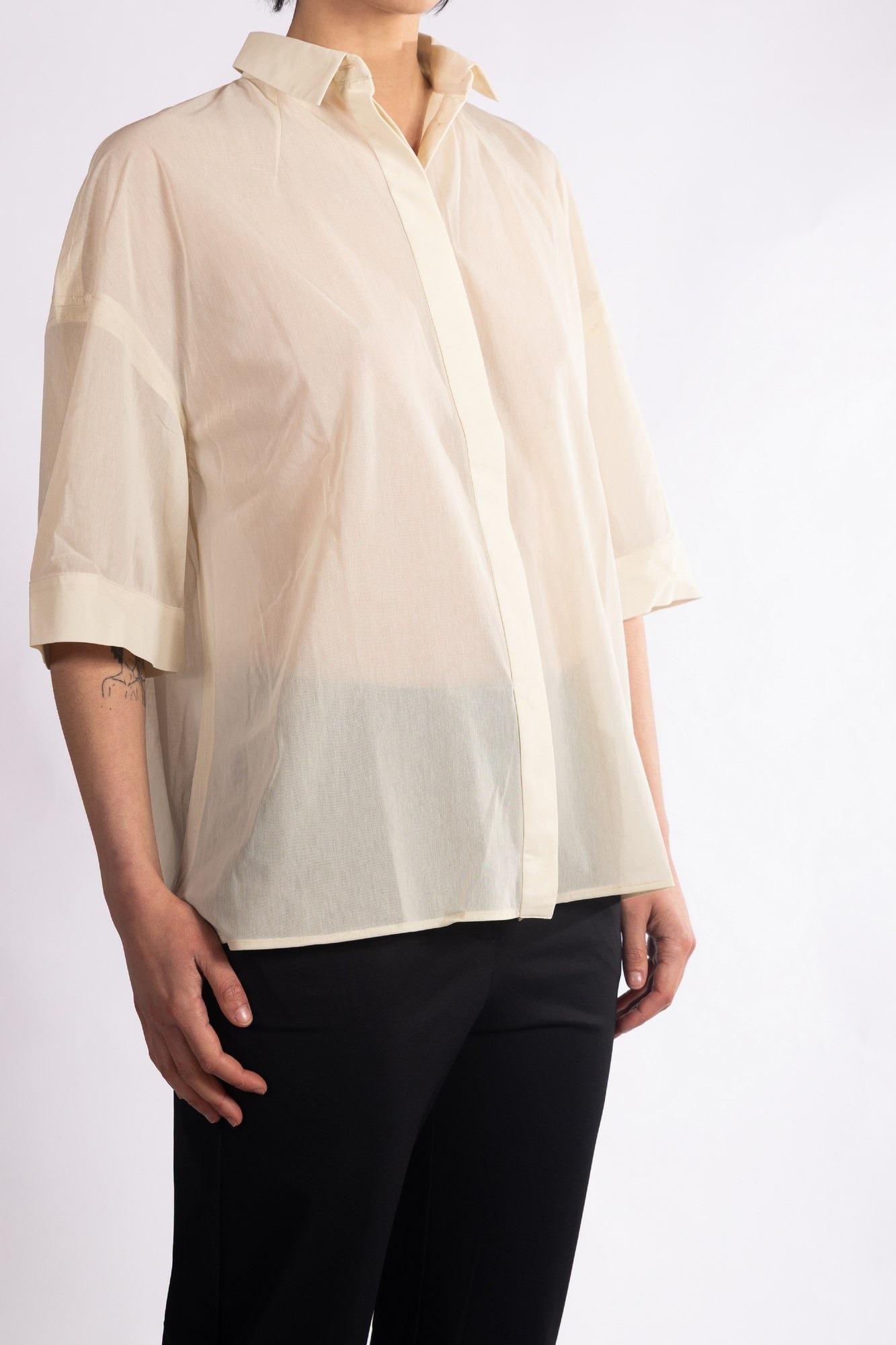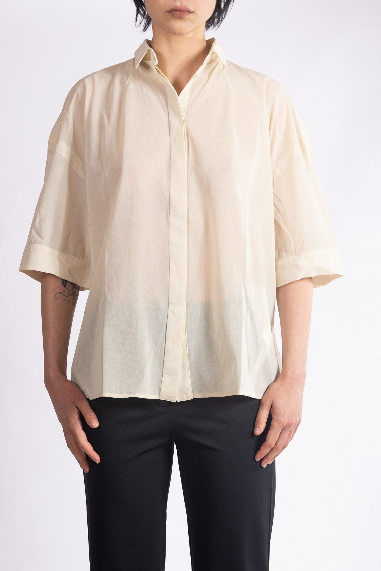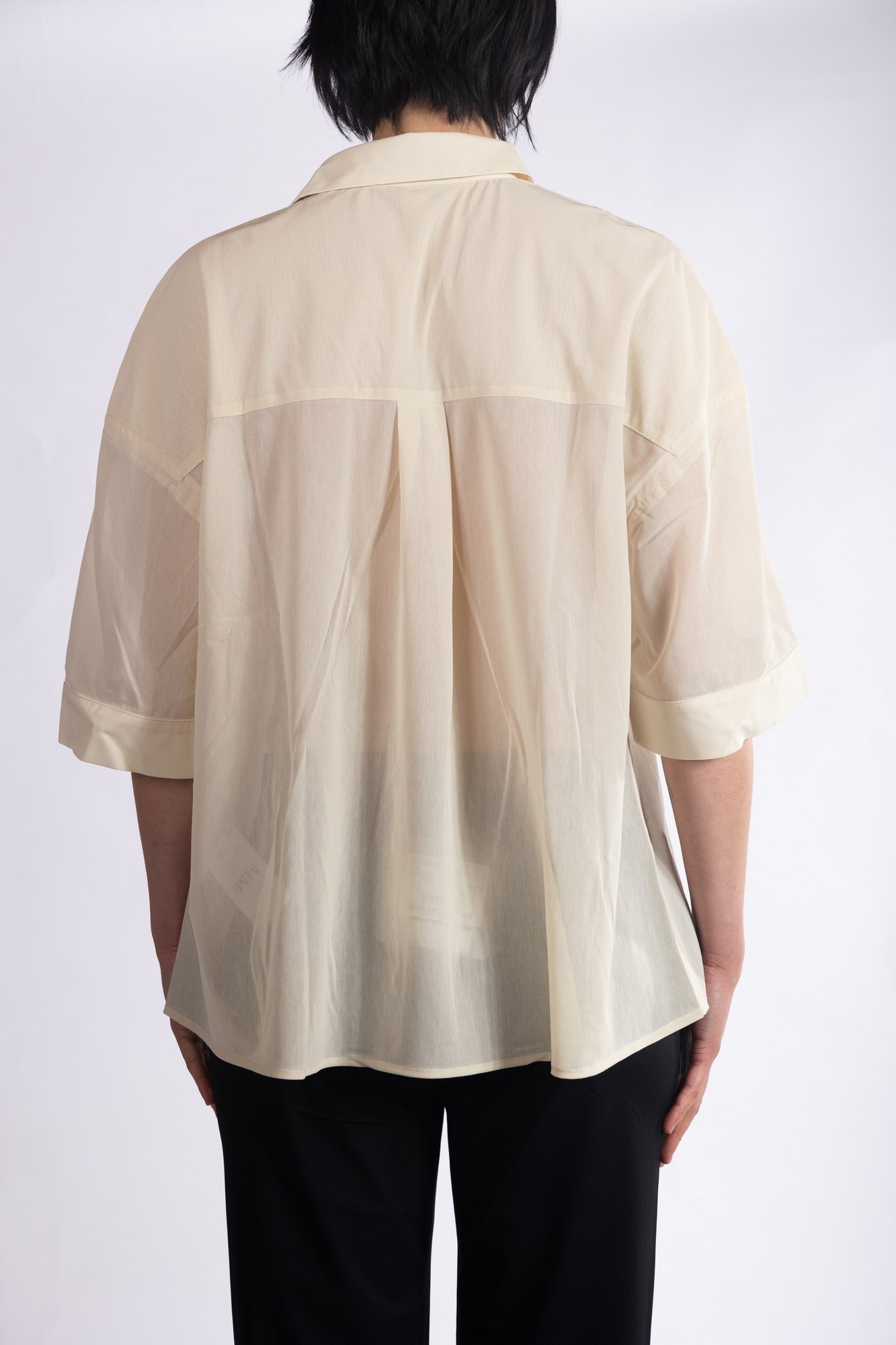 Camicia a maniche corte in un tessuto leggermente trasparente, maniche ampie che arrivano al gomito, rifinite con un alto risvolto cucito, colletto a punta classico e chiusura frontale.