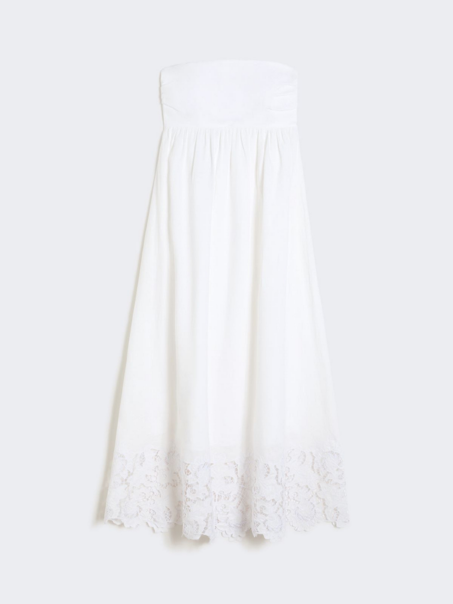 Abito in tela leggera di puro lino lavata con corpetto a fascia con nastro a fiocco sul retro, chiusura con zip sul retro e tasche inserite nei fianchi.