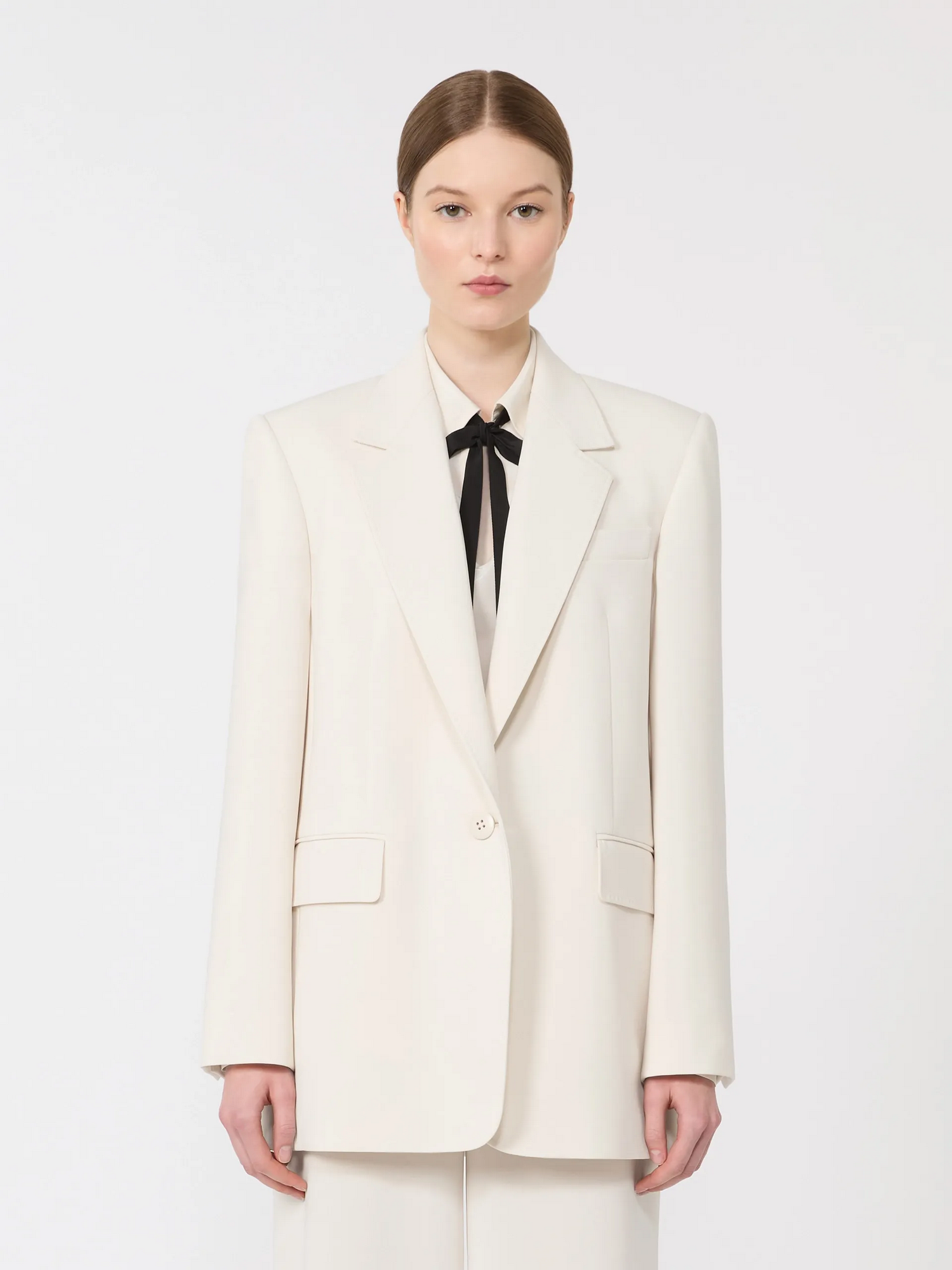 Blazer in cady con impunture verticali sui fianchi, collo a rever, maniche a giro con bottoni sul fondo, chiusura frontale bassa con bottone singolo, taschino sul petto e tasche a filetto con patta e spacco centrale sul retro.