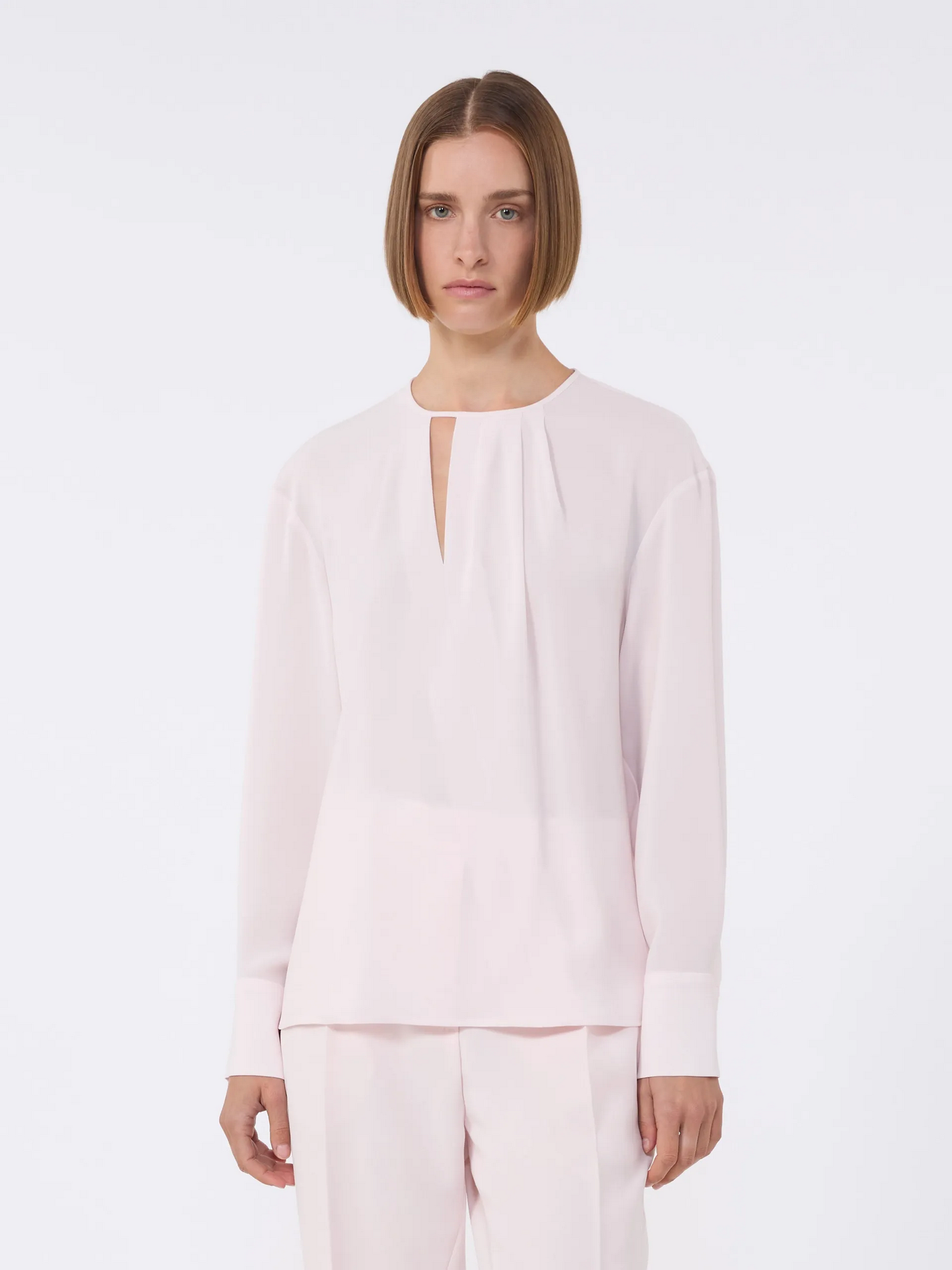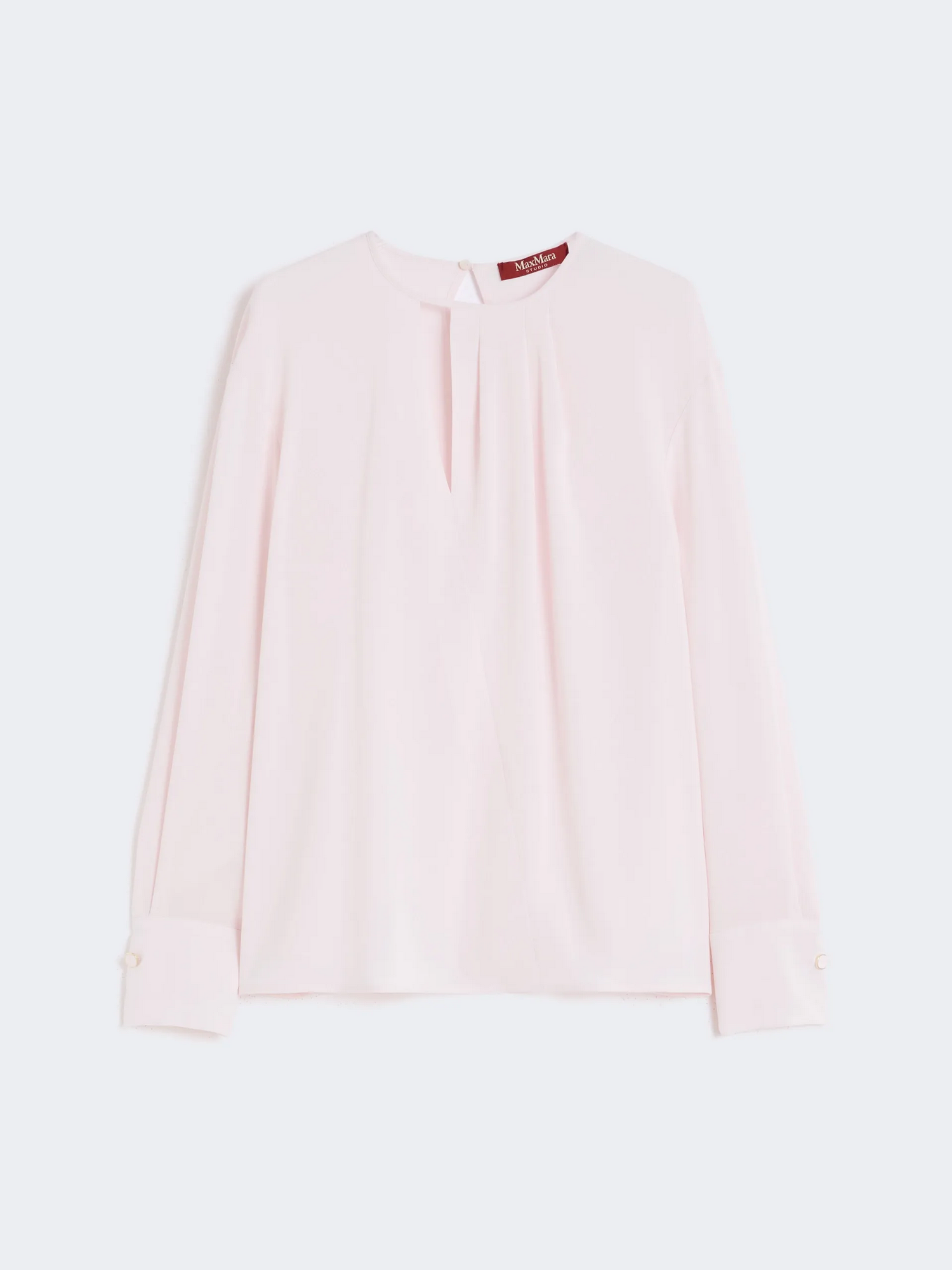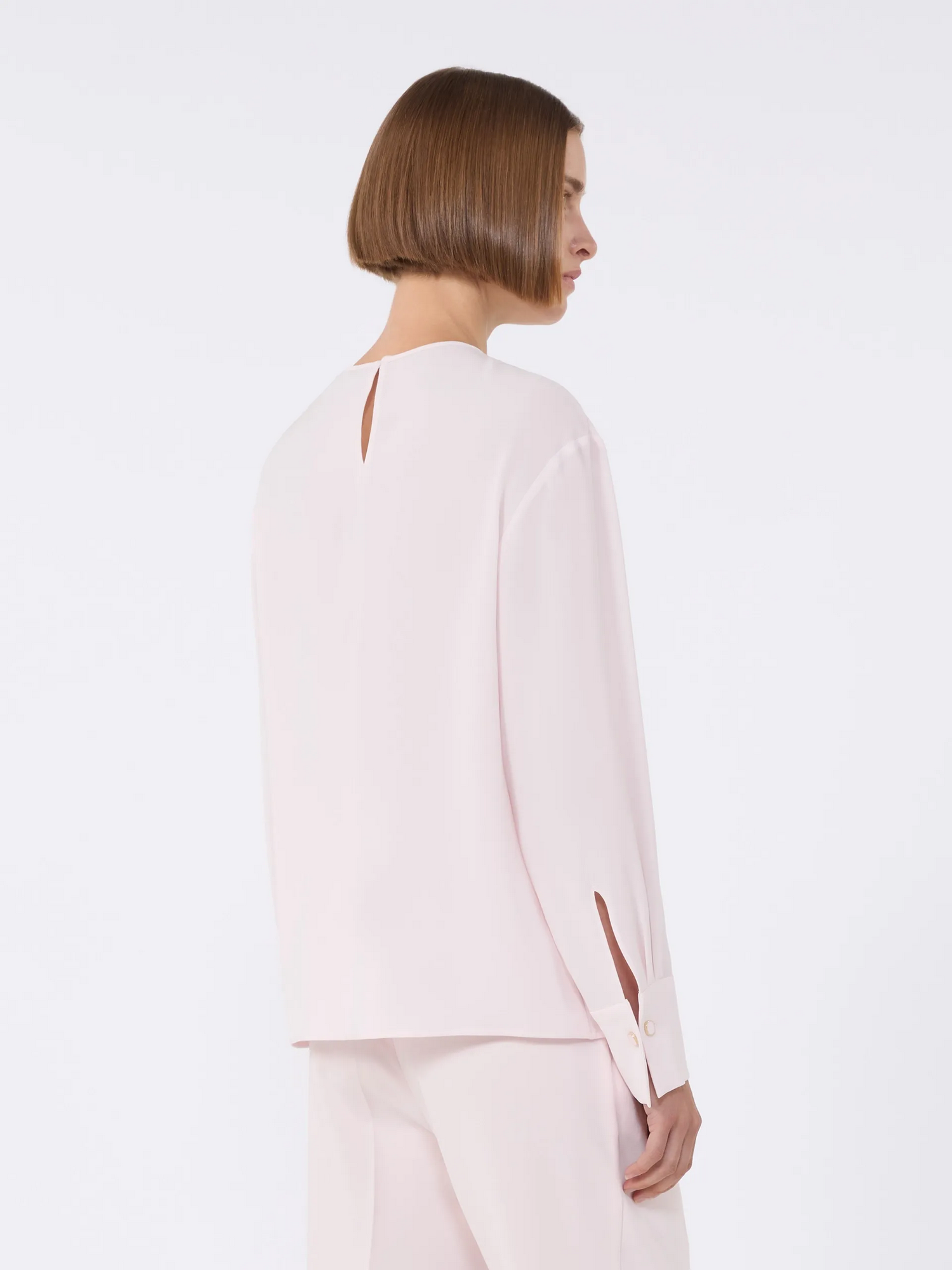 Blusa in cady leggero con maniche lunghe con spalla scesa, polsino alto a gemello gioiello e chiusura a goccia con bottone sul retro.