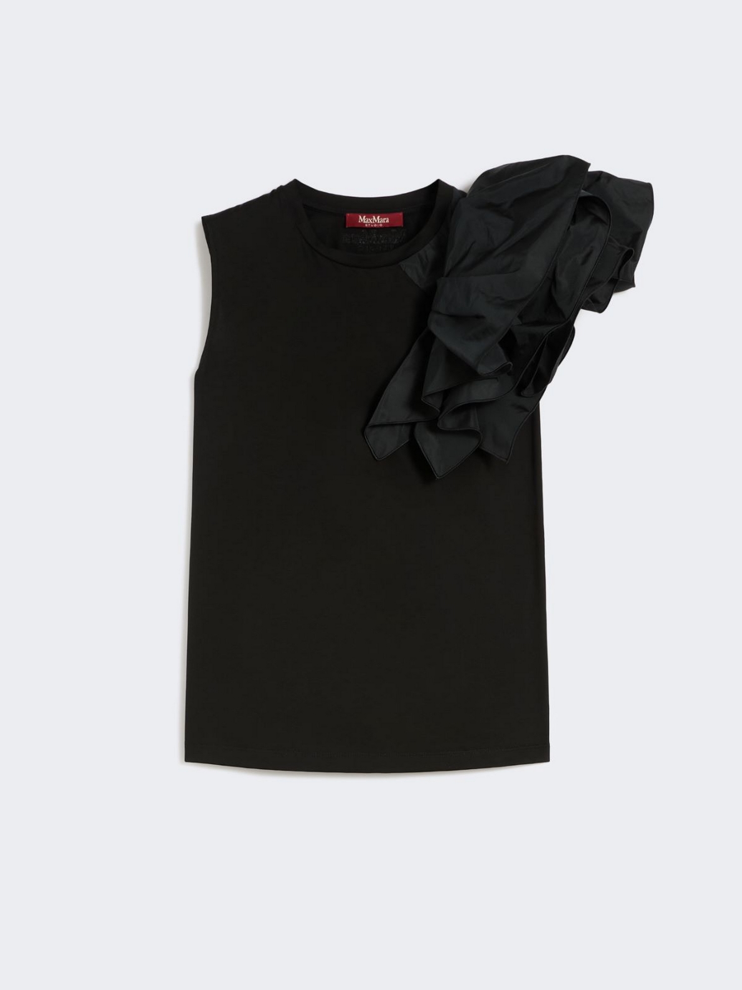T-shirt couture smanicata con maxi fiore sartoriale in taffetà misto seta, applicato sulla spalla sinistra.
