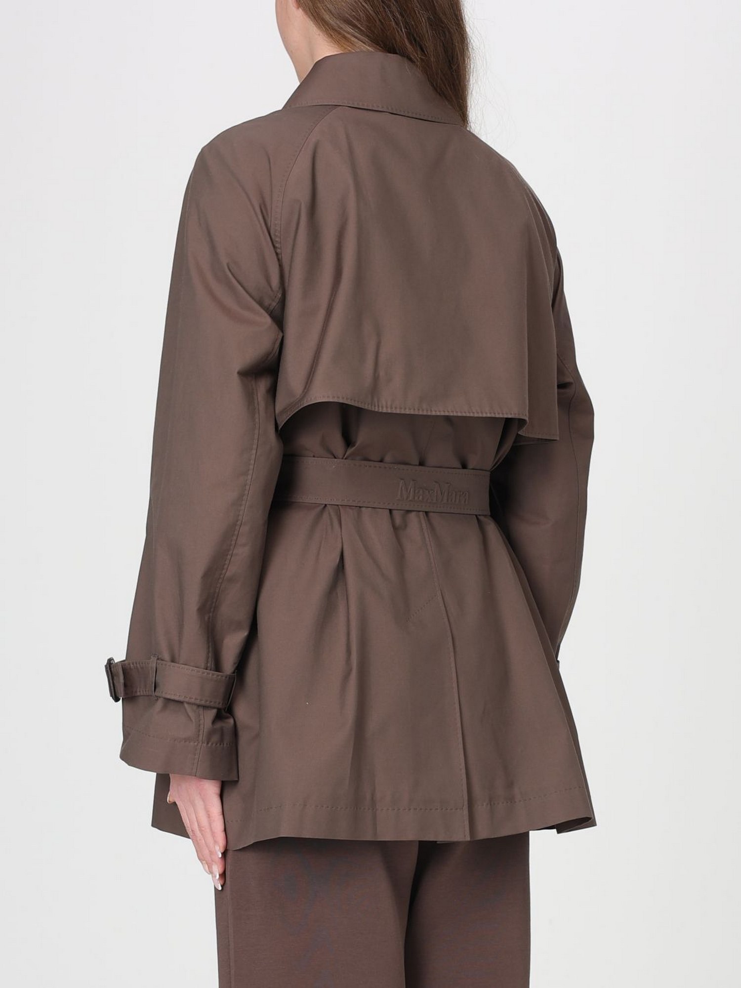 Trench in twill di misto cotone antigoccia corto doppiopetto, spacco centrale sul retro, colletto a camicia e maniche raglan con alamari sui polsi, chiusura frontale con bottoni in corno e tasche a doppio filetto sui fianchi.