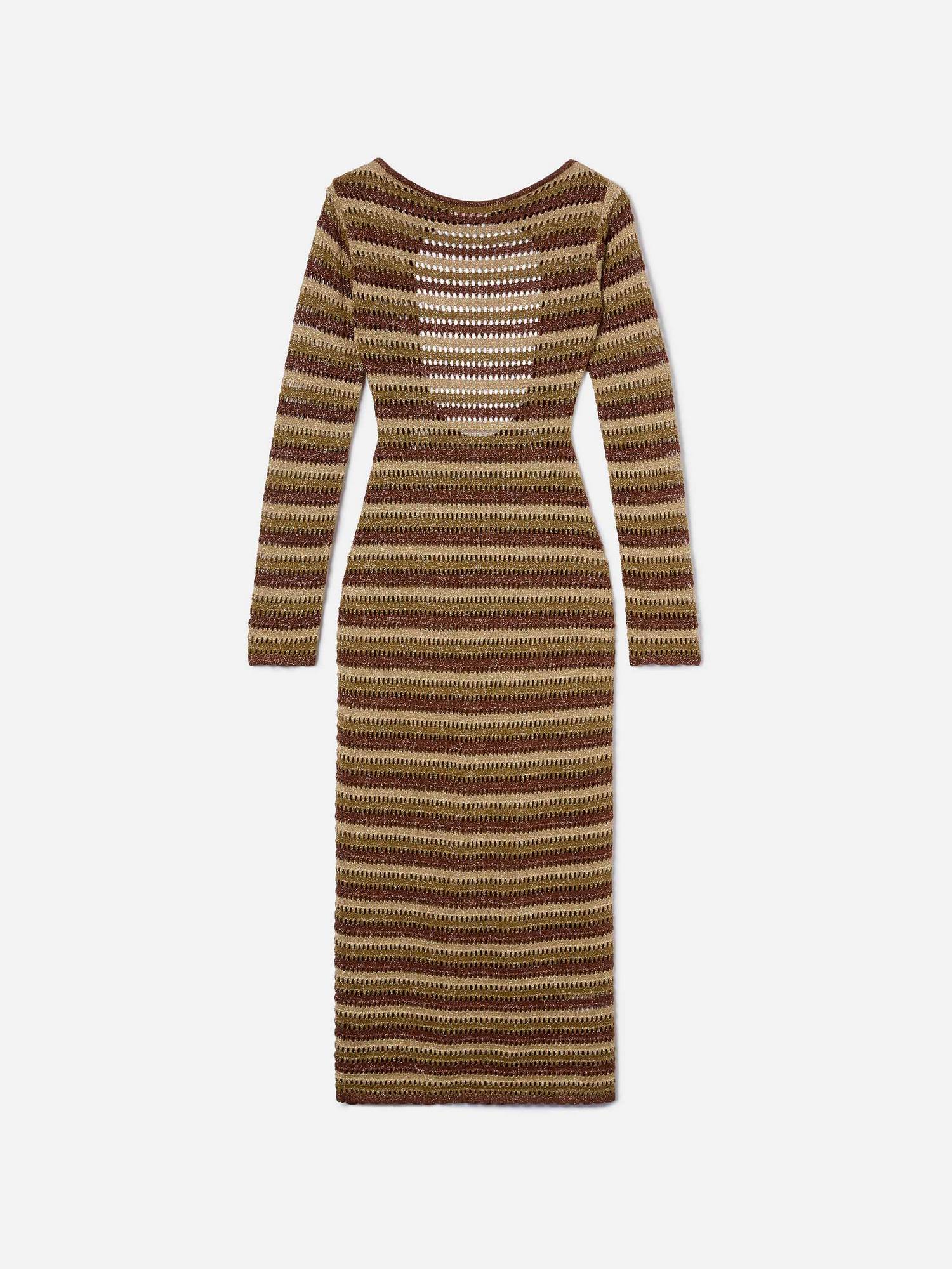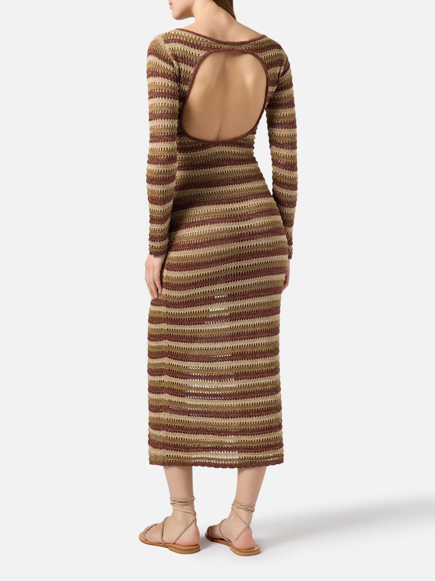 Abito lungo crochet con fantasia a righe, scollo a barchetta, maniche lunghe svasate e apertura ovale sulla schiena.