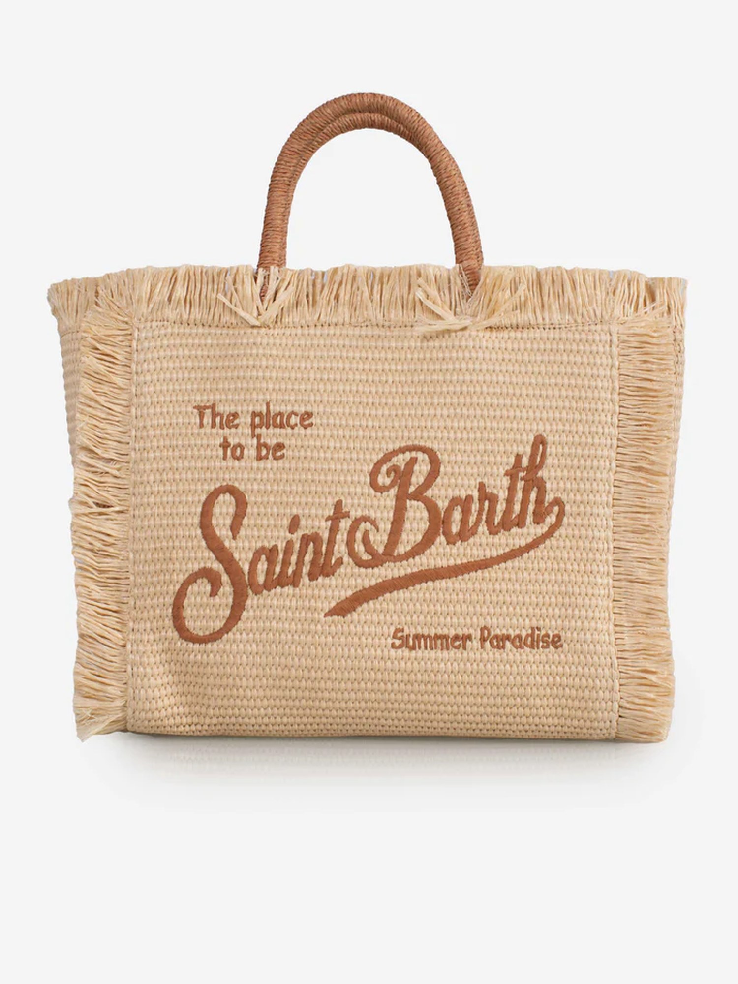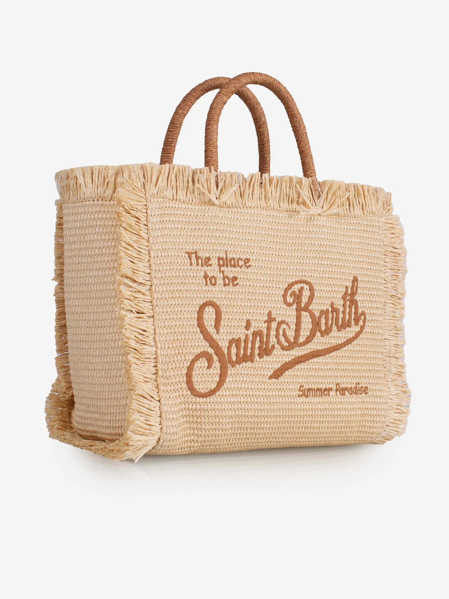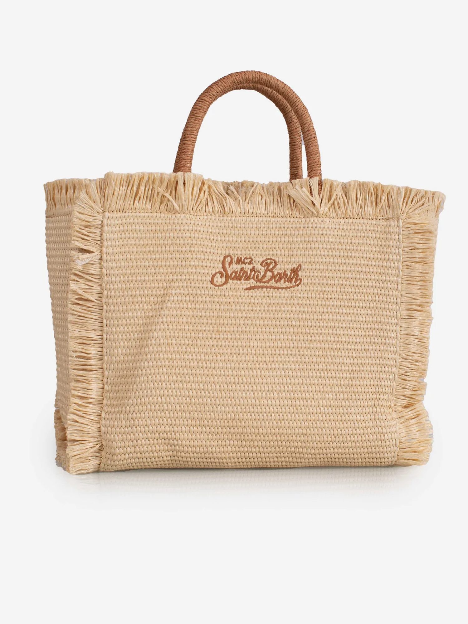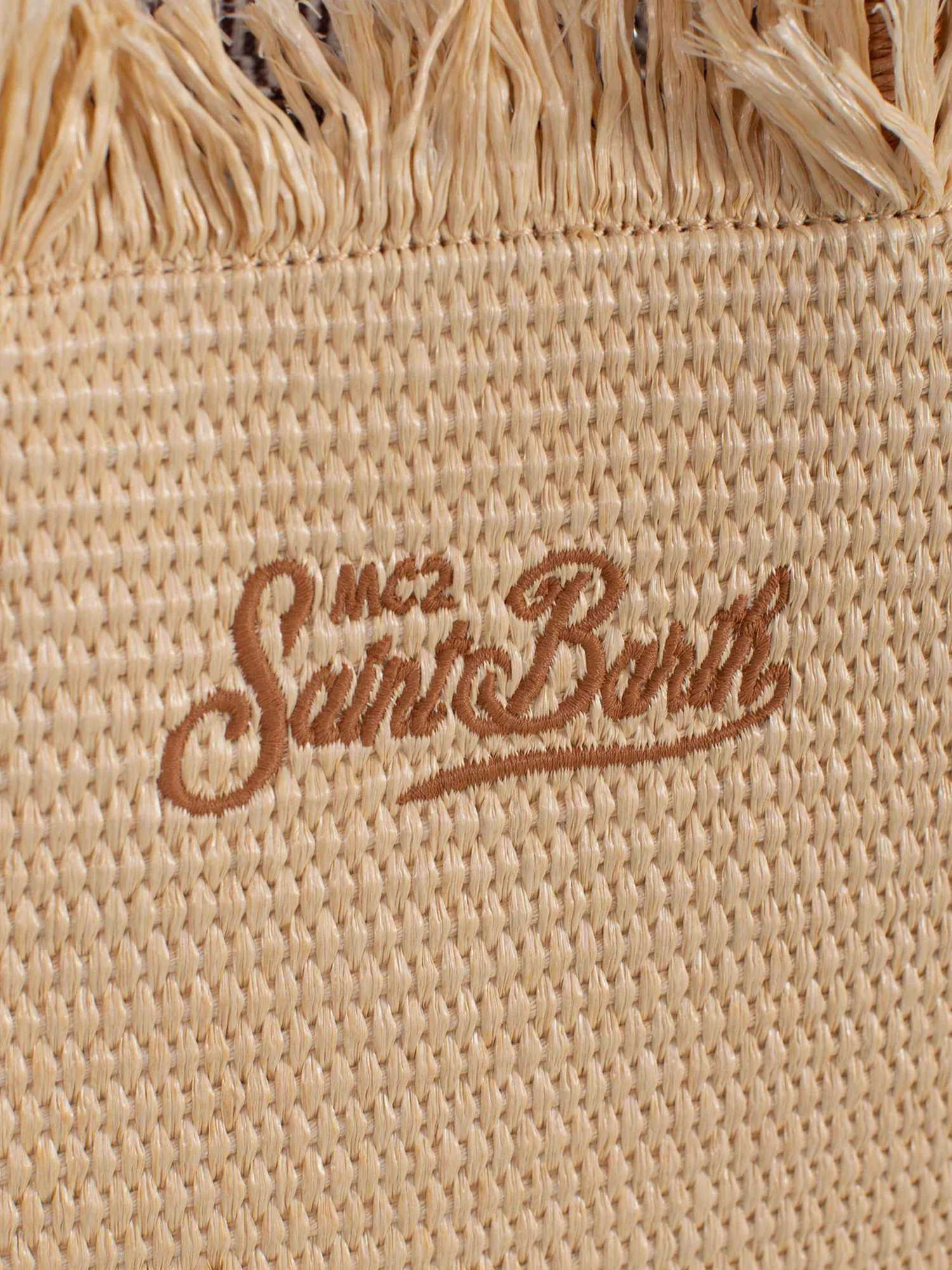 Borsa in paglia con tracolla regolabile e removibile, logo ricamato e chiusura con cerniera.