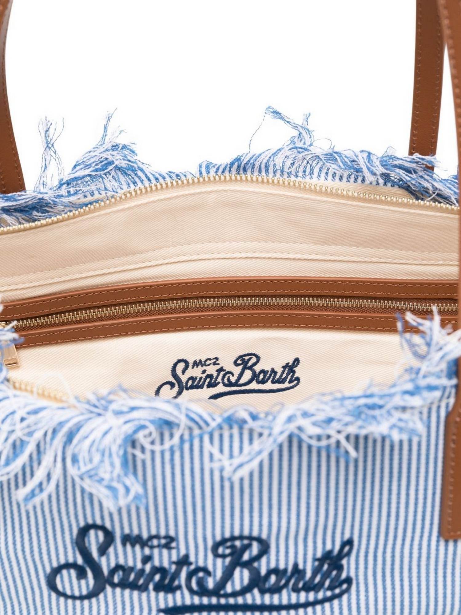 Tote bag con bordo superiore con frange, logo ricamato sul fronte, doppi manici superiori, chiusura superiore con zip e tasca interna portaoggetti.