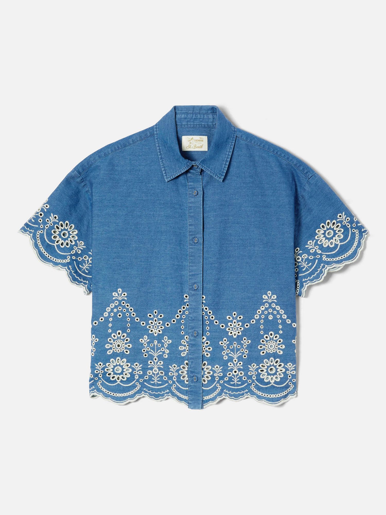 Camiciain cotone chambray con ricami floreali, colletto classico e chiusura frontalecon bottoni.
