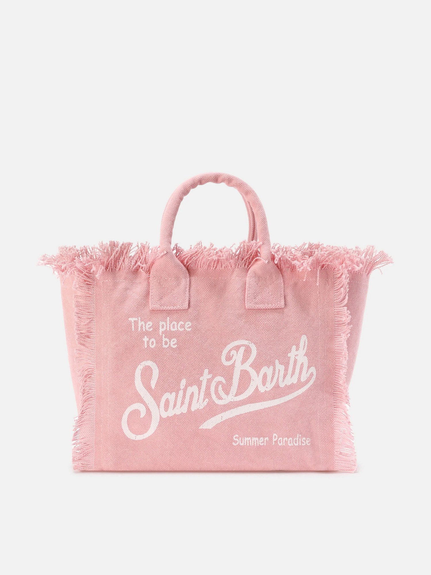 Borsa in canvas con frange laterali, logo stampato sul fronte, doppi manici superiori, tracolla regolabile e removibile, chiusura superiore con zip e tasca interna portaoggetti.