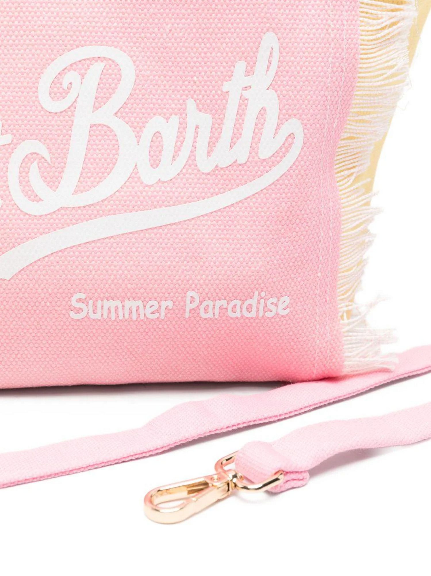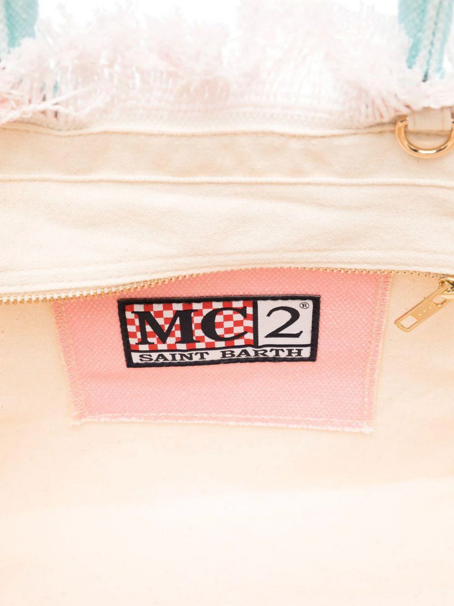 Borsa in canvas con frange laterali, logo stampato sul fronte, doppi manici superiori, tracolla regolabile e removibile, chiusura superiore con zip e tasca interna portaoggetti.