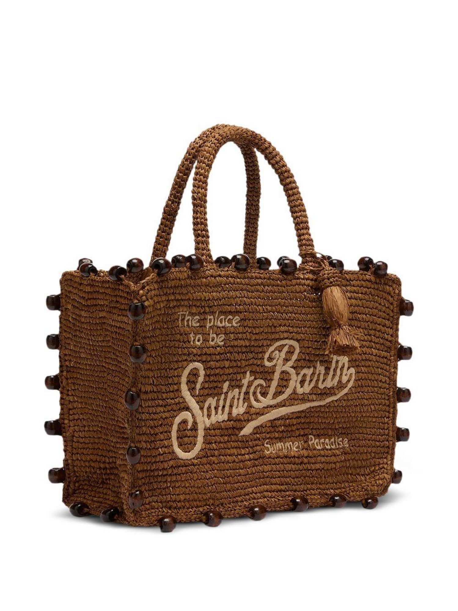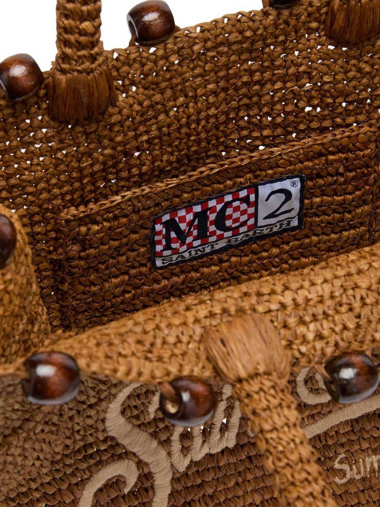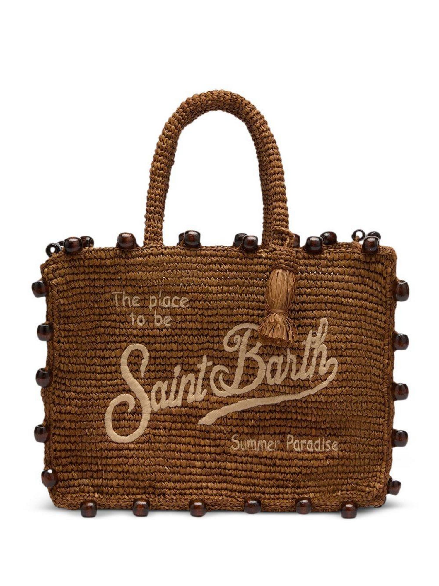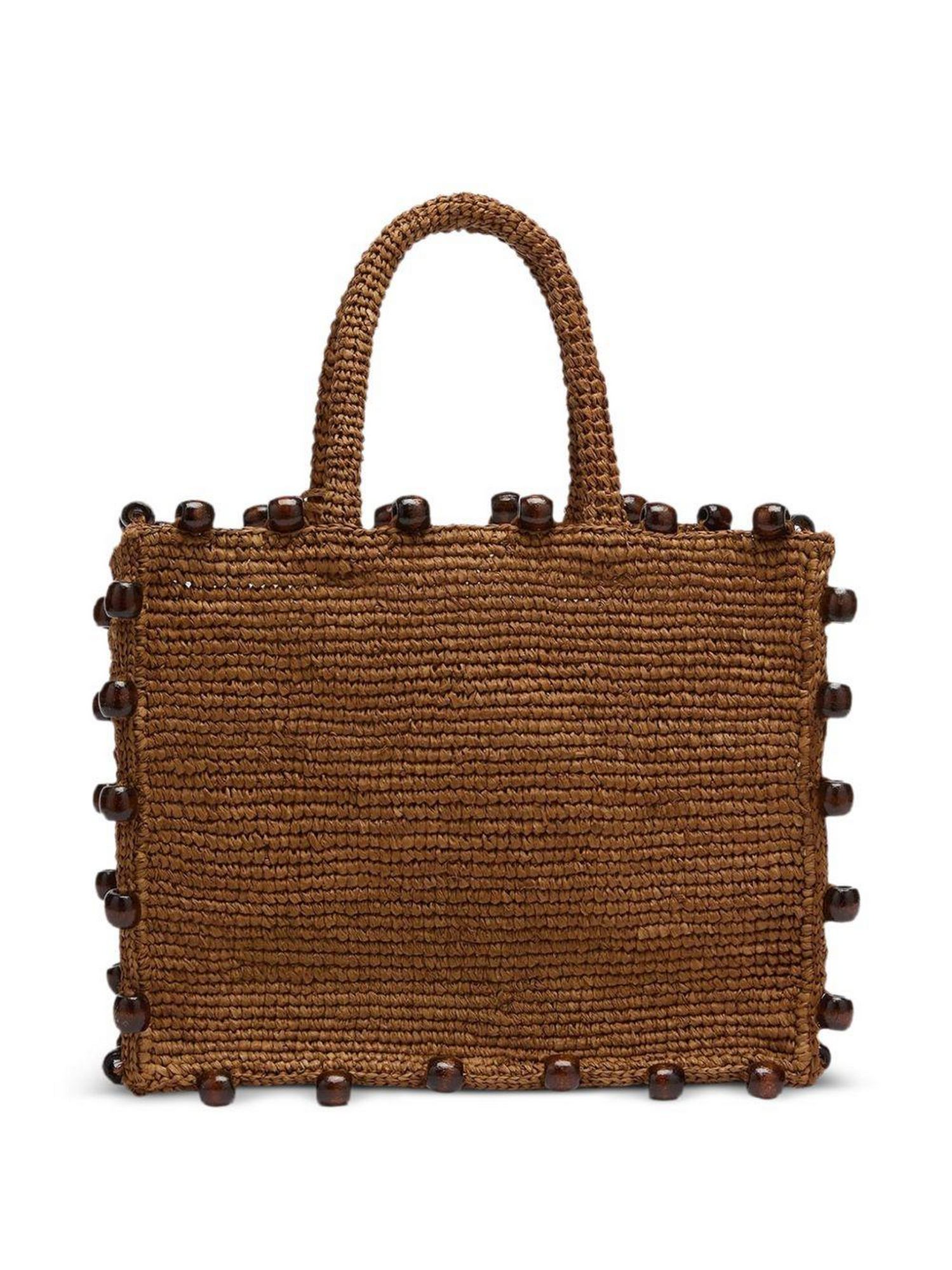 Borsa in rafia con perline di rafia, logo ricamato sul davanti, dettaglio con nappina, due manici superiori arrotondati, tracolla regolabile e removibile e tasca interna con chiusura a zip.