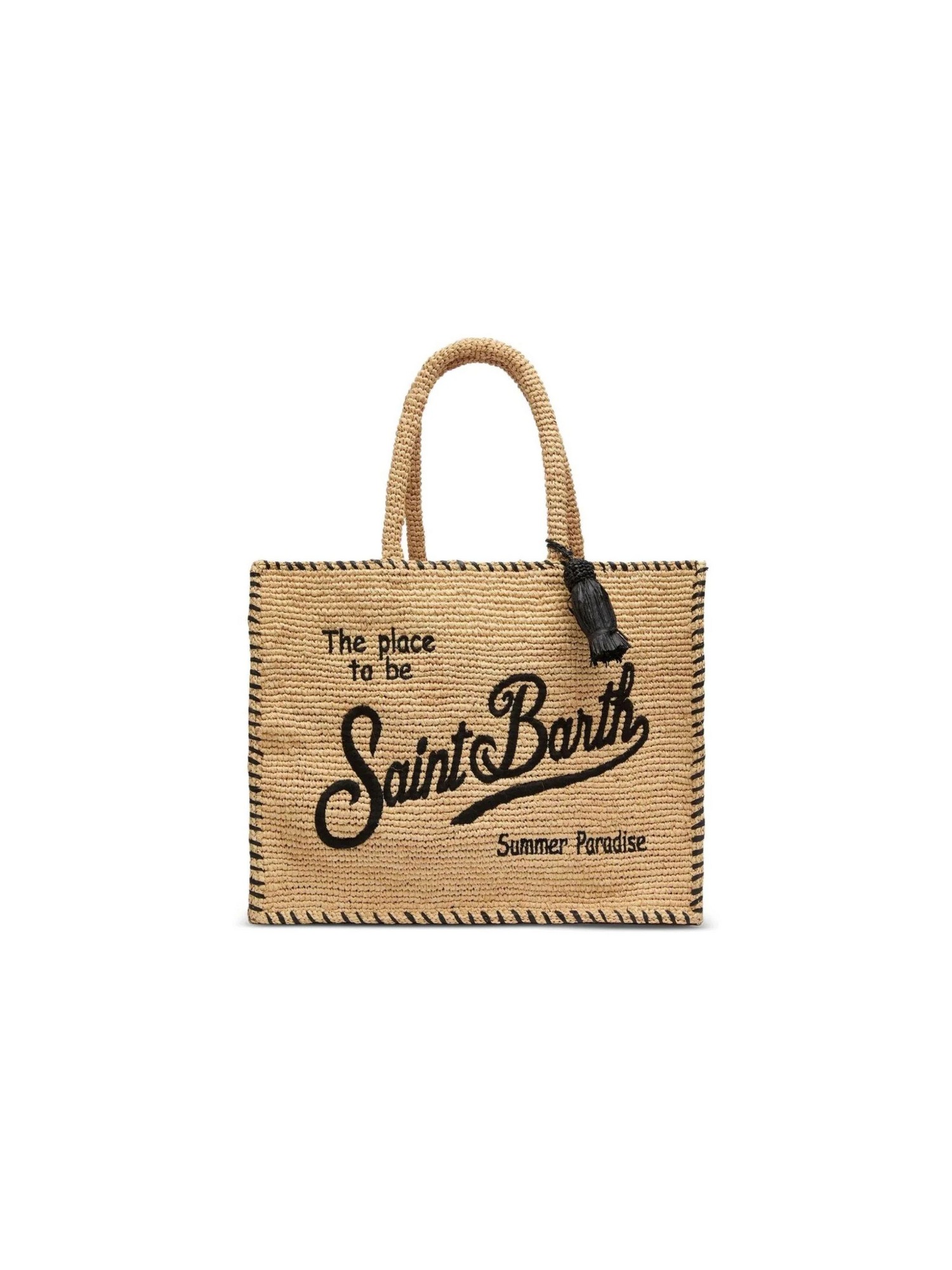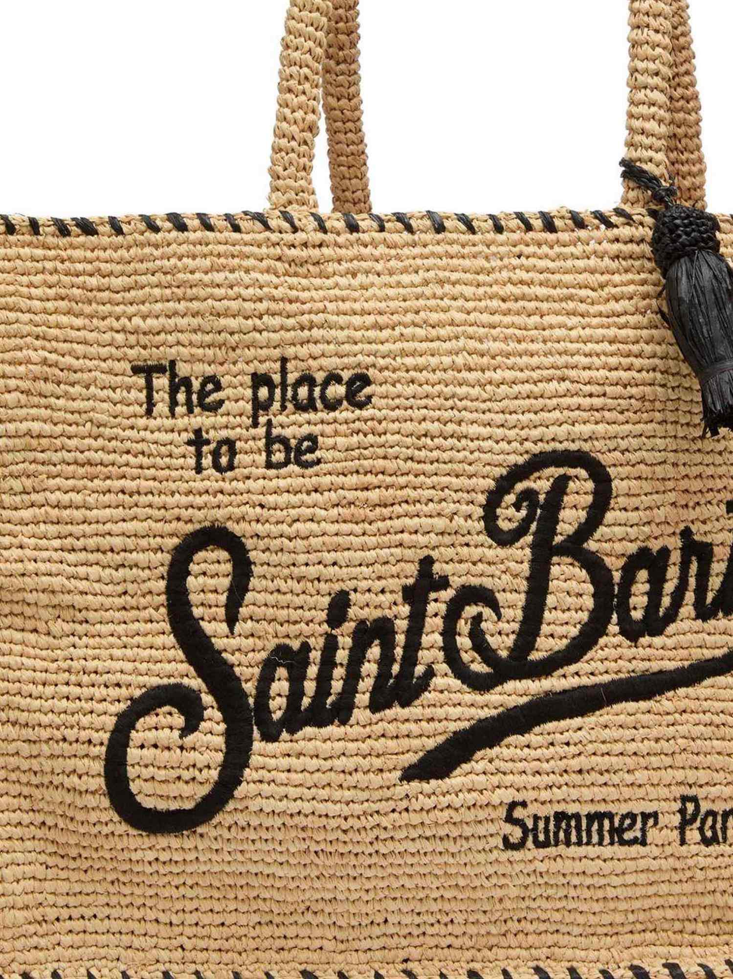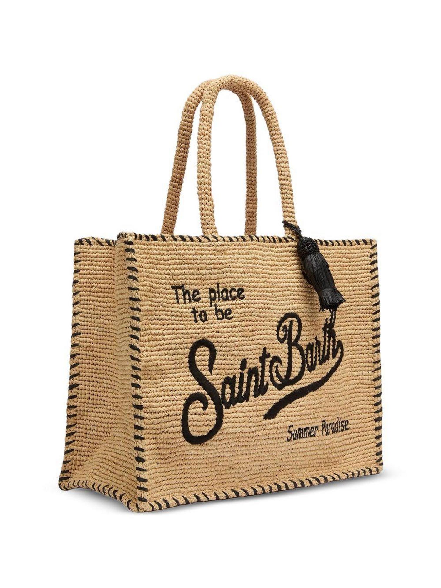 Borsa in rafia con perline di rafia, logo ricamato sul davanti, dettaglio con nappina, due manici superiori arrotondati, tracolla regolabile e removibile e tasca interna con chiusura a zip.