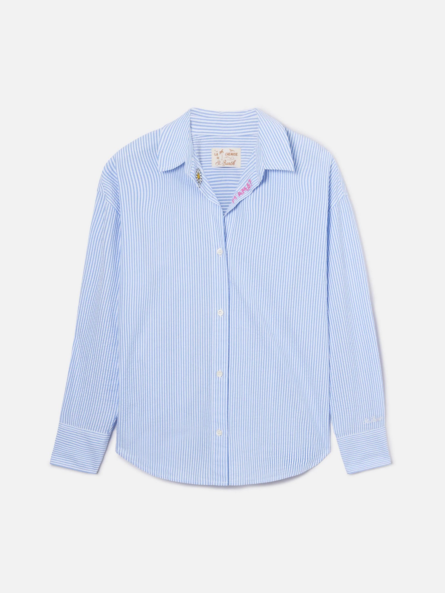 Camicia in cotone popeline con fantasia a righe verticali, collo classico, abbottonatura frontale, bottoni logati, ricamo sullo scollo e sul colletto e pieghettone centrale sul retro.