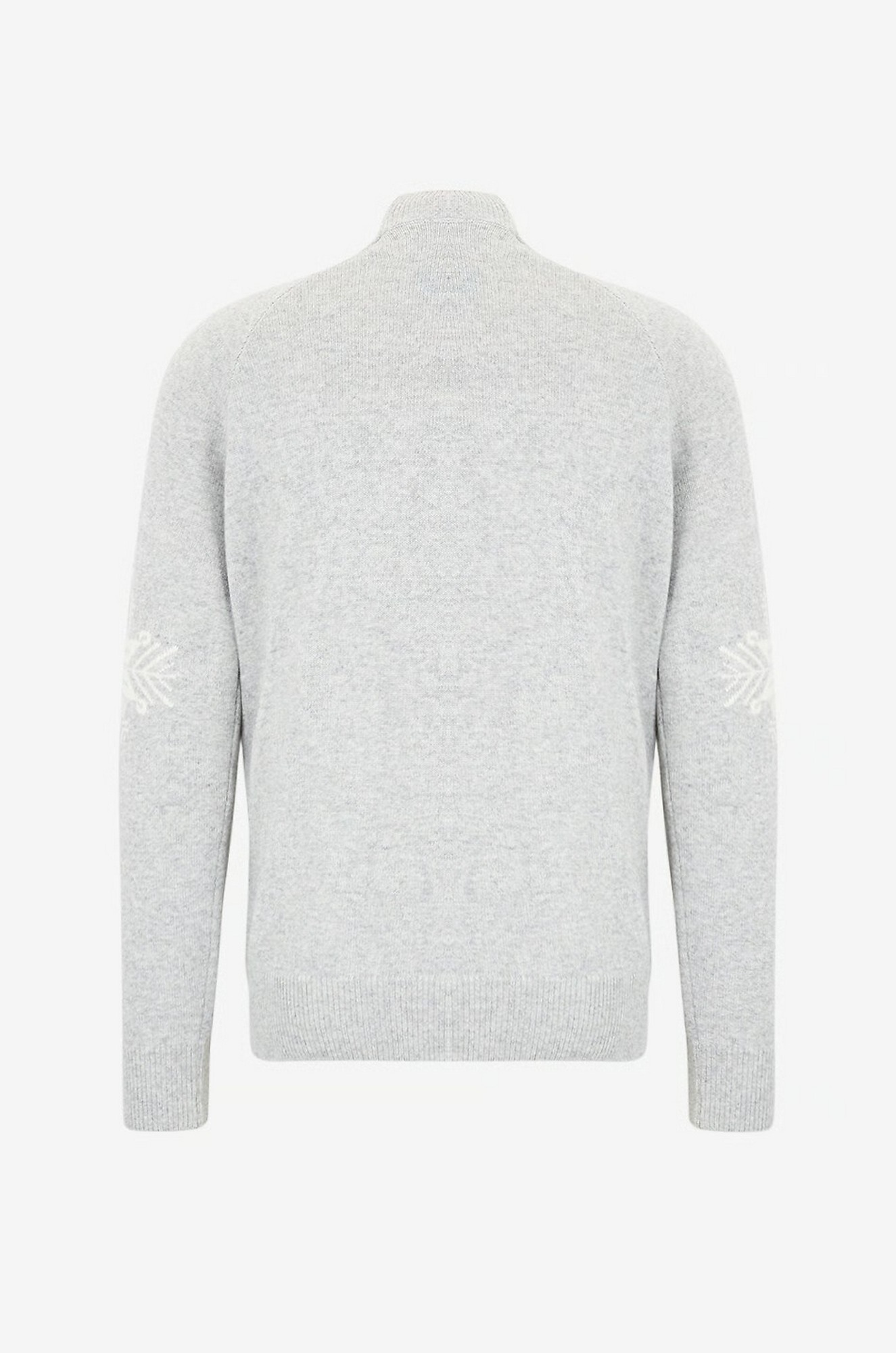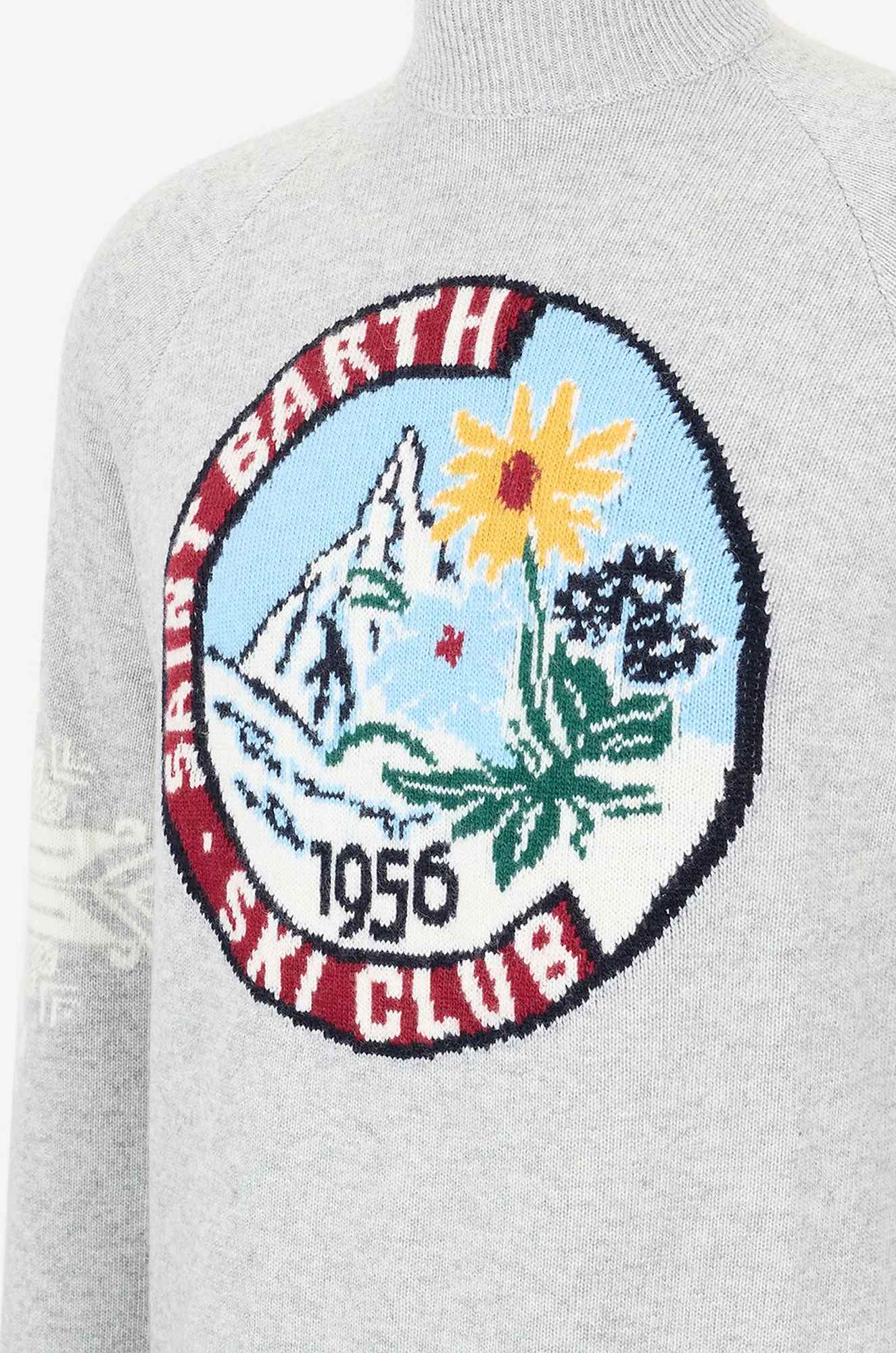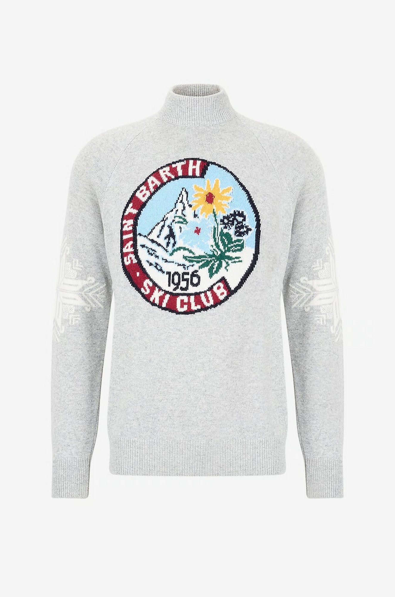 Maglia mezzo dolcevita con collo a vulcano, motivo norvegese sulle maniche, collo, polsini e fondo capo lavorati a costine e stampa jacquard al centro.