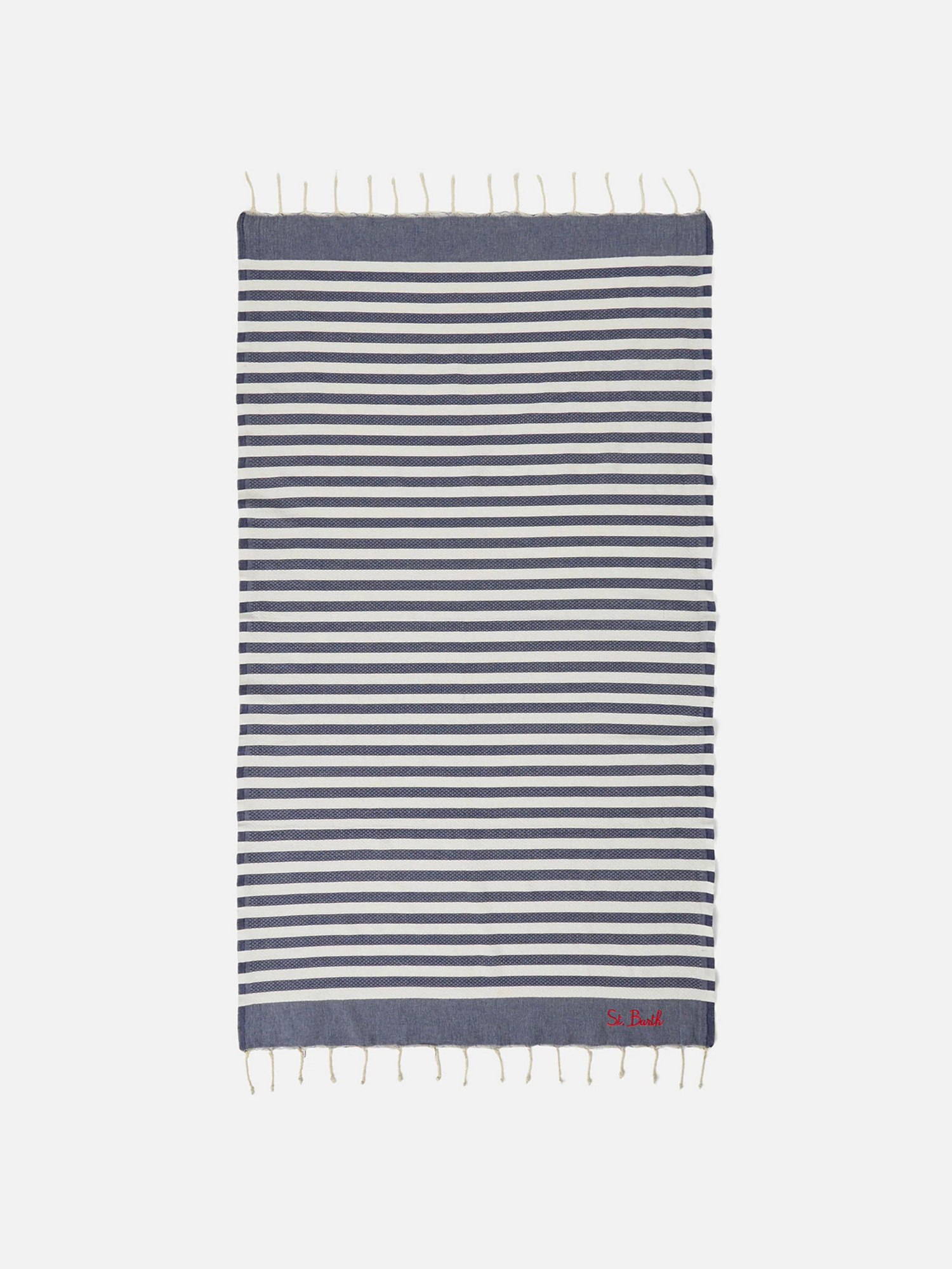 Telo mare in cotone jacquard con fantasia a righe all-over, logo ricamato e frange decorative.