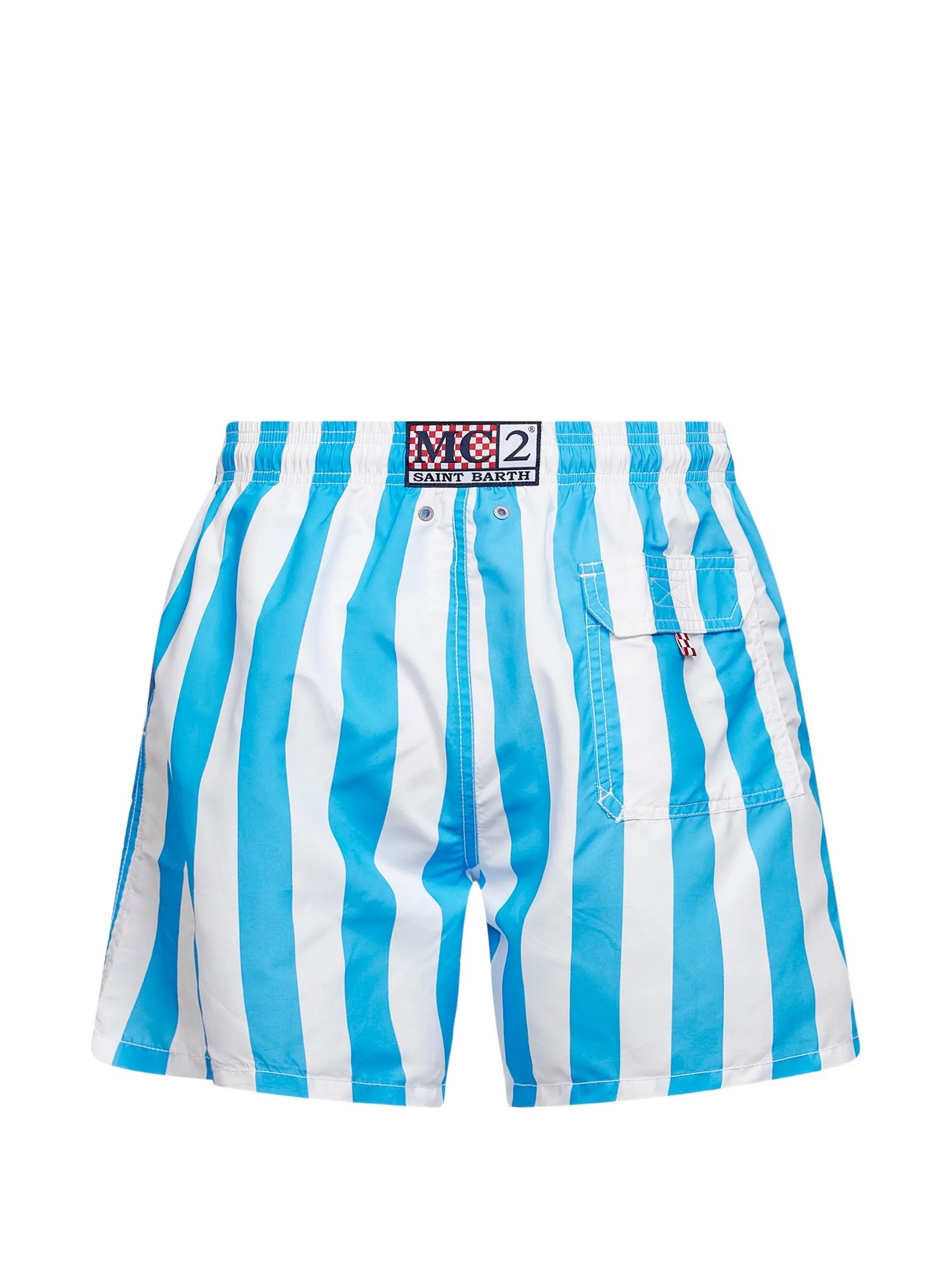 Costume da mare con vita elasticizzata con coulisse, cordino con terminali logati, retina interna elasticizzata antibatterica, tasche laterali a filetto, tasca posteriore con patella e chiusura velcro.