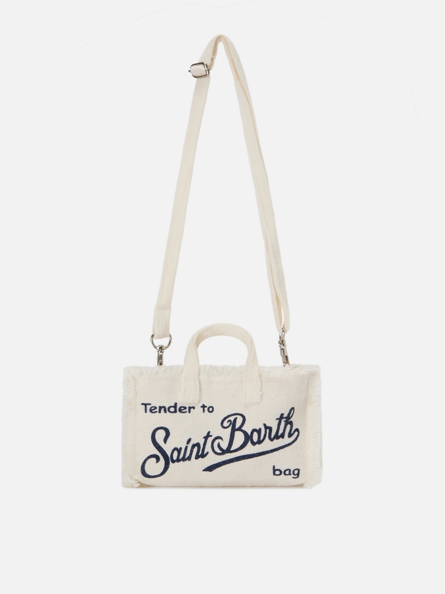 Borsa Phone con logo stampato a contrasto, frange laterali, chiusura con bottone metallico, doppi manici superiori e tracolla regolabile e removibile.