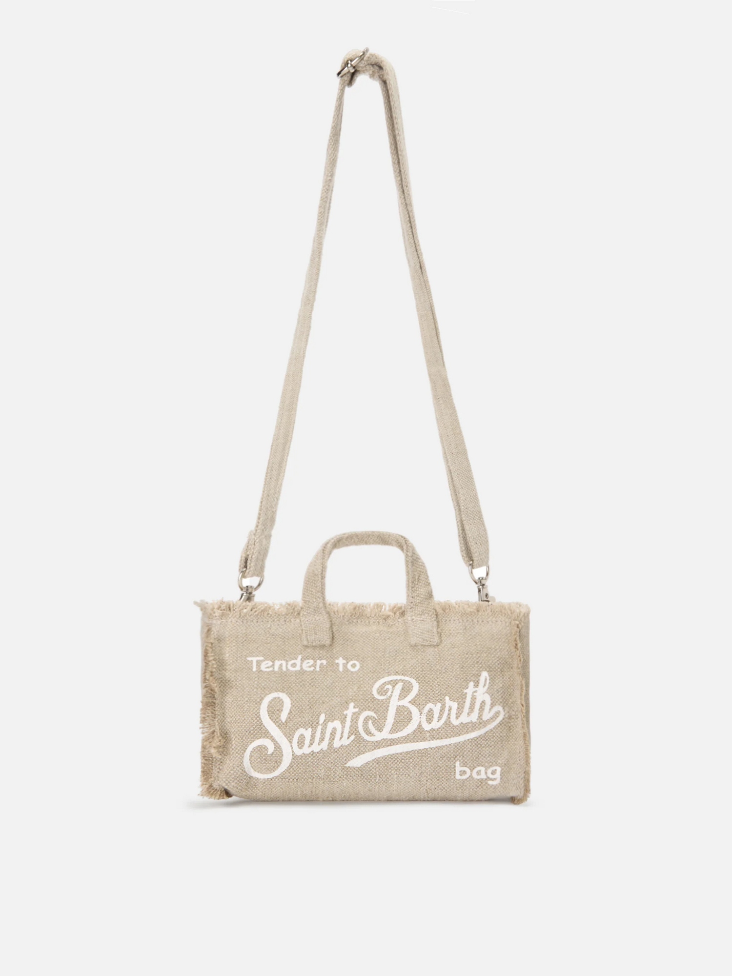 Borsa Phone con logo stampato a contrasto, frange laterali, chiusura con bottone metallico, doppi manici superiori e tracolla regolabile e removibile.