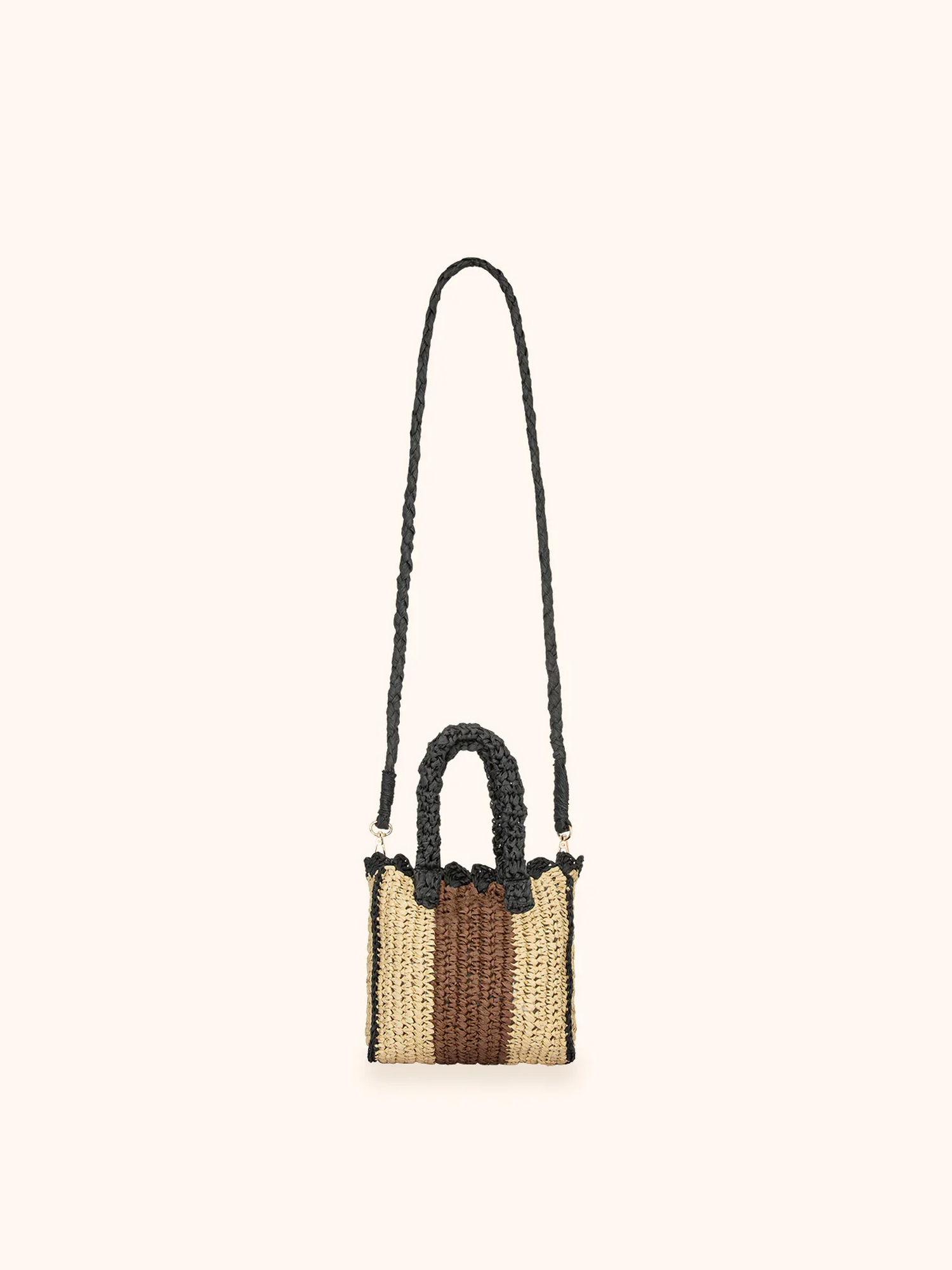 Mini Bag in rafia con chiusura con magnete e tracolla removibile.