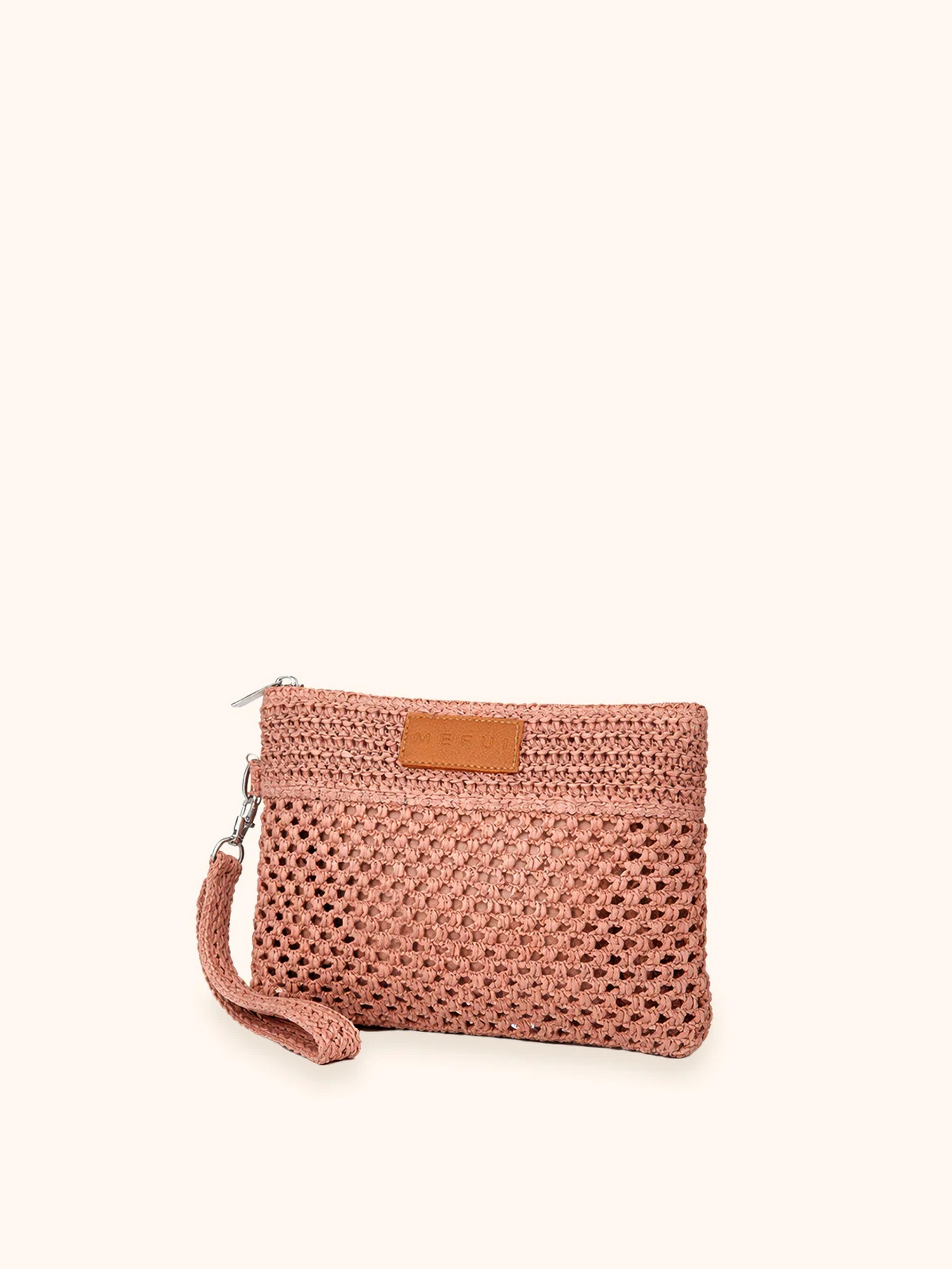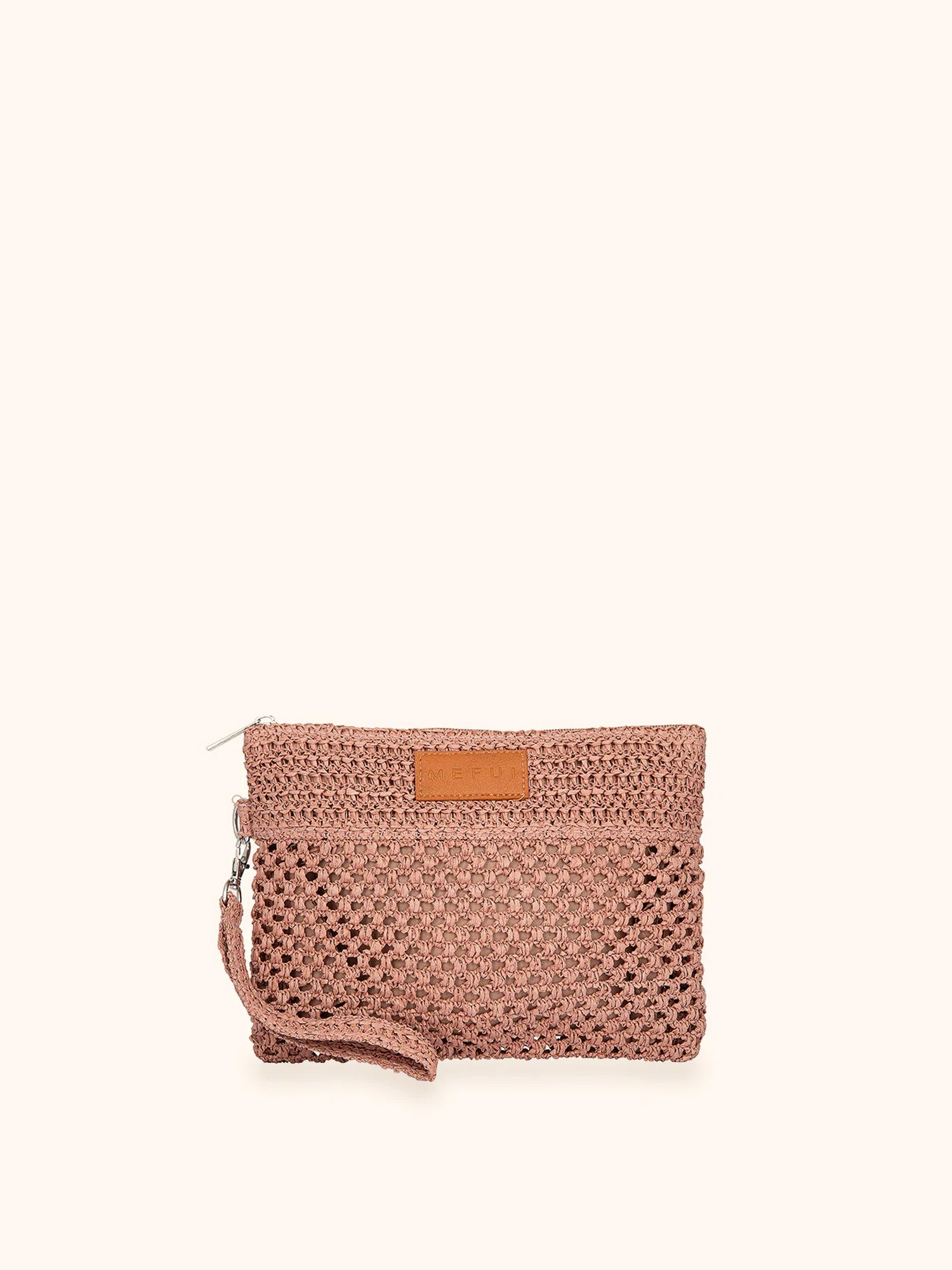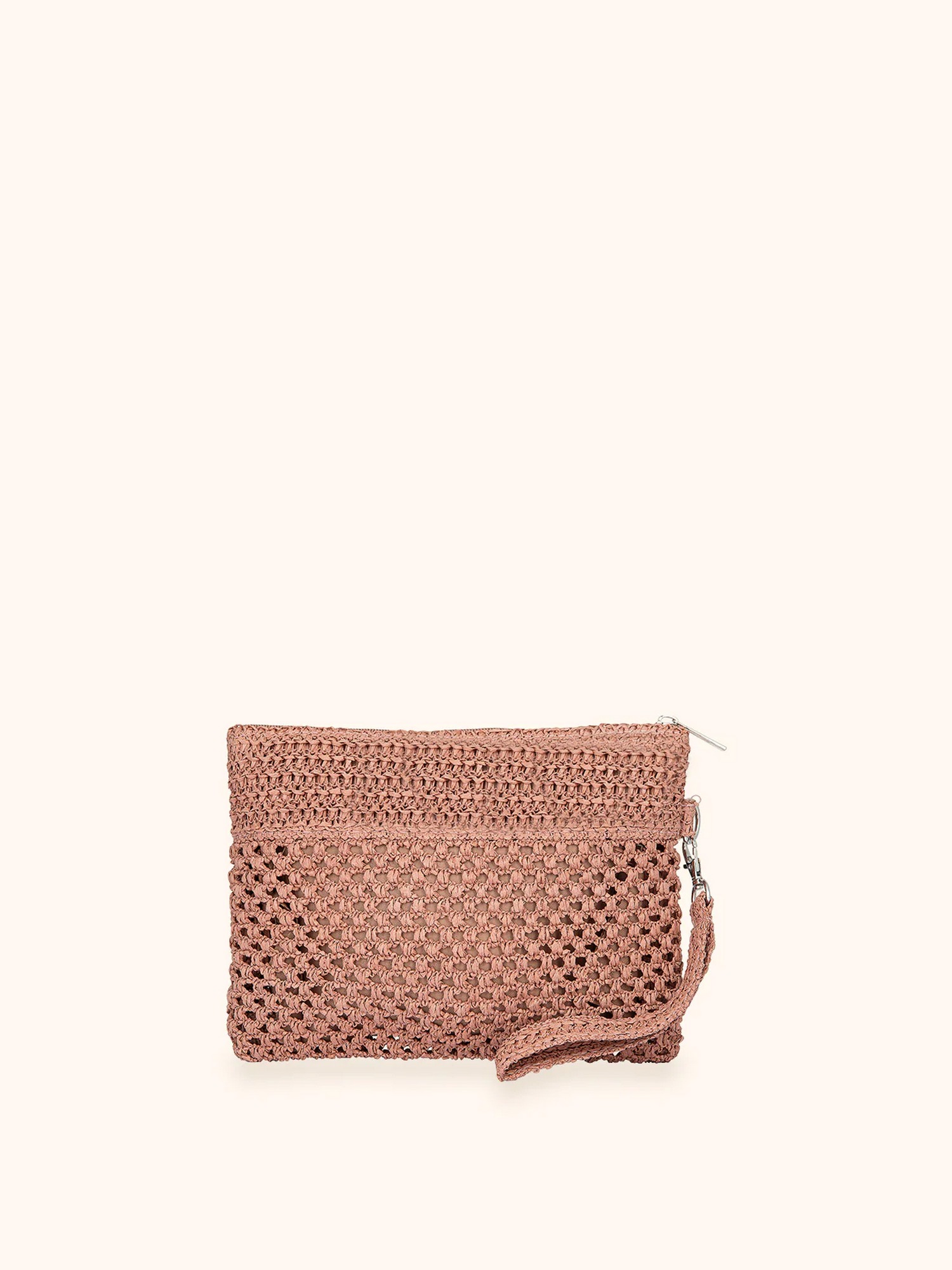 Pochette in rafia con chisura zip, fodera interna e laccetto laterale removibile.