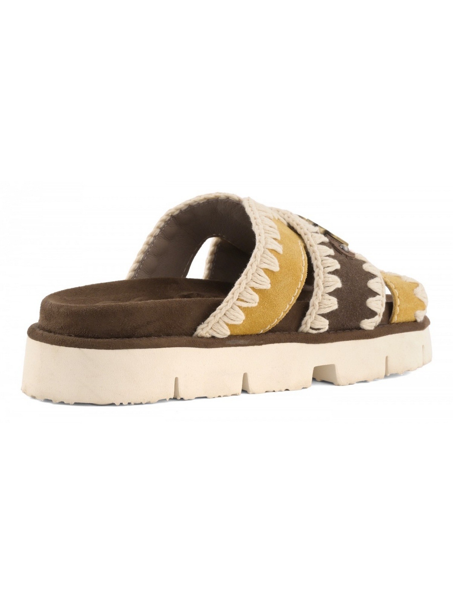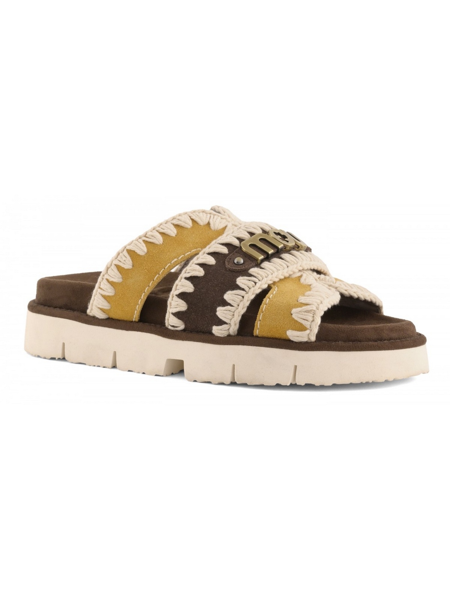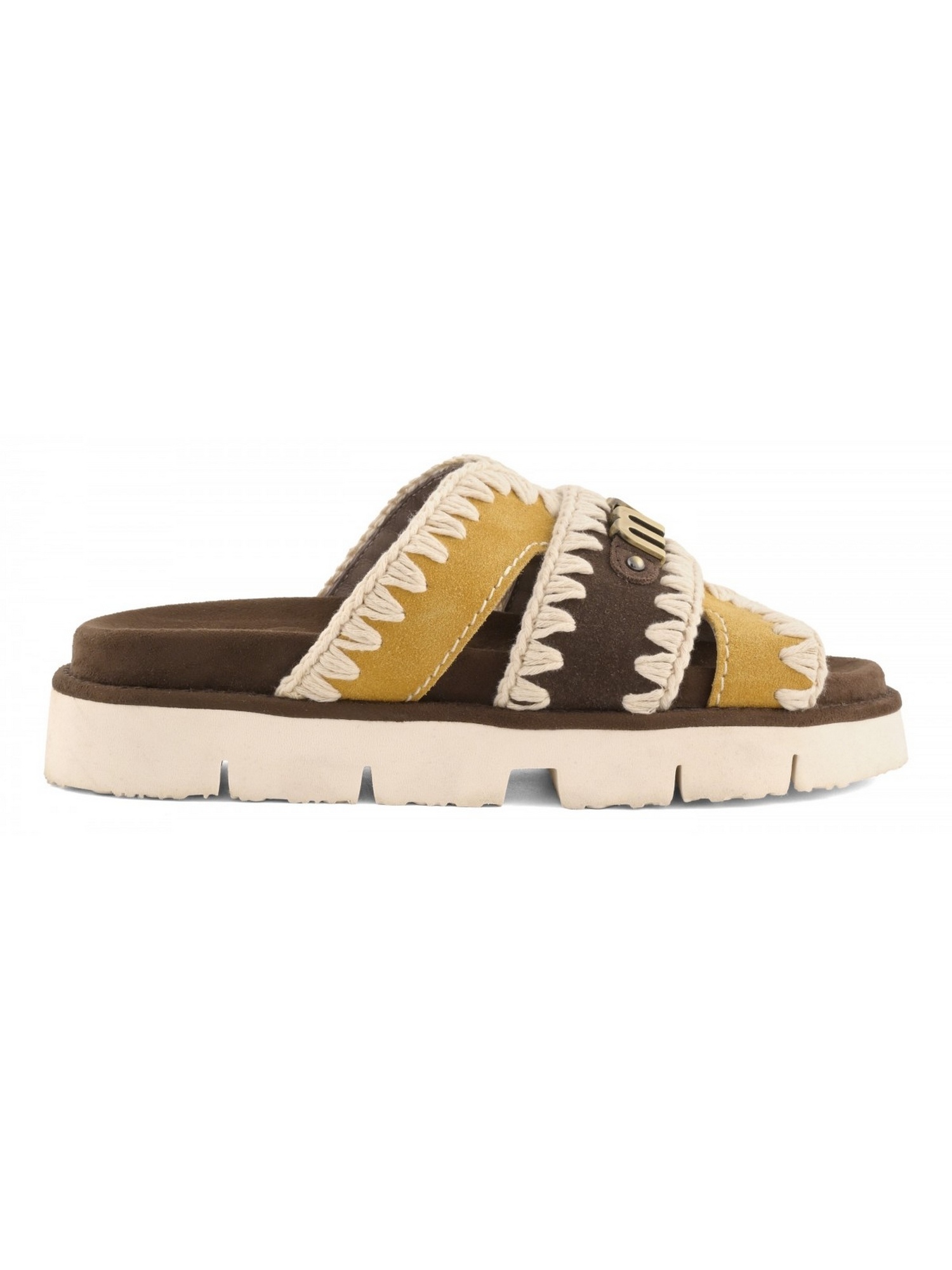 Sandalo con tre fasce frontali, logo in metallo, cucitura all'uncinetto e suola in EVA.
