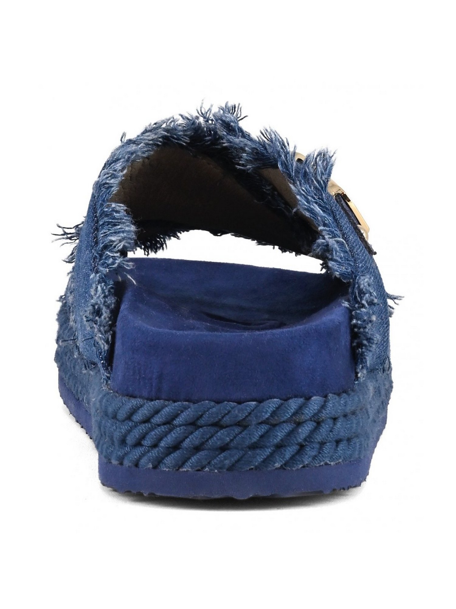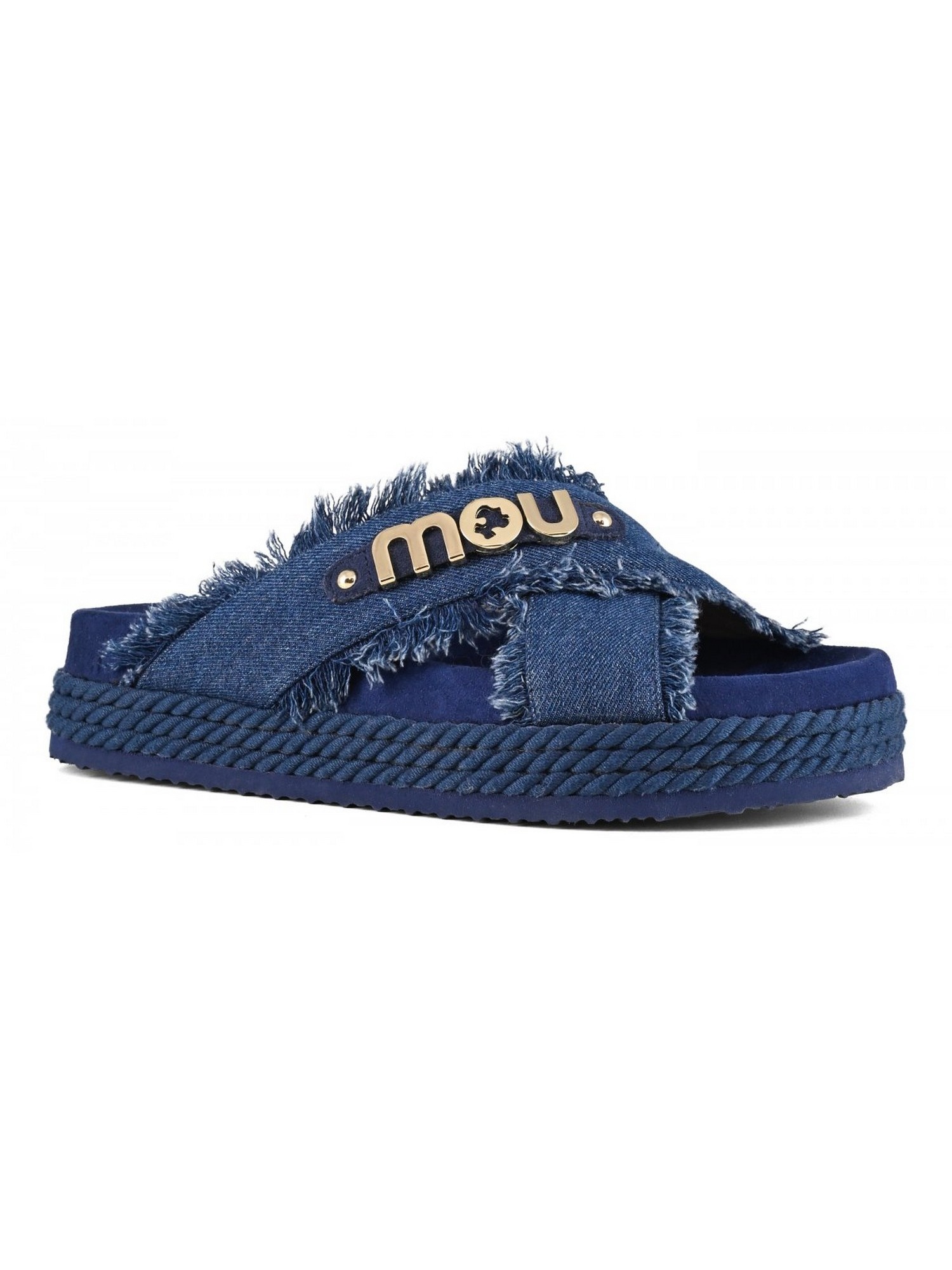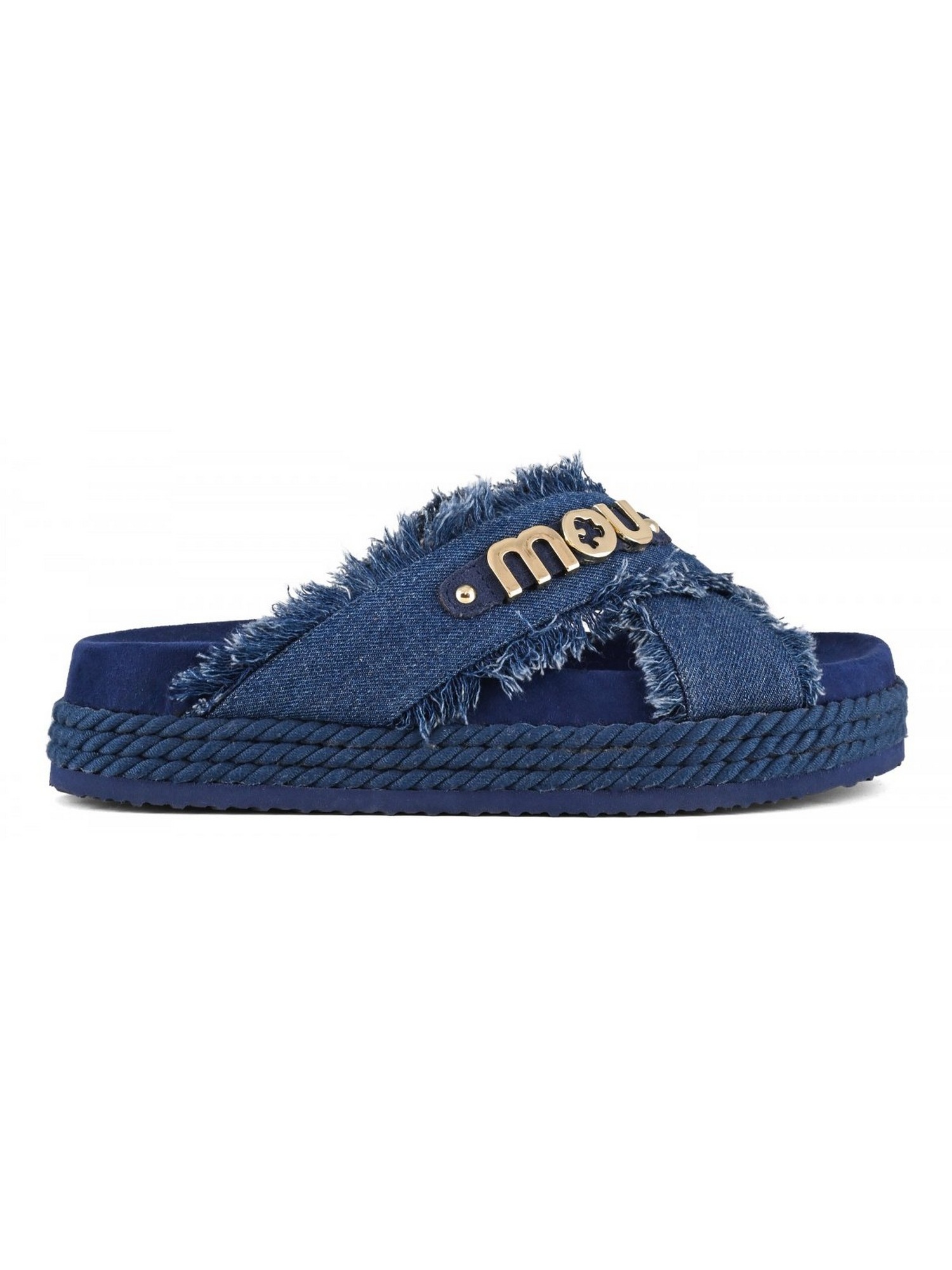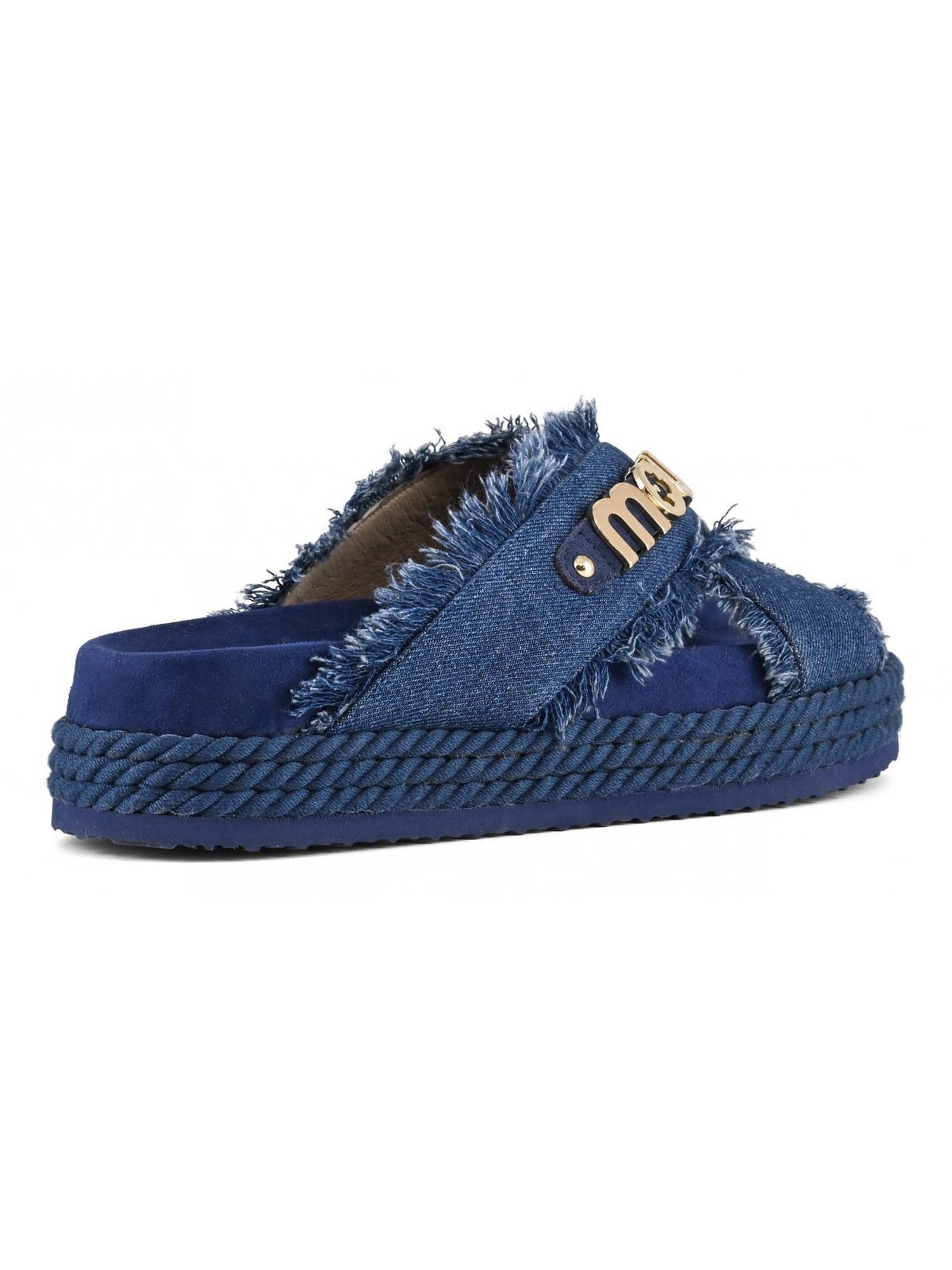 Sandalo incrociato in denim con maxi logo in metallo, suola esterna in EVA con dettagli in corda e plantare imbottito in microsuede.