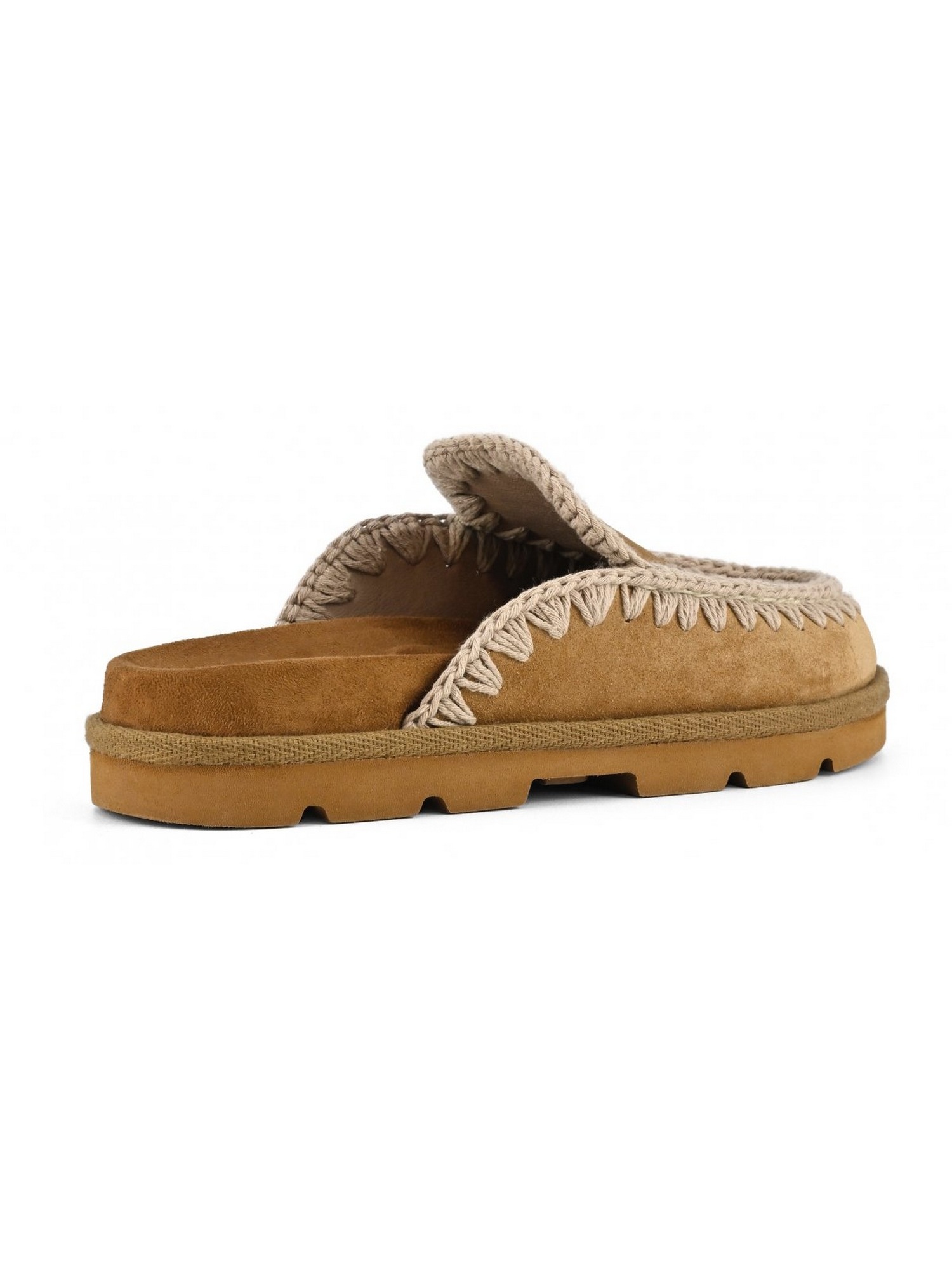 Sabot in pelle scamosciata con cucitura all'uncinetto, suola in EVA e gomma e plantare imbottito in microsuede.