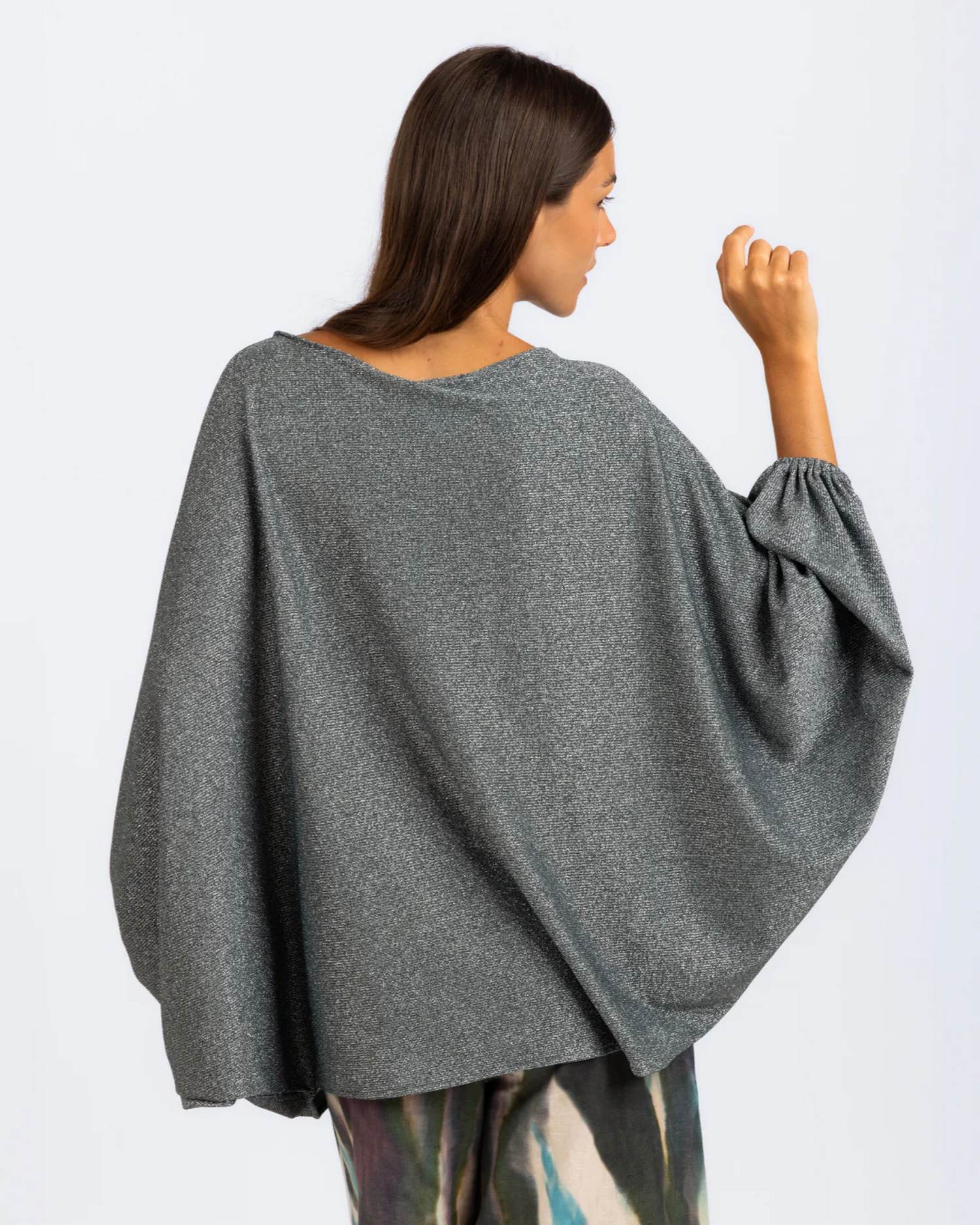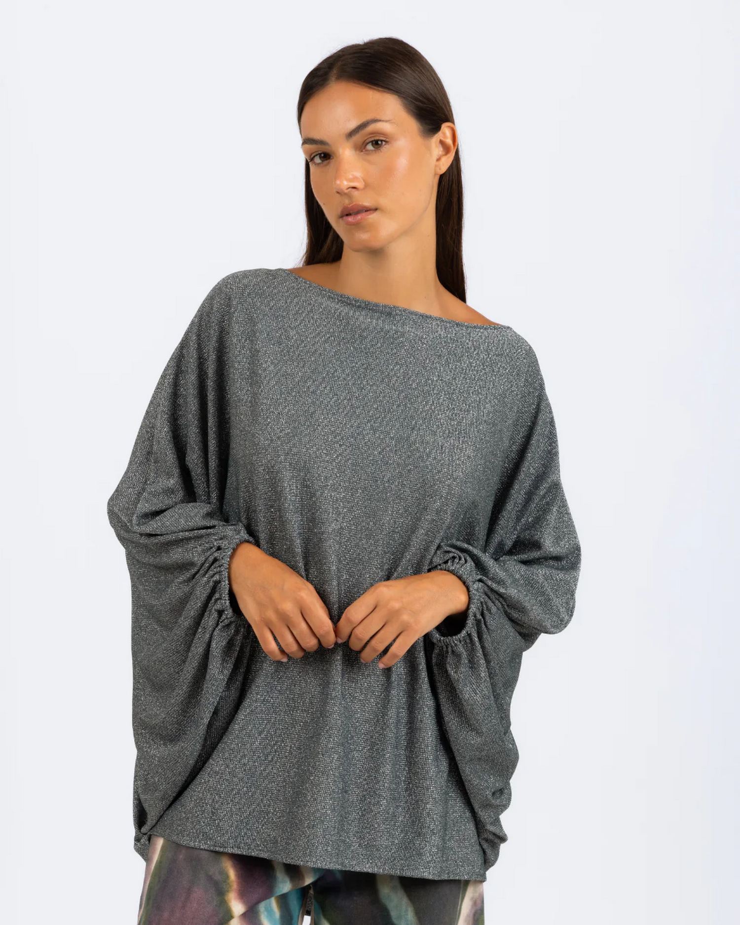 Casacca in maglina lurex con scollo a barca e ampia manica con polsino elastico.