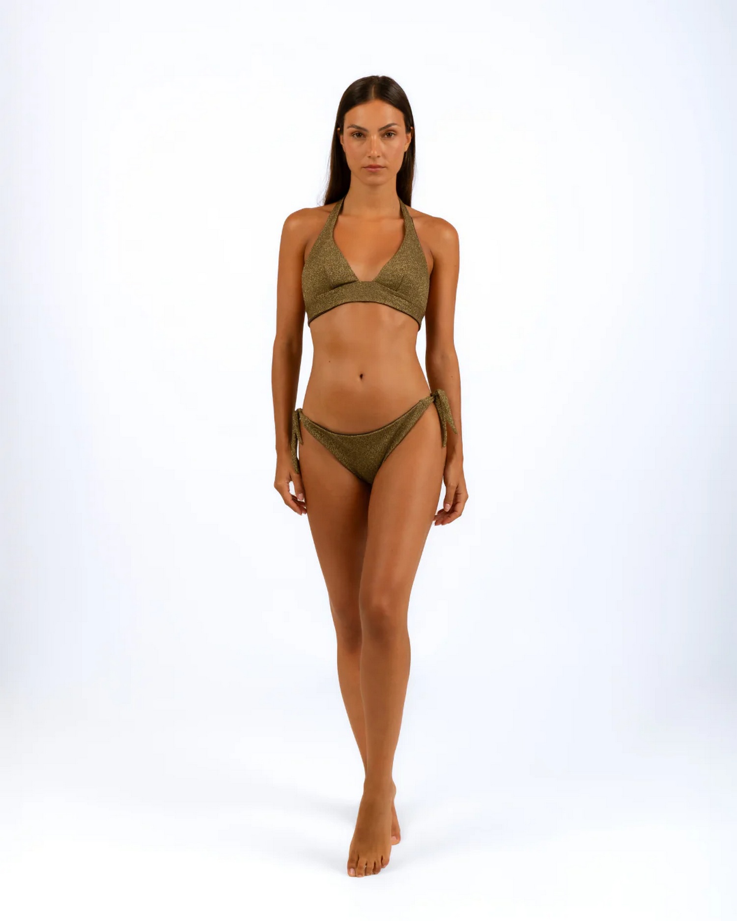 Costume in maglina lurex con triangolo fisso con spalline e torace regolabili, e slip regolabile con vestibilità regolare.