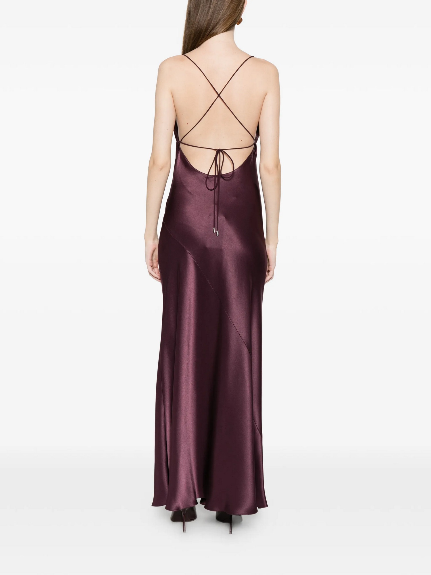 Abito lungo in satin double face dalla silhouette a sottoveste con spalline sottili, scollo frontale drappeggiato e ampio scollo tondo sul retro che lascia la schiena scoperta, attraversata solo da due nastrini da annodare al centro.