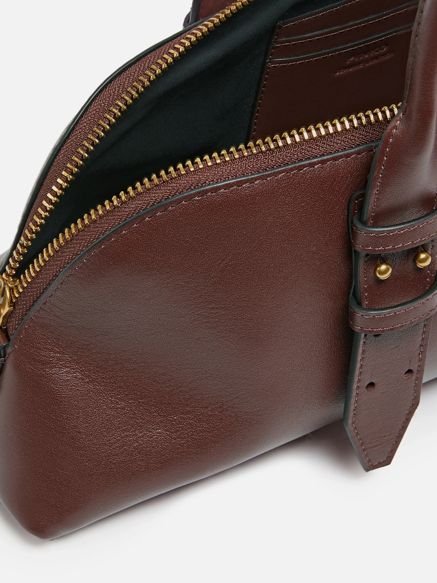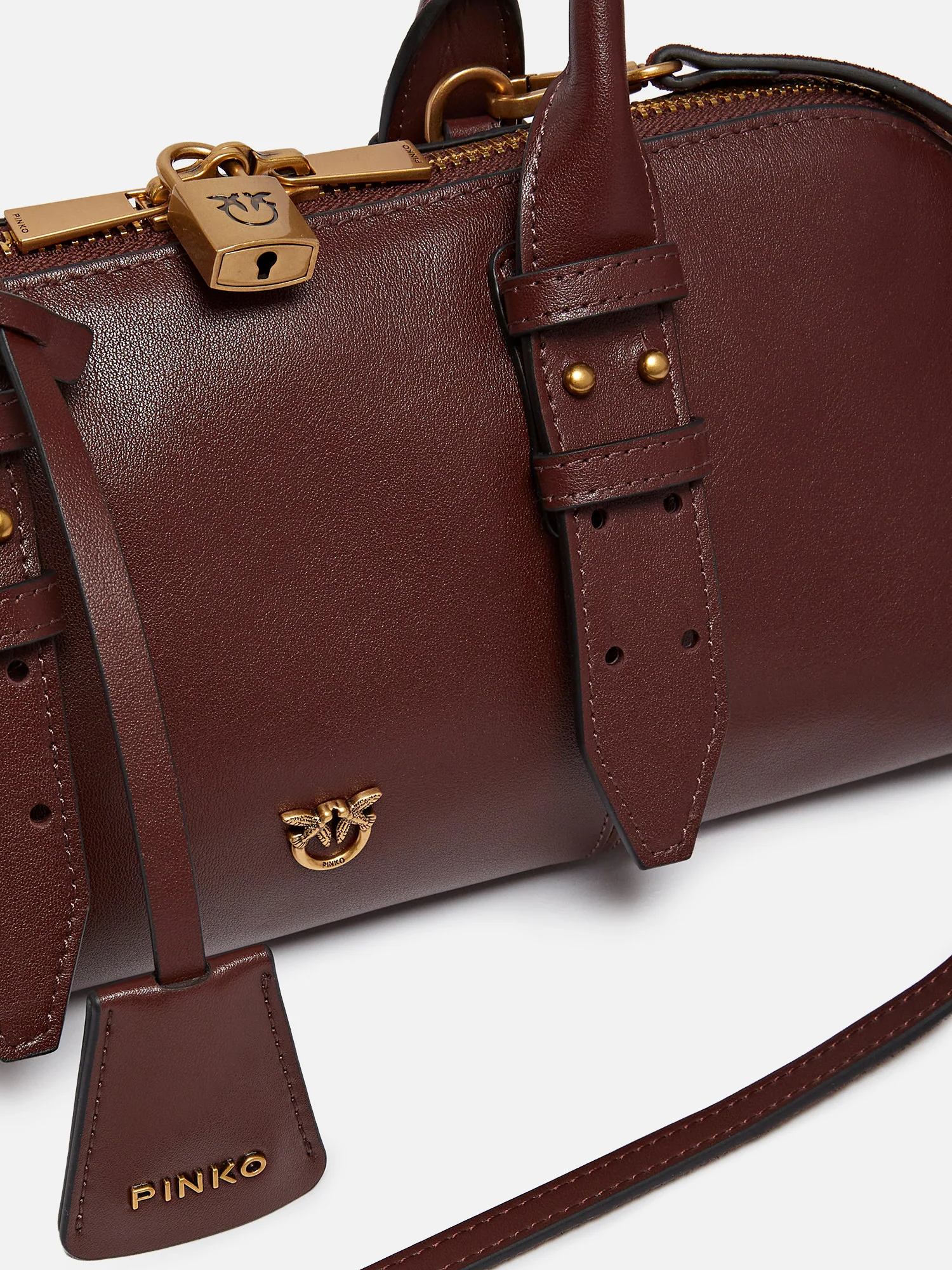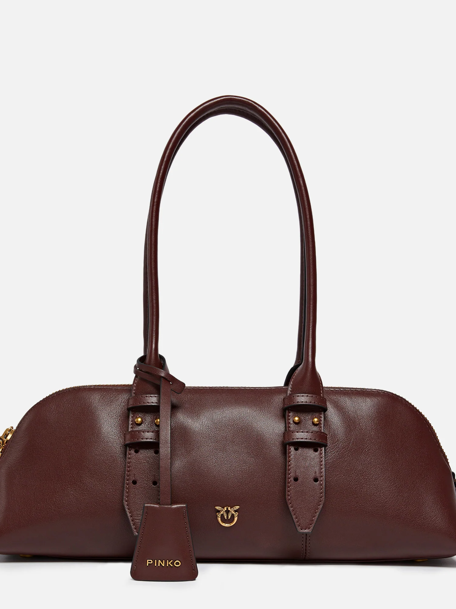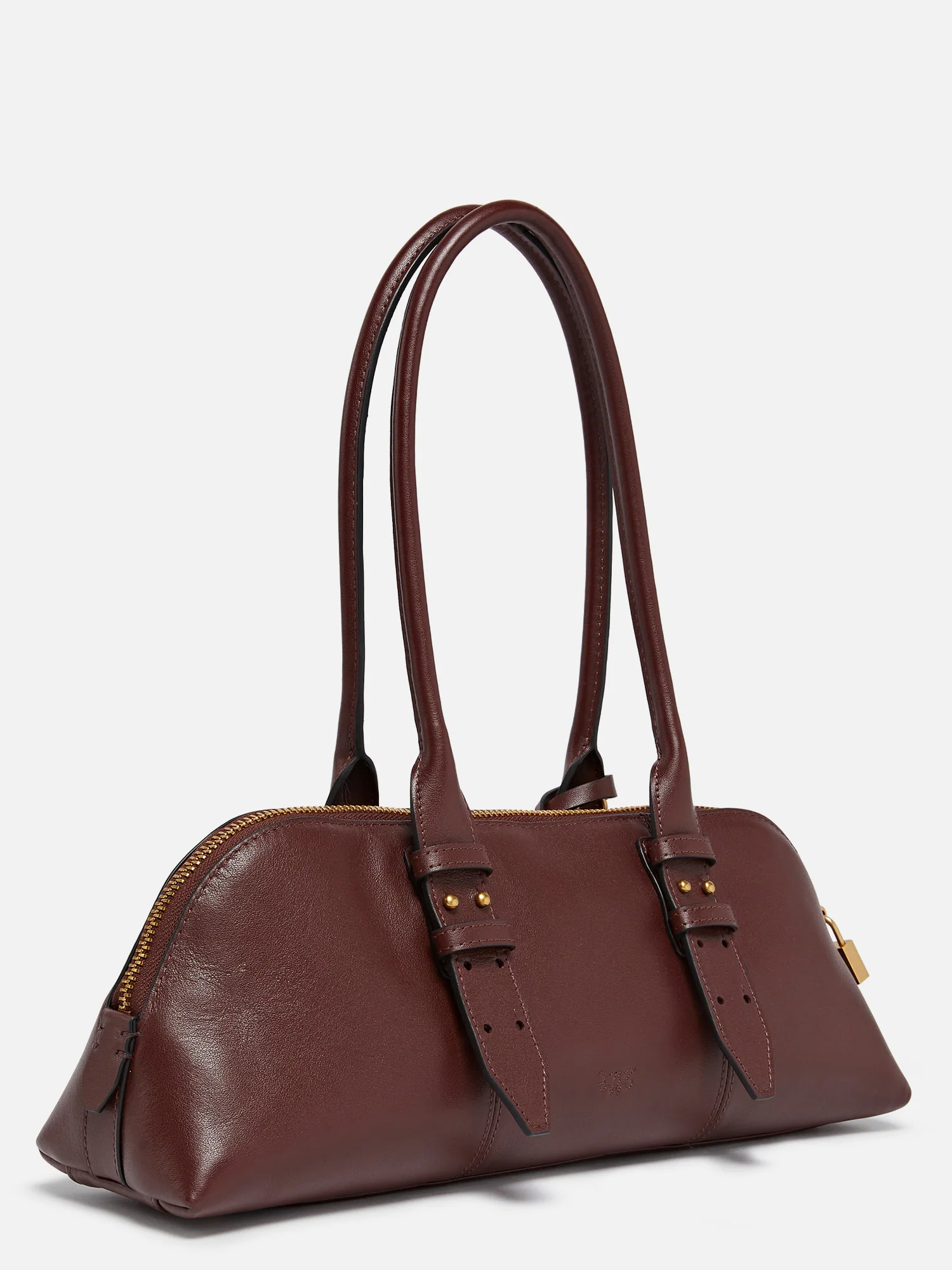 Borsa bowling in pelle, lunghi manici superiori, tracolla regolabile e rimovibile in pelle, chiusura superiore con zip a doppio cursore con dettaglio lucchetto decorato da logo.