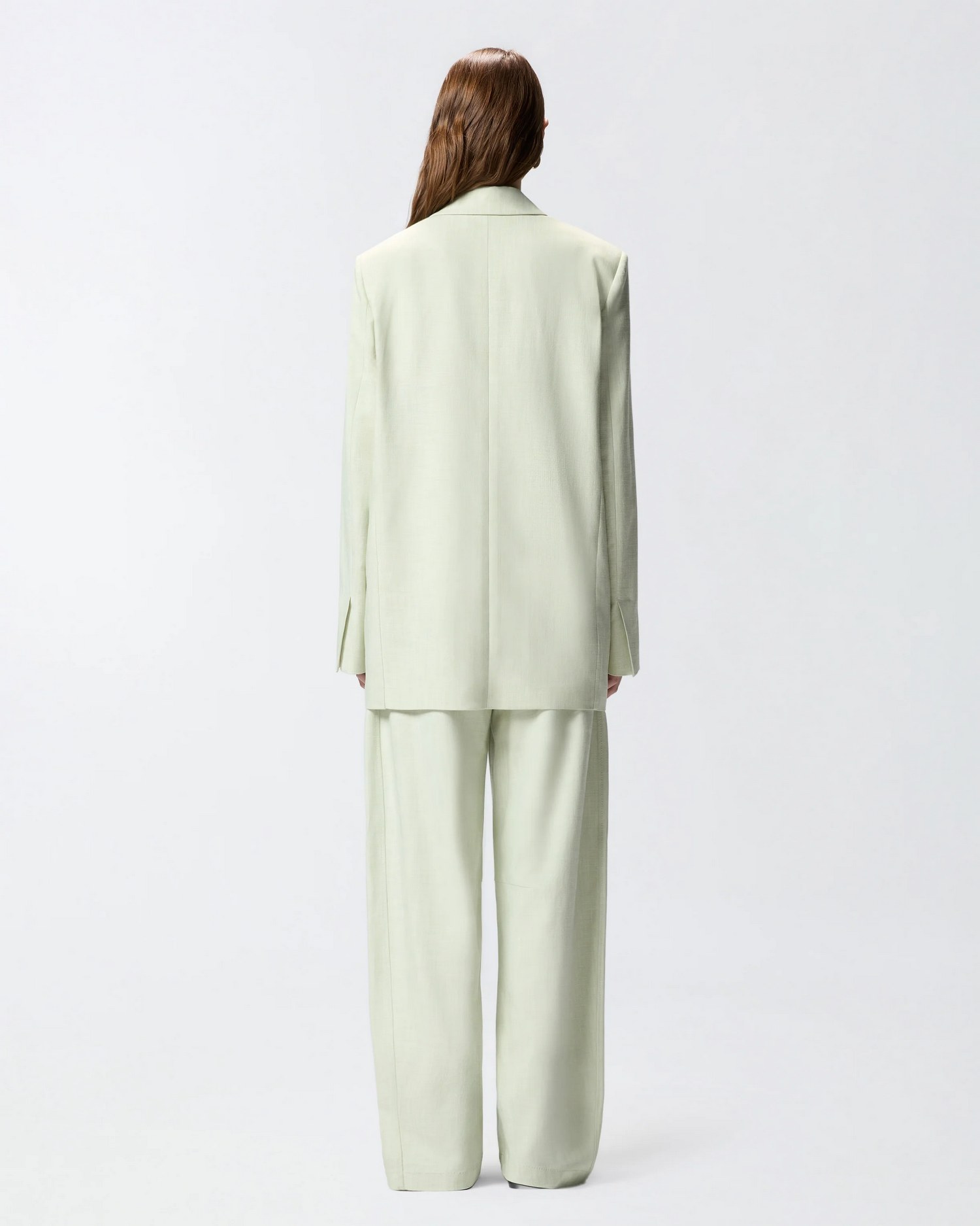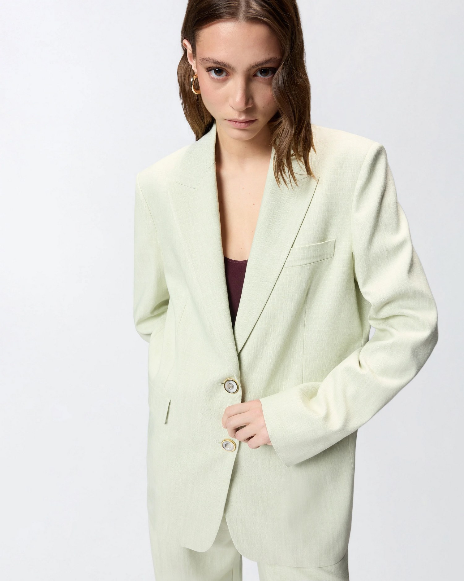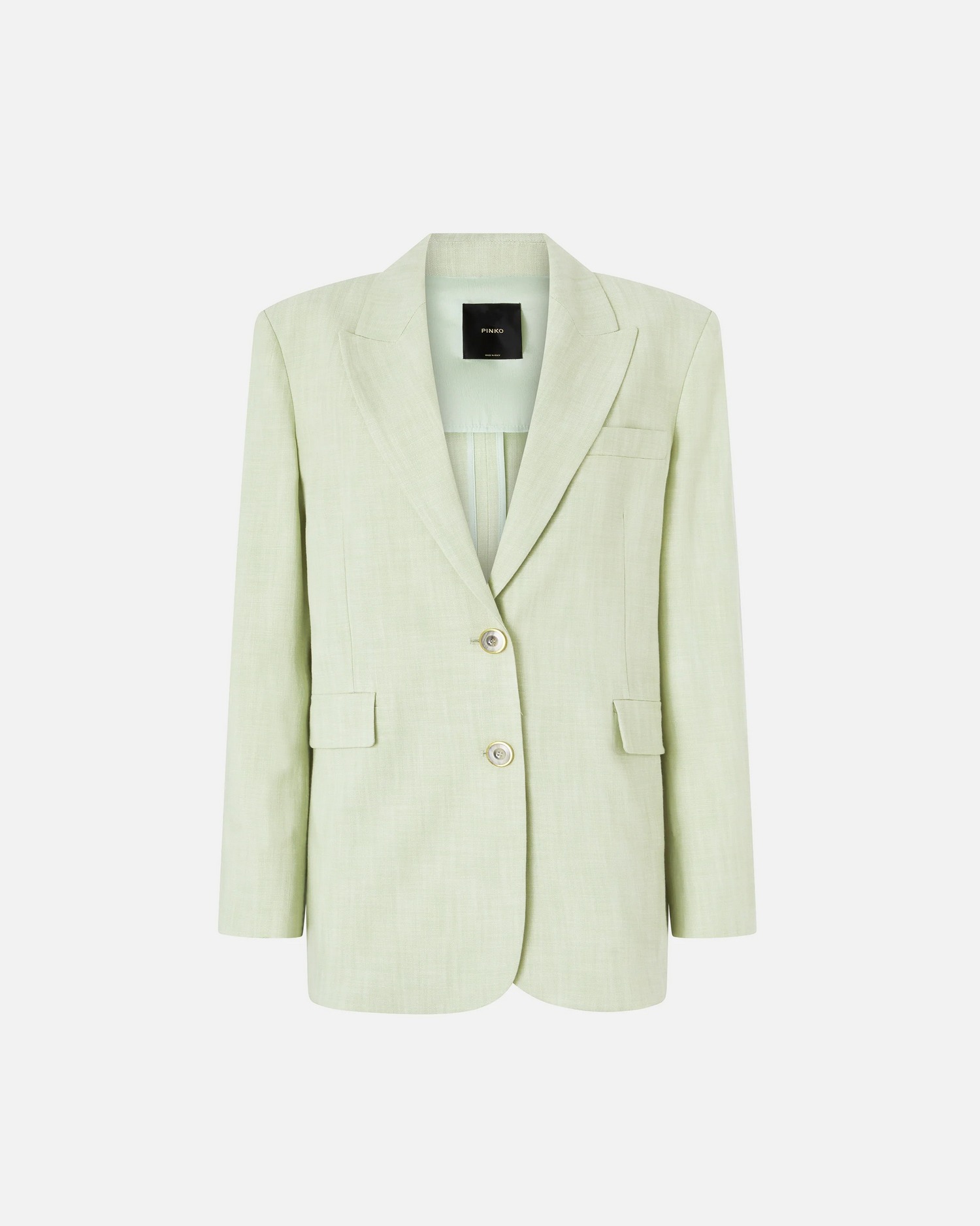 Giacca foderata in tessuto stretch panama con revers a lancia, due tasche frontali con patta, un taschino a filetto sul petto, spacchetti ai polsi e chiusura monopetto a due bottoni.
