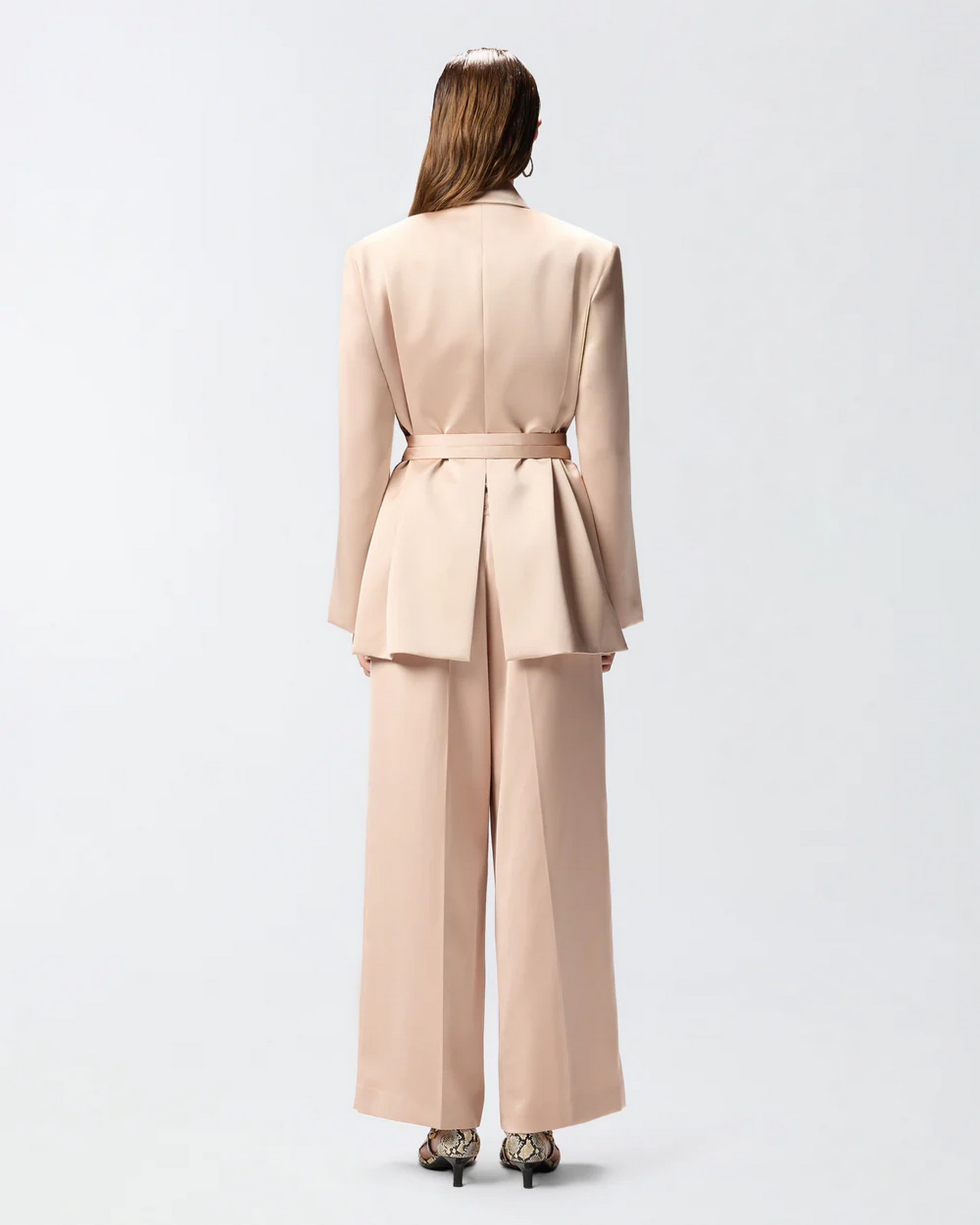 Giacca in satin double face con revers classici, spacchi sul retro e sulle maniche, due tasche a doppio filetto sul davanti, una tasca a filettone sul petto e doppia cintura sottile da annodare in vita.