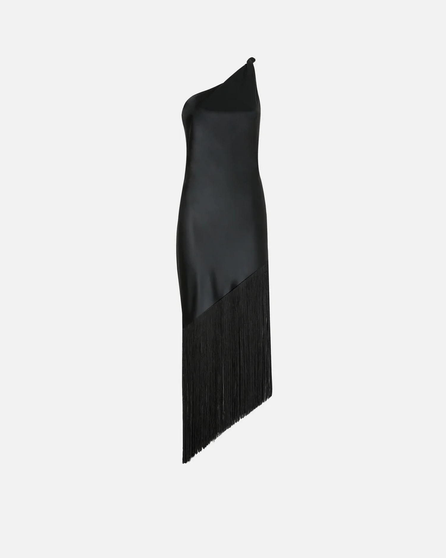 Abito in satin corto con fondo asimmetrico, monospalla senza maniche e con una spallina drappeggiata, arricchito da lunghe e fitte frange sul fondo.