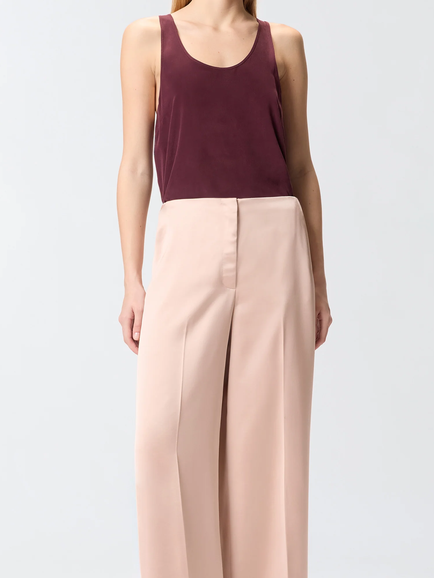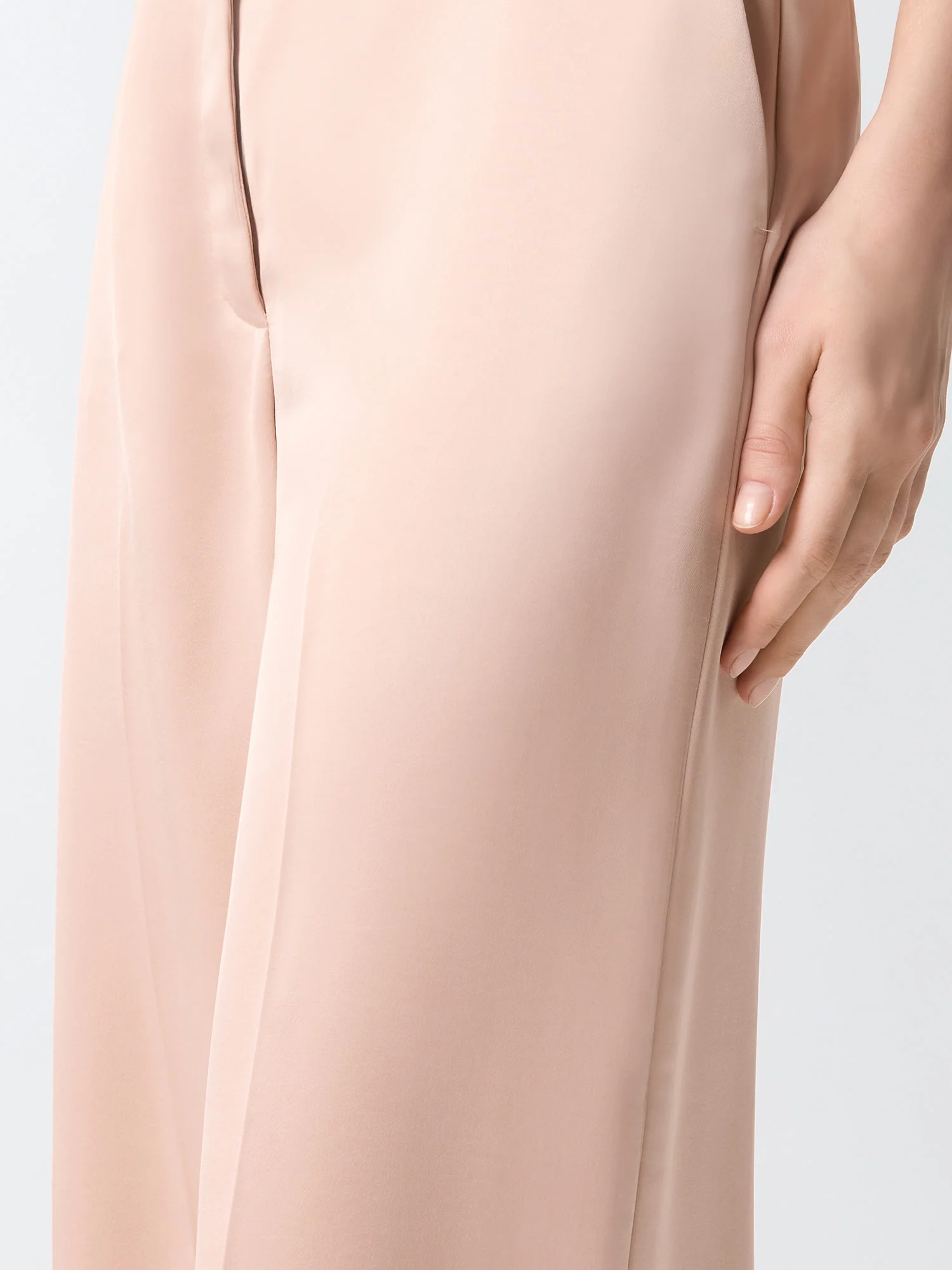 Pantaloni in satin double face, chiusura con zip e gancio nascosti, due tasche laterali, due tasche posteriori a filetto e piega stirata.