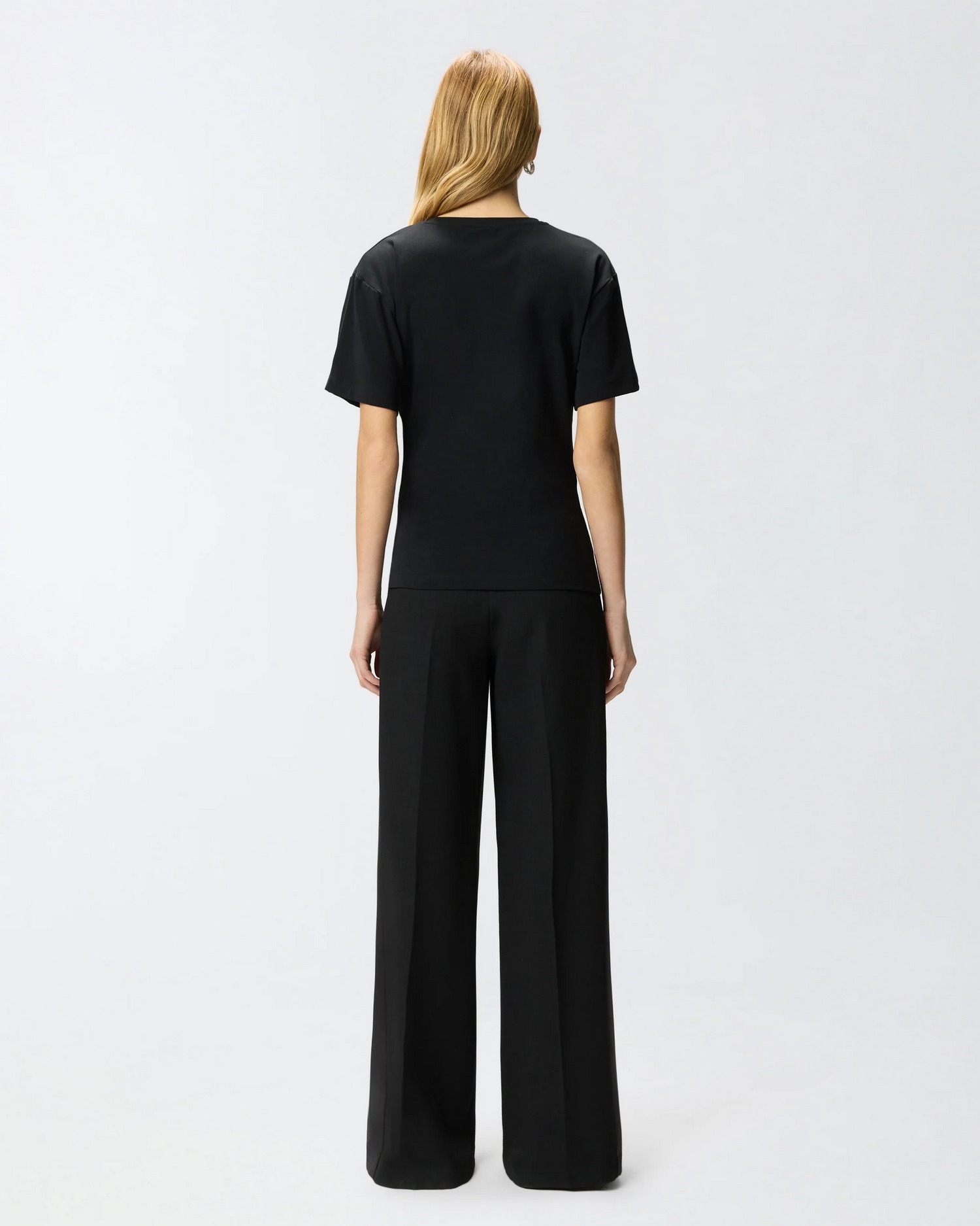 T-shirt girocollo a maniche corte in interlock stretch di cotone con applicazione dorata in corrispondenza della vita che crea un drappeggio sul davanti.