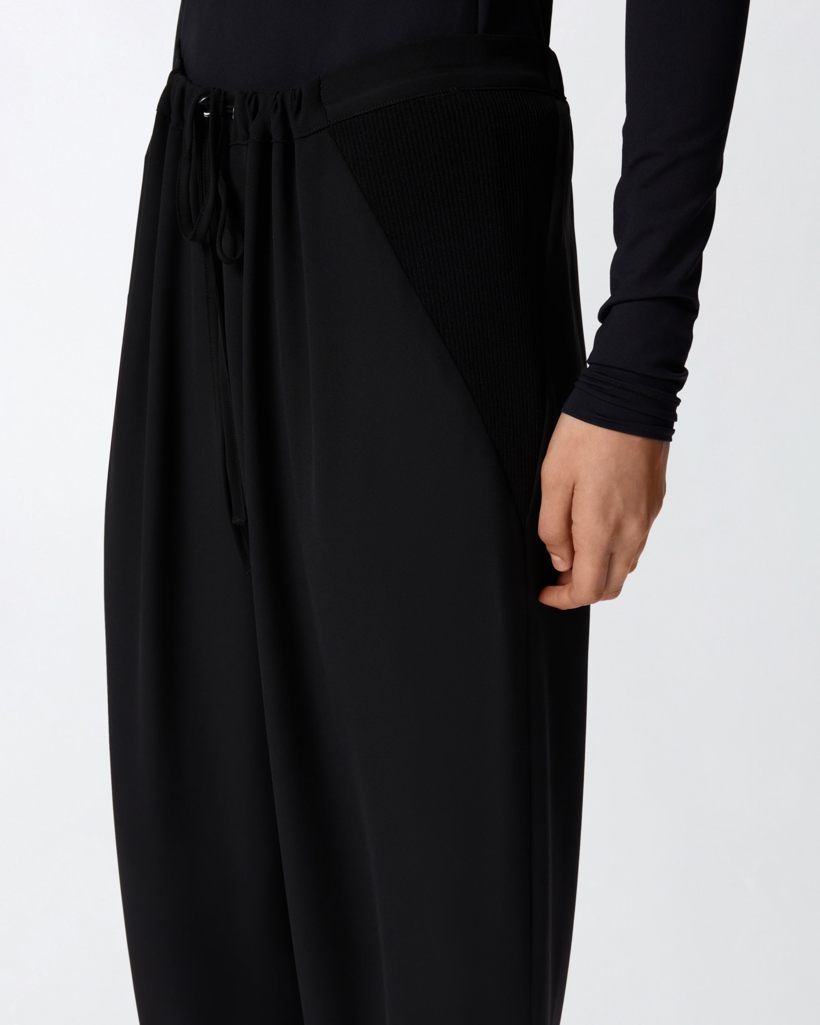 Pantaloni con gamba ampia e inserti frontali a contrasto sotto la vita, completati da vita con elastico e coulisse inserita da annodare.