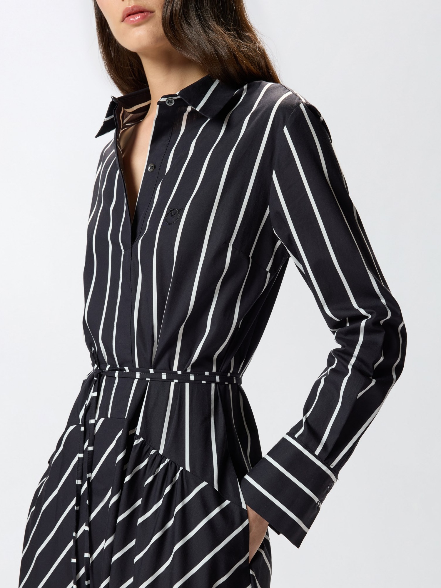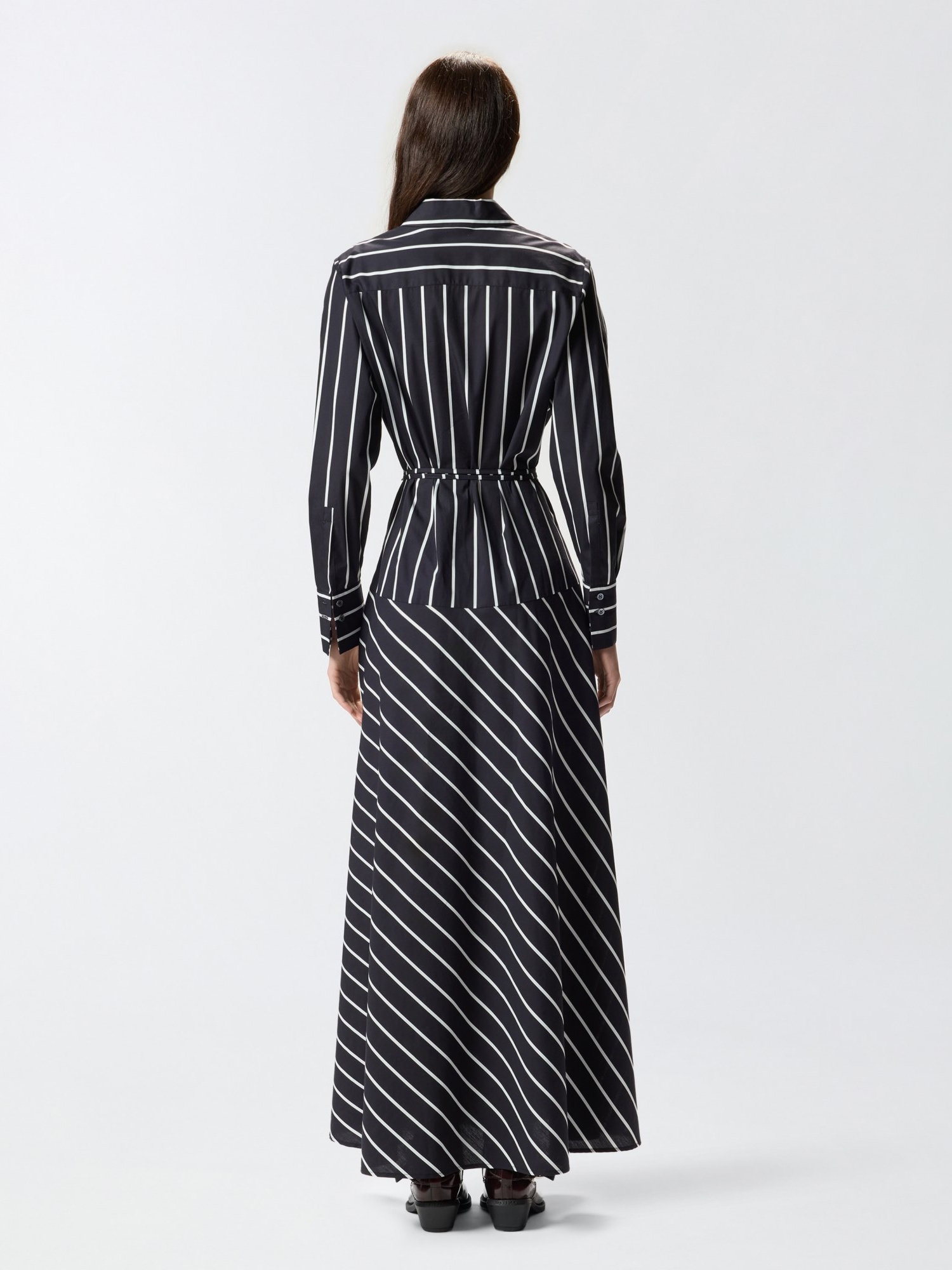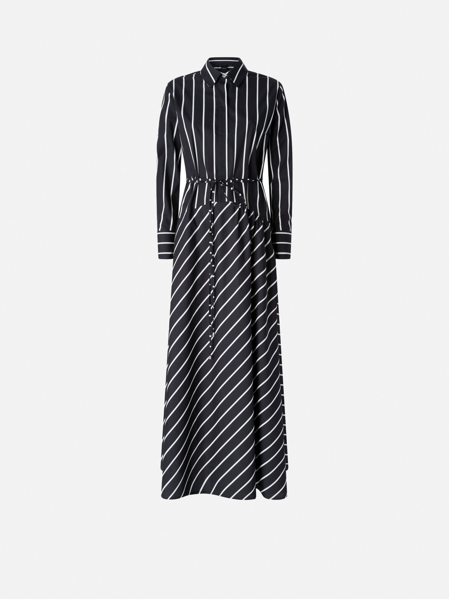 Abito chemisier lungo e sfiancato con colletto a camicia, maniche lunghe terminate da polsino con bottoni e carré posteriore.