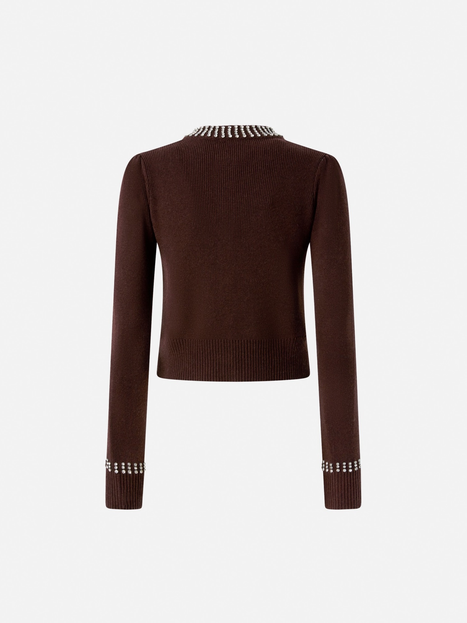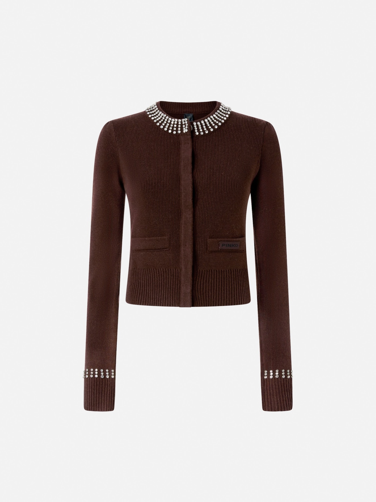 Cardigan girocollo a maniche lunghe, chiusura del capo nascosta, orlo e polsini lavorati a coste. Sul davanti spiccano due tasche, una delle quali presenta l'iconica etichetta tono su tono con logo lettering PINKO, girocollo e polsini con applicazioni di strass che impreziosiscono il design.