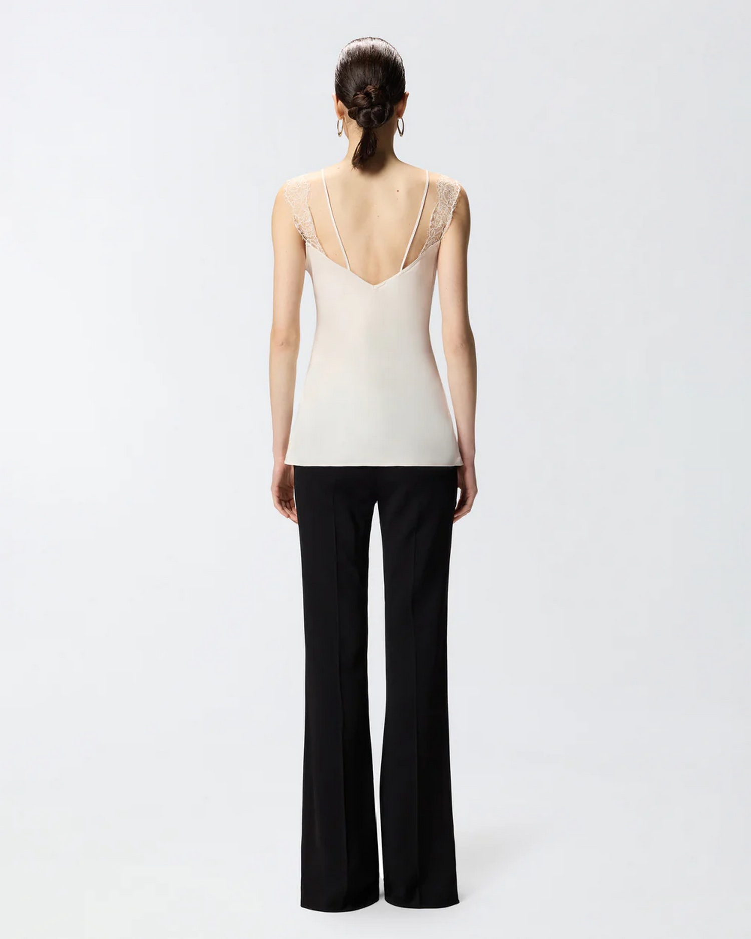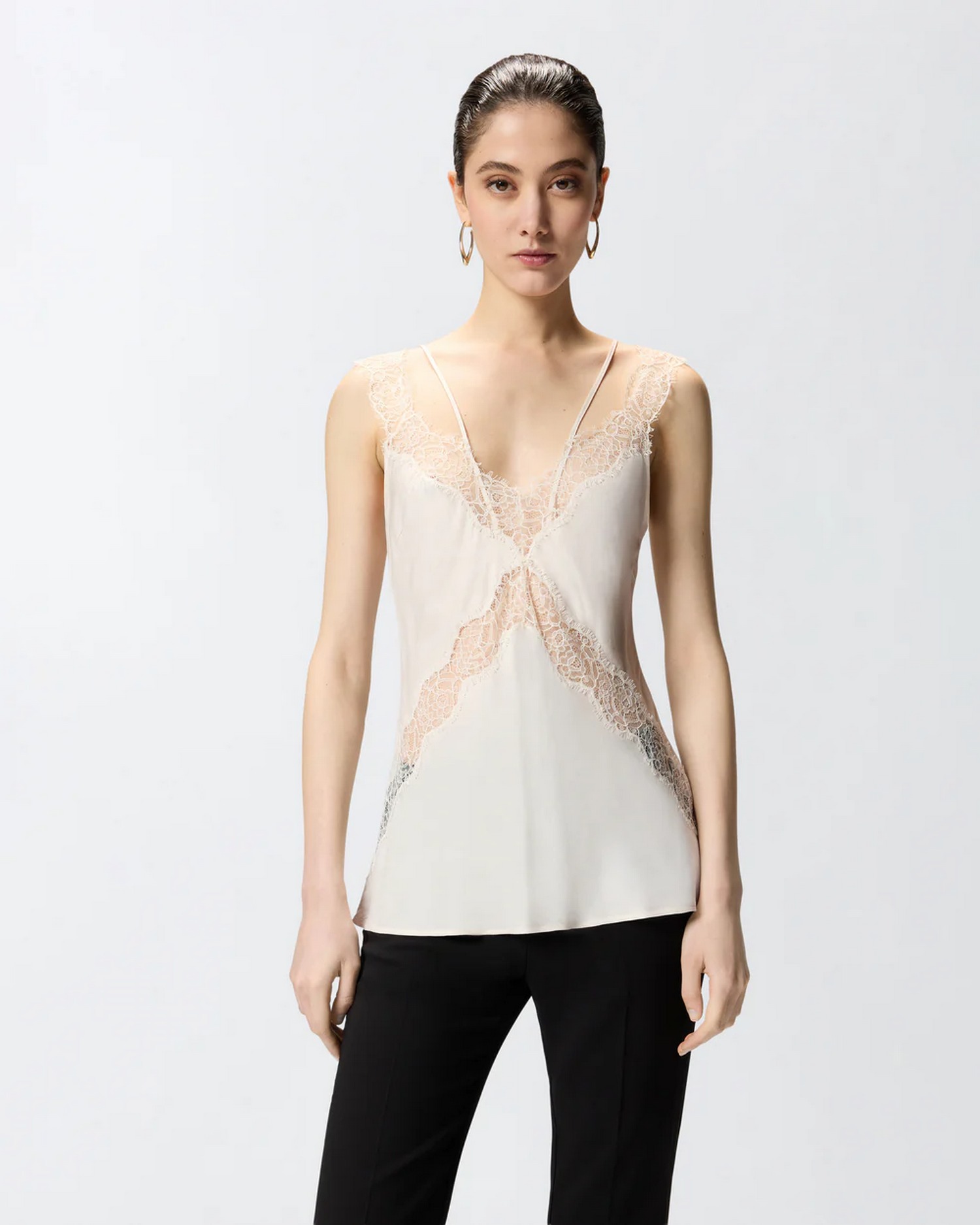 Top smanicato in stile lingerie con sottili spalline, bande in pizzo intarsiato sul davanti, lungo lo scollo a V e in corrispondenza delle spalline più spesse.