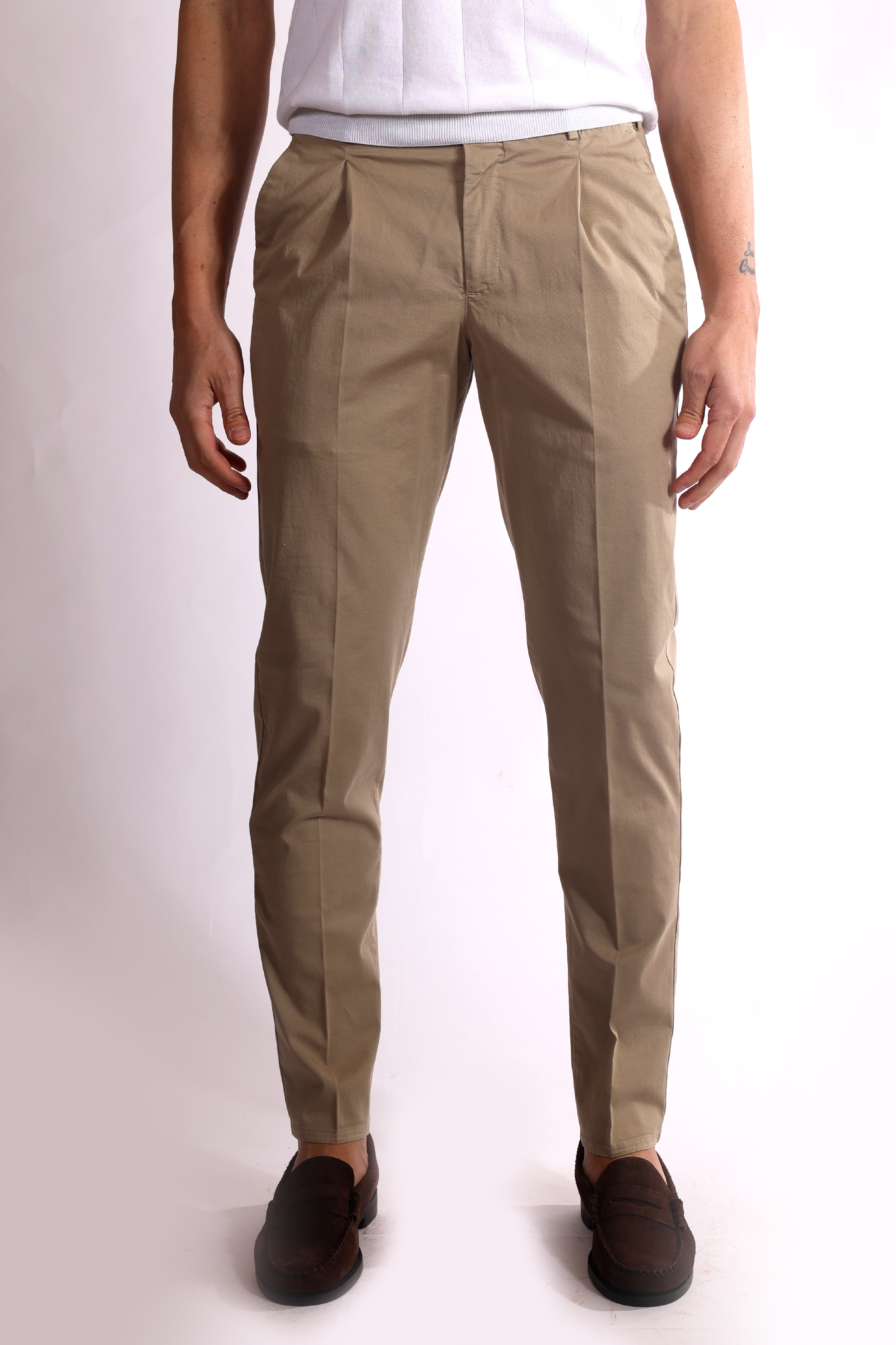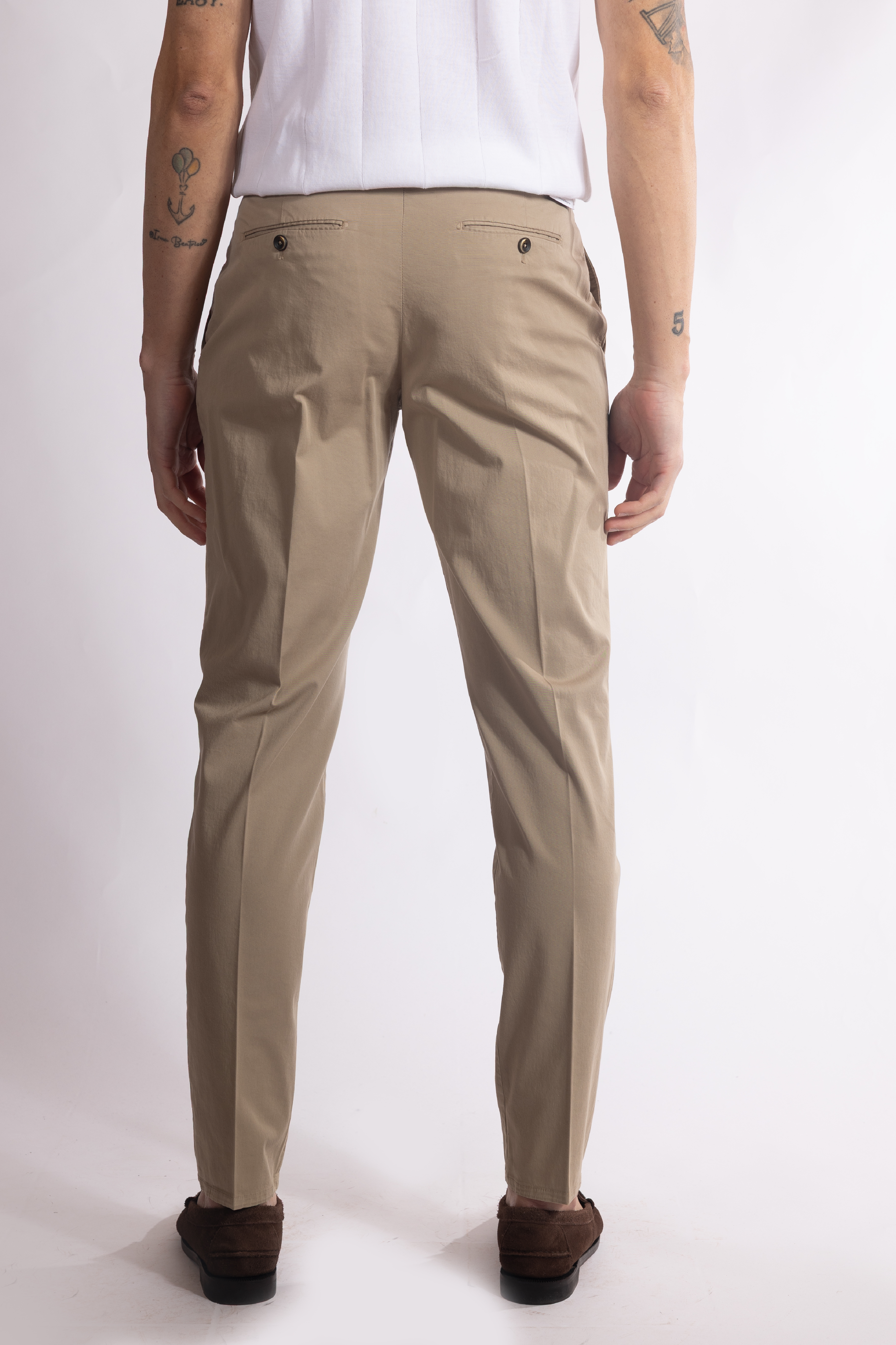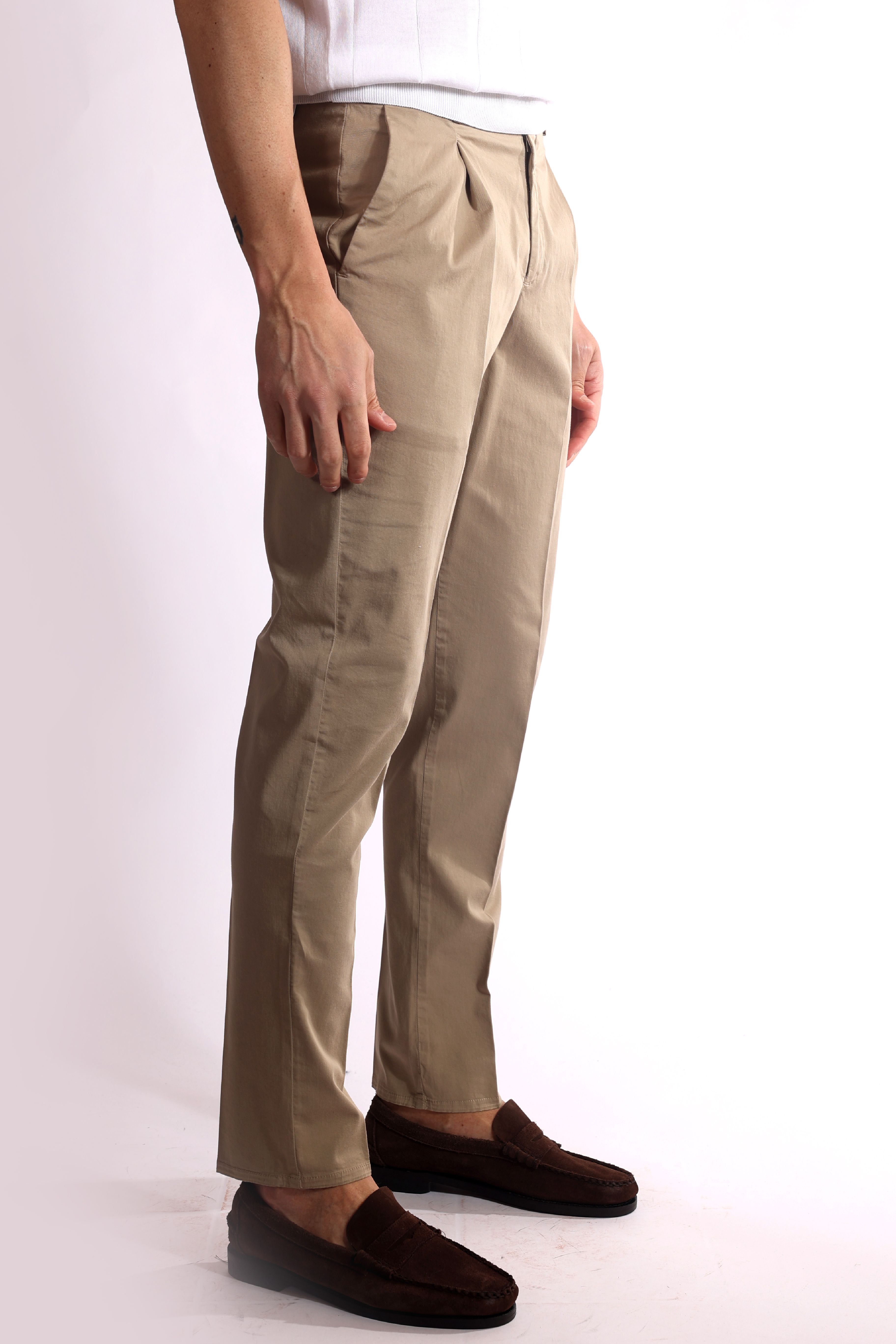 Pantalone con piega stirata, pinces frontali, tasche laterali a filo e tasche posteriori a filetto.